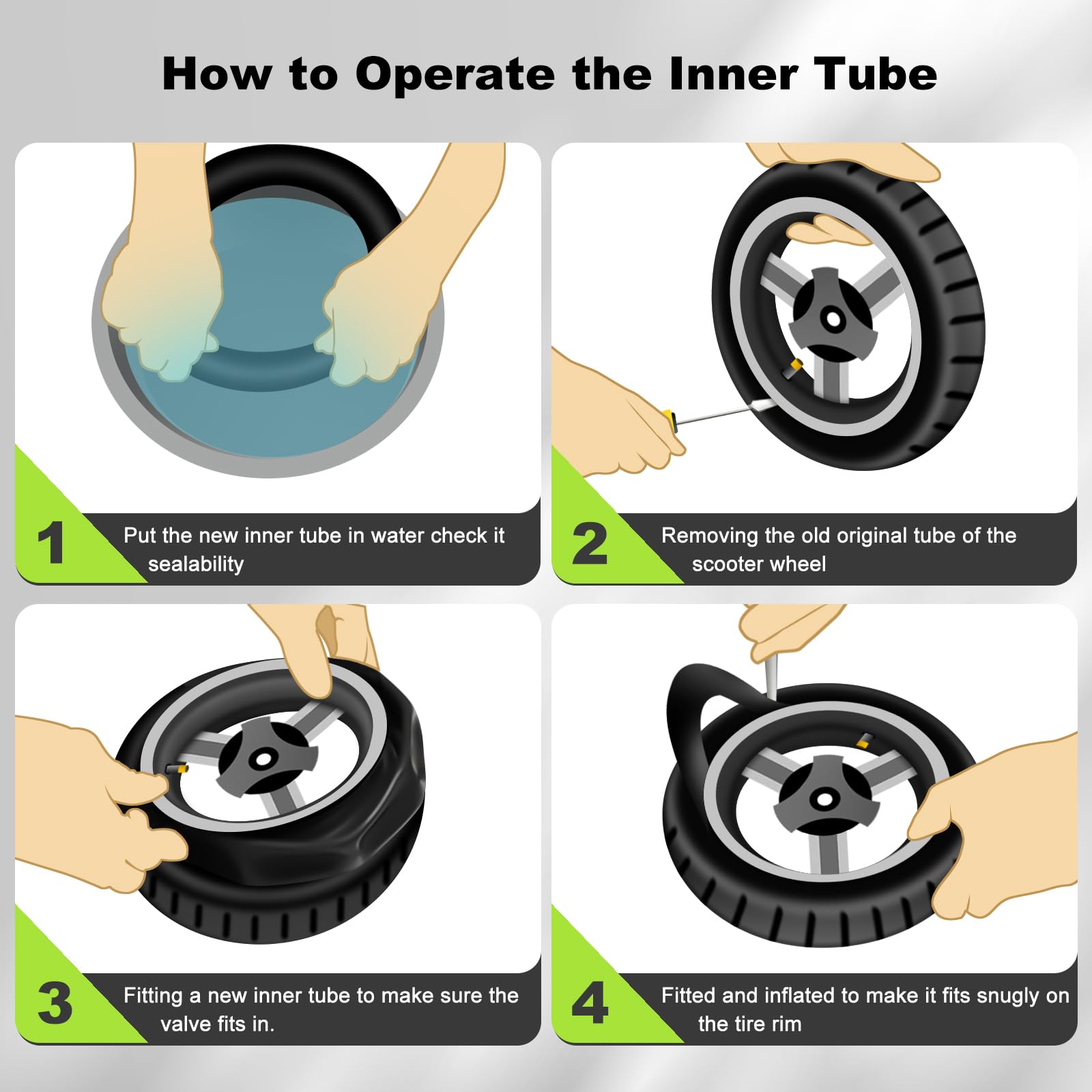【Installation & Note】- 2pcs * 10x2.50 Tube & 2pcs * Small Tire Mounting Irons. Easier to install with the help of mounting irons. 1. Please check before installation if the new tube is completely sealed by placing it in water. If bubbles appear frequently, it means it is damaged, please contact us for replacement. 2. Do not mount the tire with a sharp stick. 3. Do not overinflate a non-sealed tube."