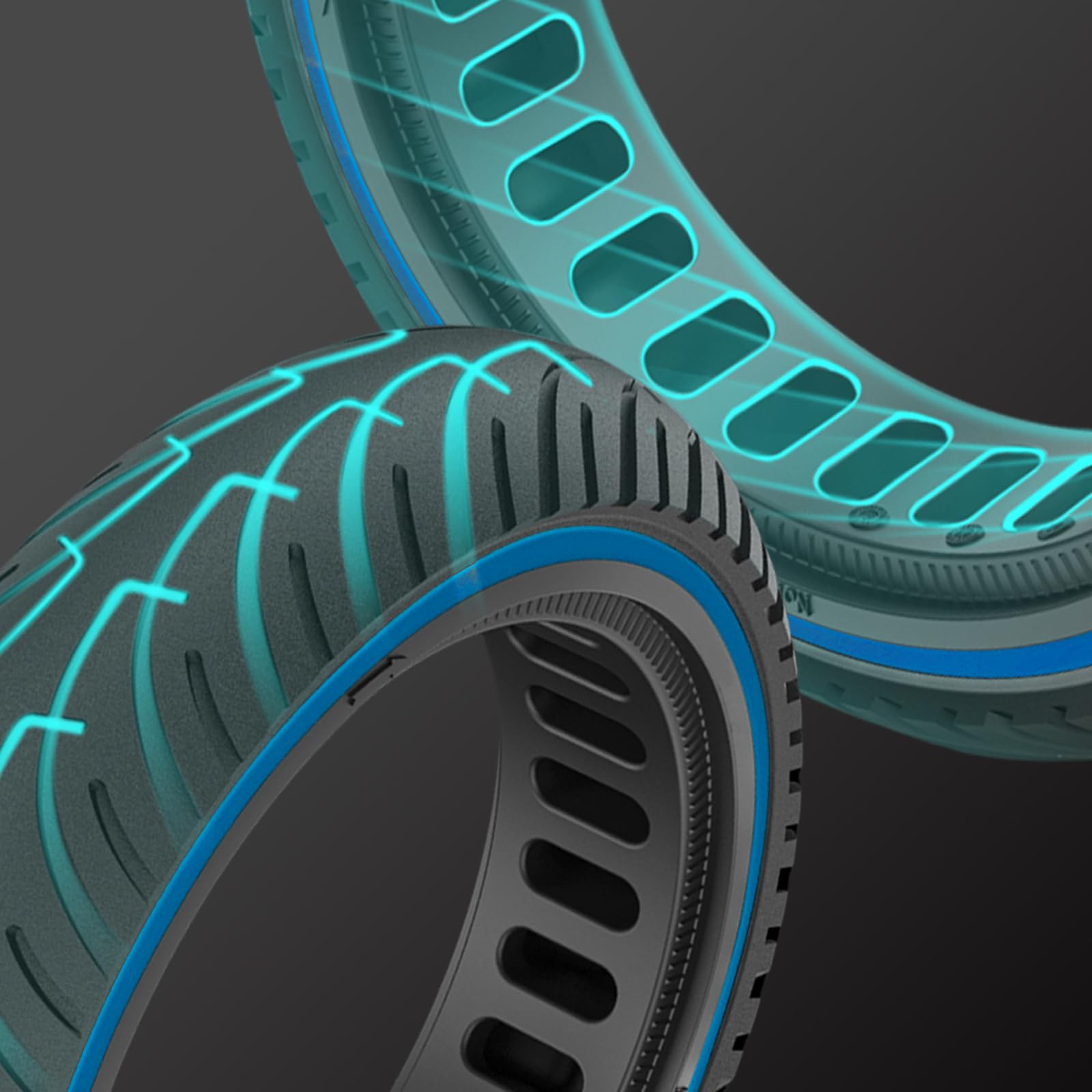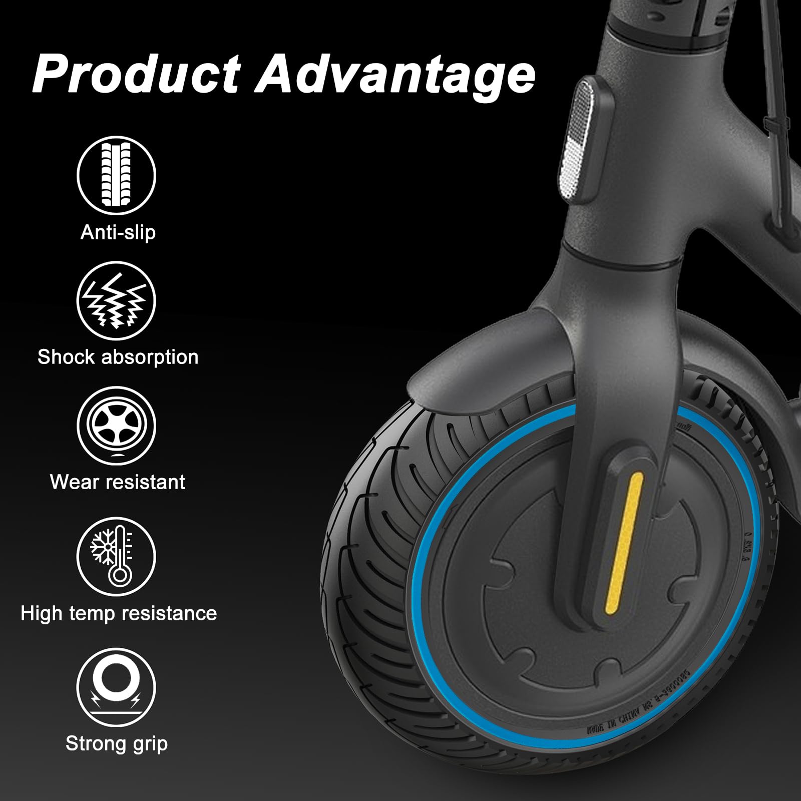 ["Anti-Slip Grooves and Shock Absorption"] - Made of high-quality solid rubber material, the 8.5 inch e-scooter tires are more flexible than conventional rubber. The honeycomb holes inside the tire increase shock absorption by 30%. The grooved structure on the tire surface provides good grip and precise stability, making the tire more durable and improving slip resistance. Increased safety when riding in rain and on sand.