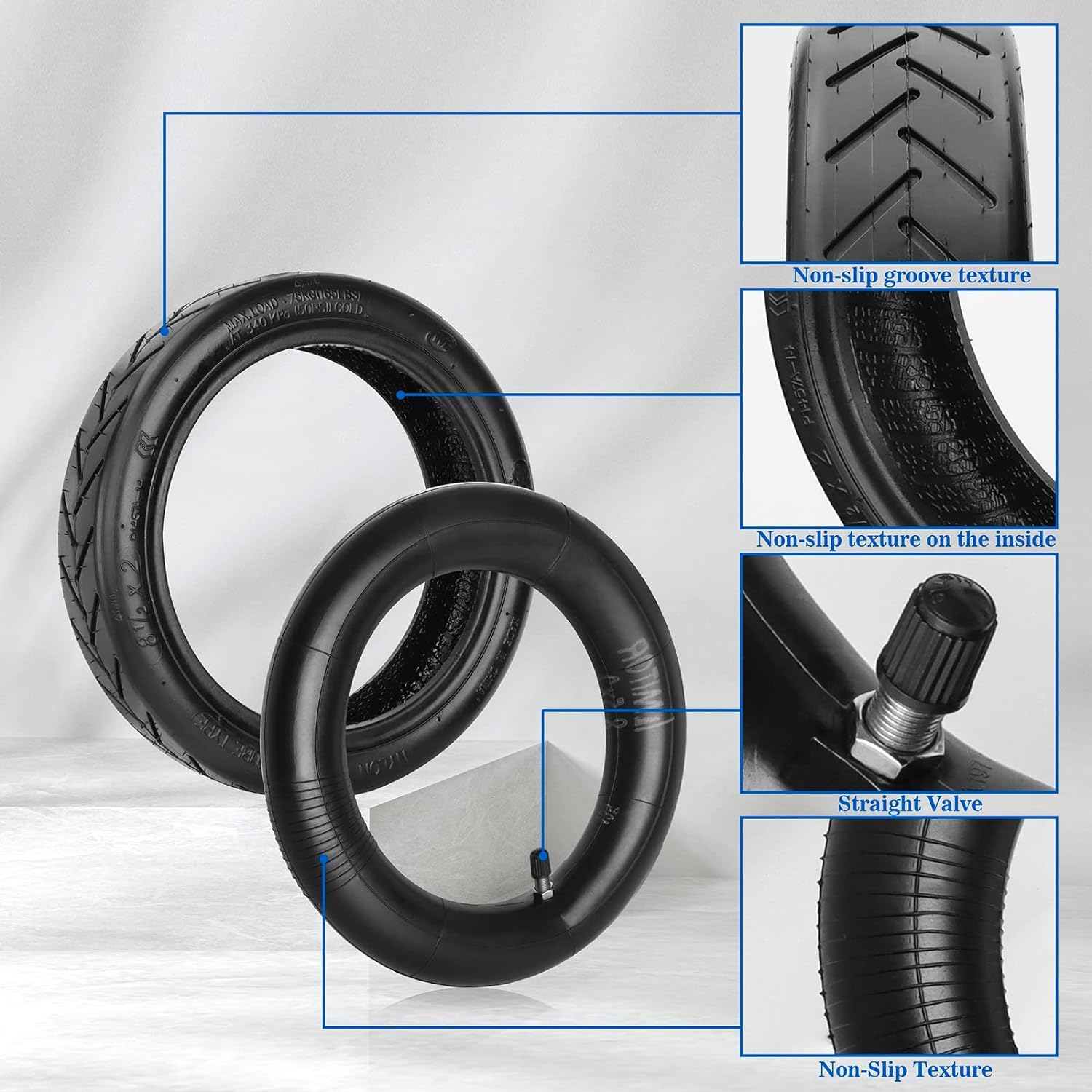 ["Stable Performance"] - Compared to conventional tires, the 50/75-6.1 tire has a better cushioning effect. Tube 8 1/2 x 2 with high-quality valves can maintain more pressure. 8 1/2 x 2 tire tube e-scooters have excellent elasticity and cushioning for better impact resistance and pressure reduction.