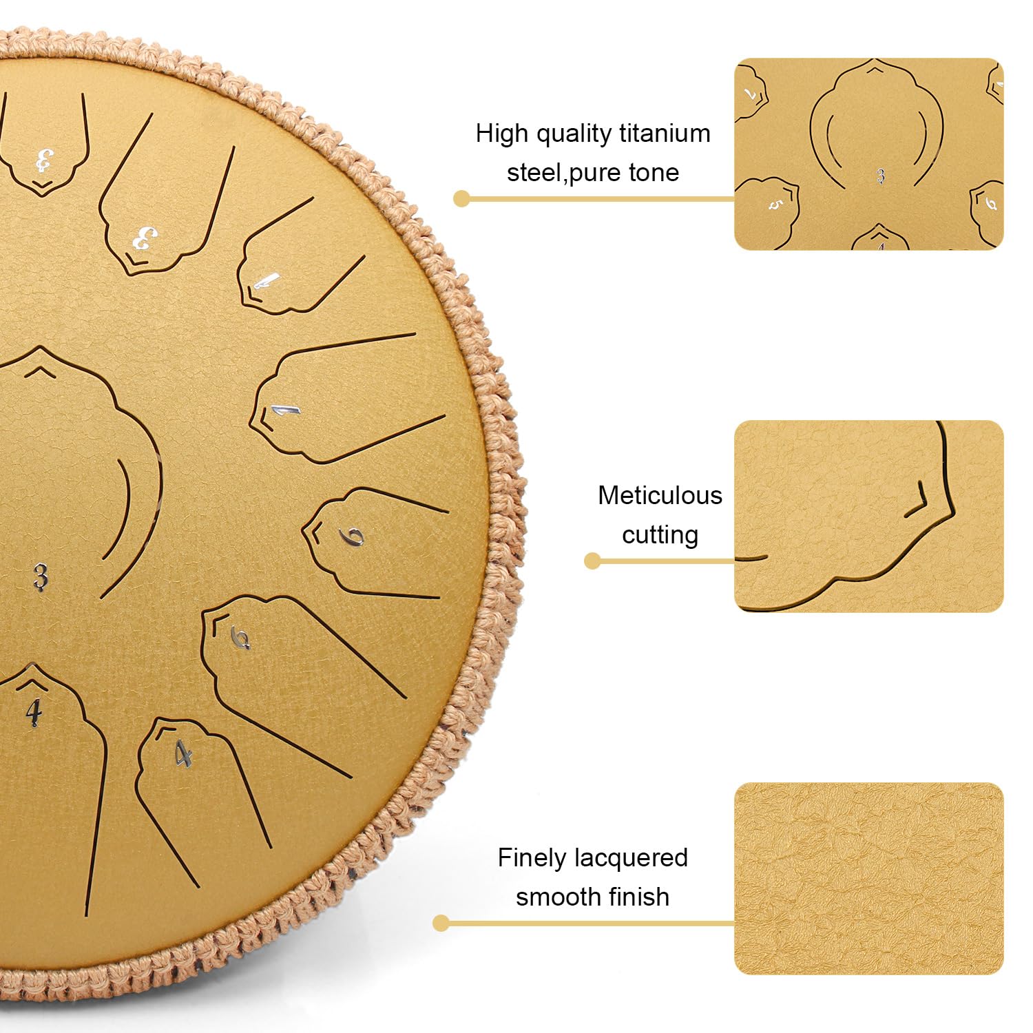 ["Upgrade of Material and Craftsmanship: The Steel Tongue Drum is made of high-quality second generation carbon steel, optimized through scientific material composition. The seamless welding technique and electrostatic painting make the surface durable, corrosion-resistant, rust-proof, and abrasion-resistant.","Precise Tuning: Each C Major Tongue Drum is calibrated more than 10 times precisely, with deviation not exceeding ±5 cents in each measurement. The result is precise tuning, long sustain, and a resonant, relaxing sound experience.","Ideal for Beginners: The handpans are designed in a way that high and low tones seamlessly blend together. The scale is logically arranged, making it easy to remember the notes. Both experienced musicians and beginners can quickly master the instrument. The included user manual answers most questions.","Portable Accessory for Outdoor Activities: The set comes with a complete accessory package, including a reinforced carrying bag, two mallets, four finger picks, a sticker, and a user manual. This makes it easy to use the sound drum on the go. At home in the garden, you can also use it as a Rain Drum to enjoy the soothing sound of falling raindrops.","Care Instructions: Unlike other instruments, the Steel Drum does not require special care. Avoid impacts or falls and store it in a dry, well-ventilated place."]