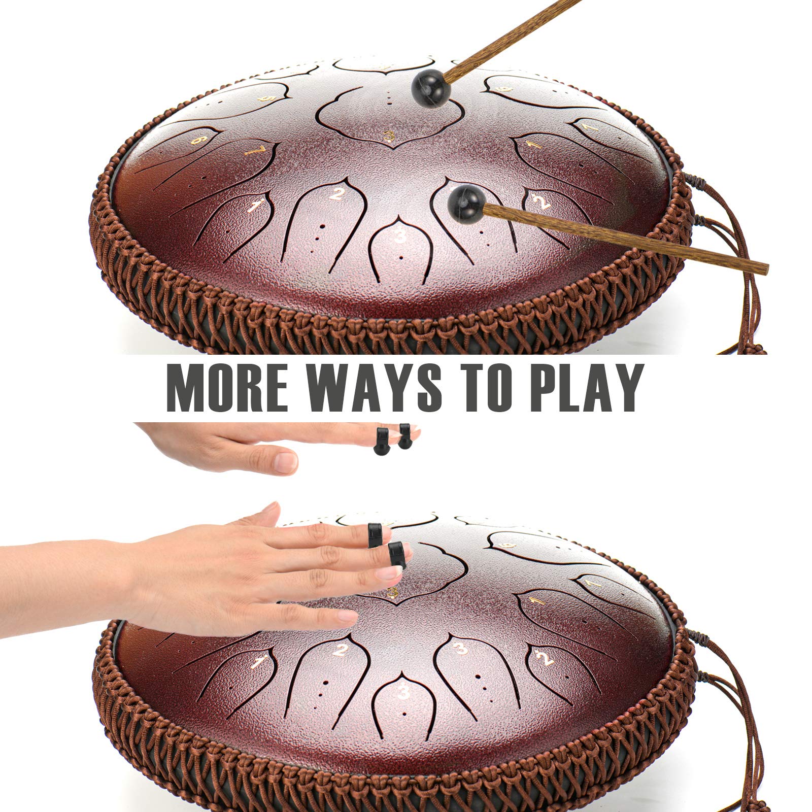 ["Better quality: By using carbon steel technology, the product is sturdy and durable.","Nice sound: Each drum is carefully crafted by craftsmen and can produce a clean sound. Manual production makes errors unavoidable.","Wide application: It is very suitable for music education, professional performance, yoga meditation, spiritual rehabilitation, and so on.","Easy to play: With a range of 15 tones, most melodies can be played. Simply play it with beaters and fingers.","Package included: Steel drum, carrying case, drumsticks, music book with instructions in English, note stickers, and finger picks. If there is any product quality problem, contact us, we will provide you with the best service."]