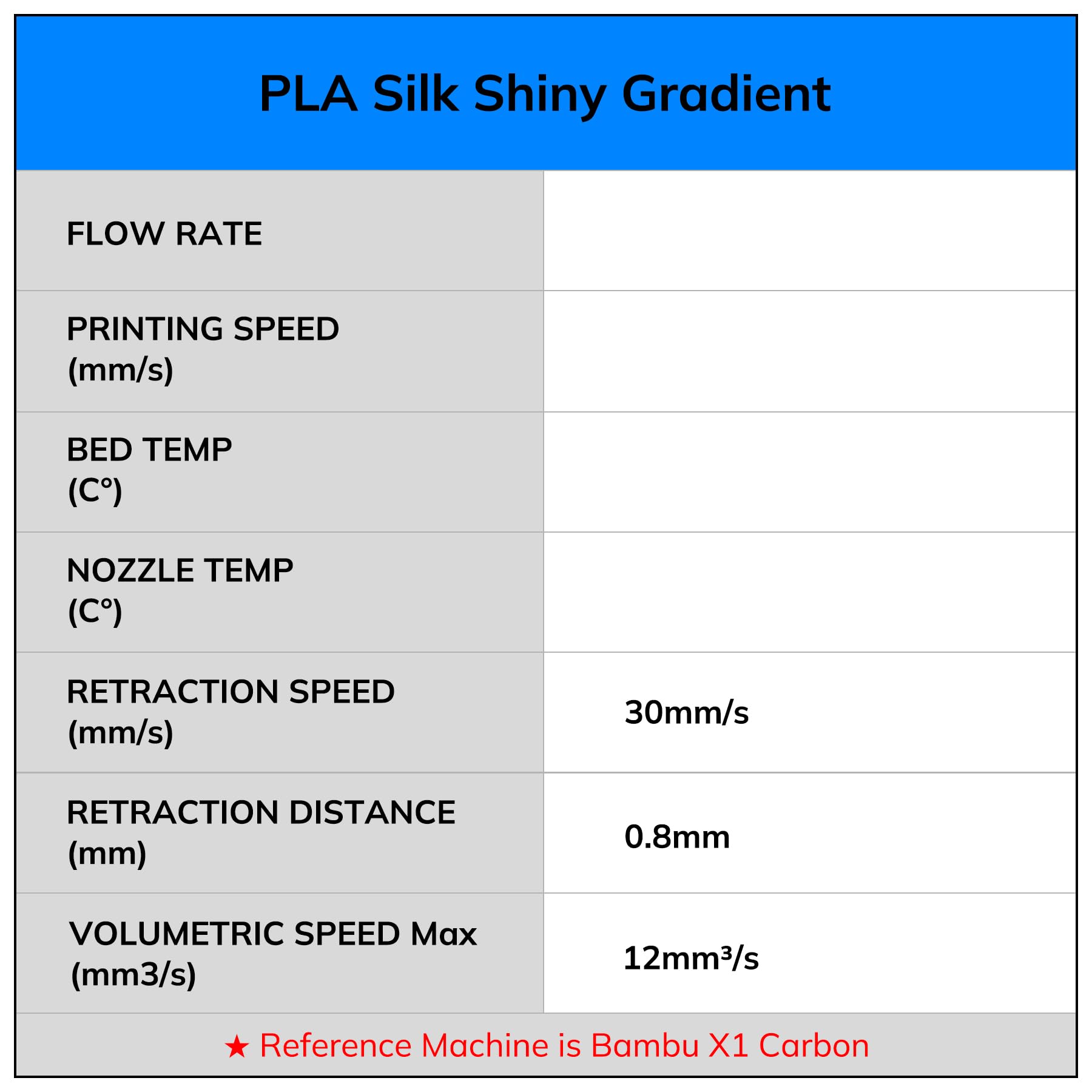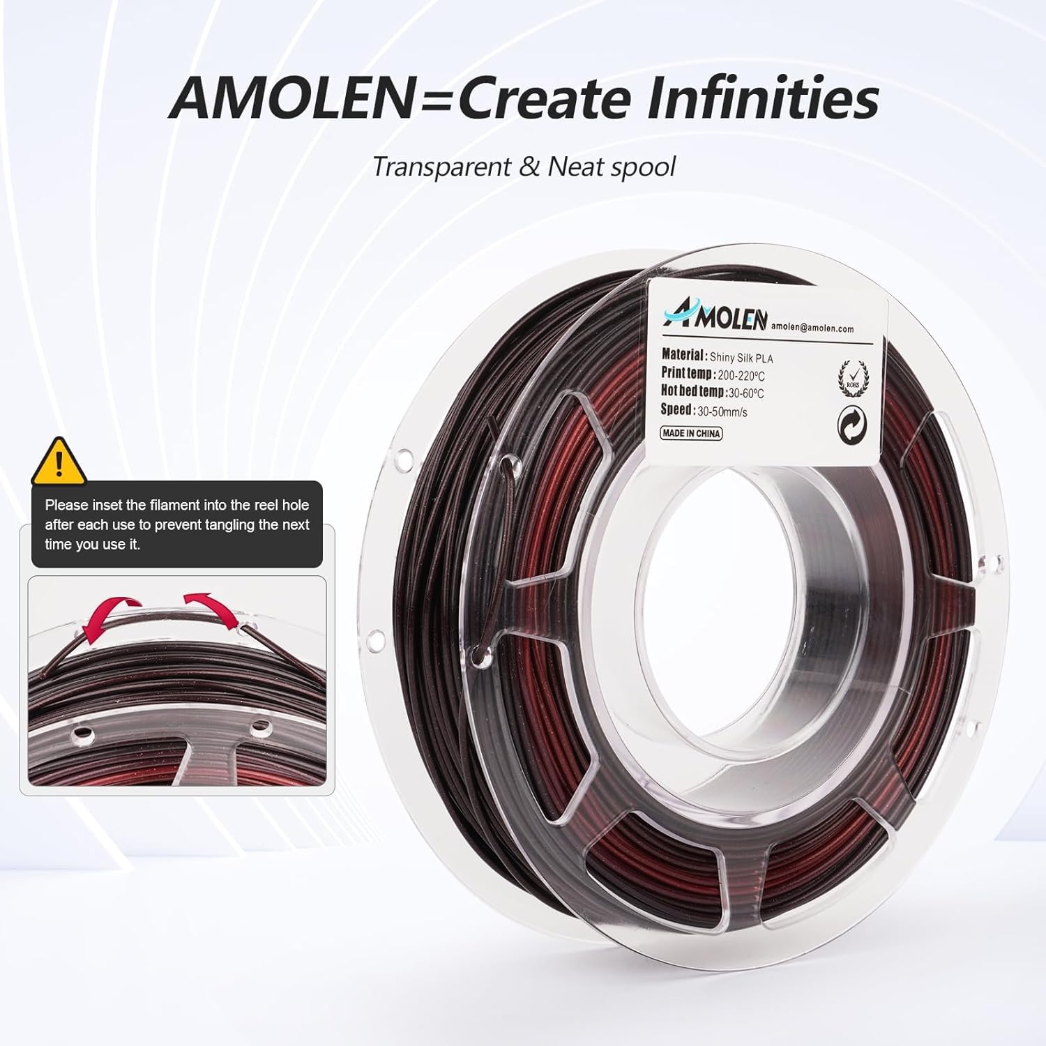 ["PLA Silk Skiny Filament - High quality PLA silk filament combines silk and shine. Black-Red, Black-Blue, Black-Purple, and Black-Green - stunning colors. The finished print results in an impressive printed object.","High quality PLA filament - Guaranteed durability and excellent performance. Good shaping, high toughness, no bubbles, no clogging, no warping, good melting, uniform and constant feed without nozzle or extruder clogging. Print beautiful multi-colors with a spool of PLA filament and silky glossy, smooth appearance.","Easy printing - The silky glossy PLA filament is perfectly compatible with most 3D printers for private and industrial use that use 1.75mm filament. It is designed for consistent, stable extrusion with excellent layer adhesion, ensuring a seamless printing experience at all times.","No clogging and no bubbles - Made from high-quality raw materials, our PLA filament is designed and manufactured with a No-Clog patent to ensure a smooth and consistent printing experience without clogs or bubbles.","Vacuum packaging - Pre-dried for 24 hours and vacuum sealed with desiccant. As PLA filament is sensitive to moisture, please store it in a resealable aluminum foil bag after opening to ensure optimal print quality."]