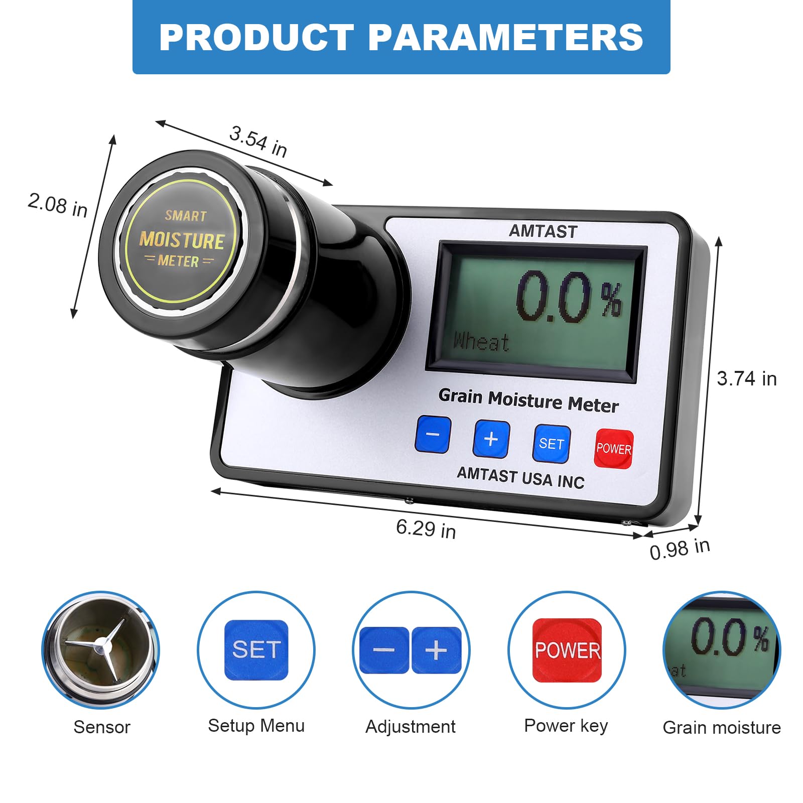 AMTAST Grain Moisture meters for 22 grains: wheat, corn, coffee, cocoa beans, flaxseed, soybeans, rice, almonds, peanuts, parchment coffee, sesame, sorghum, canola, barley.