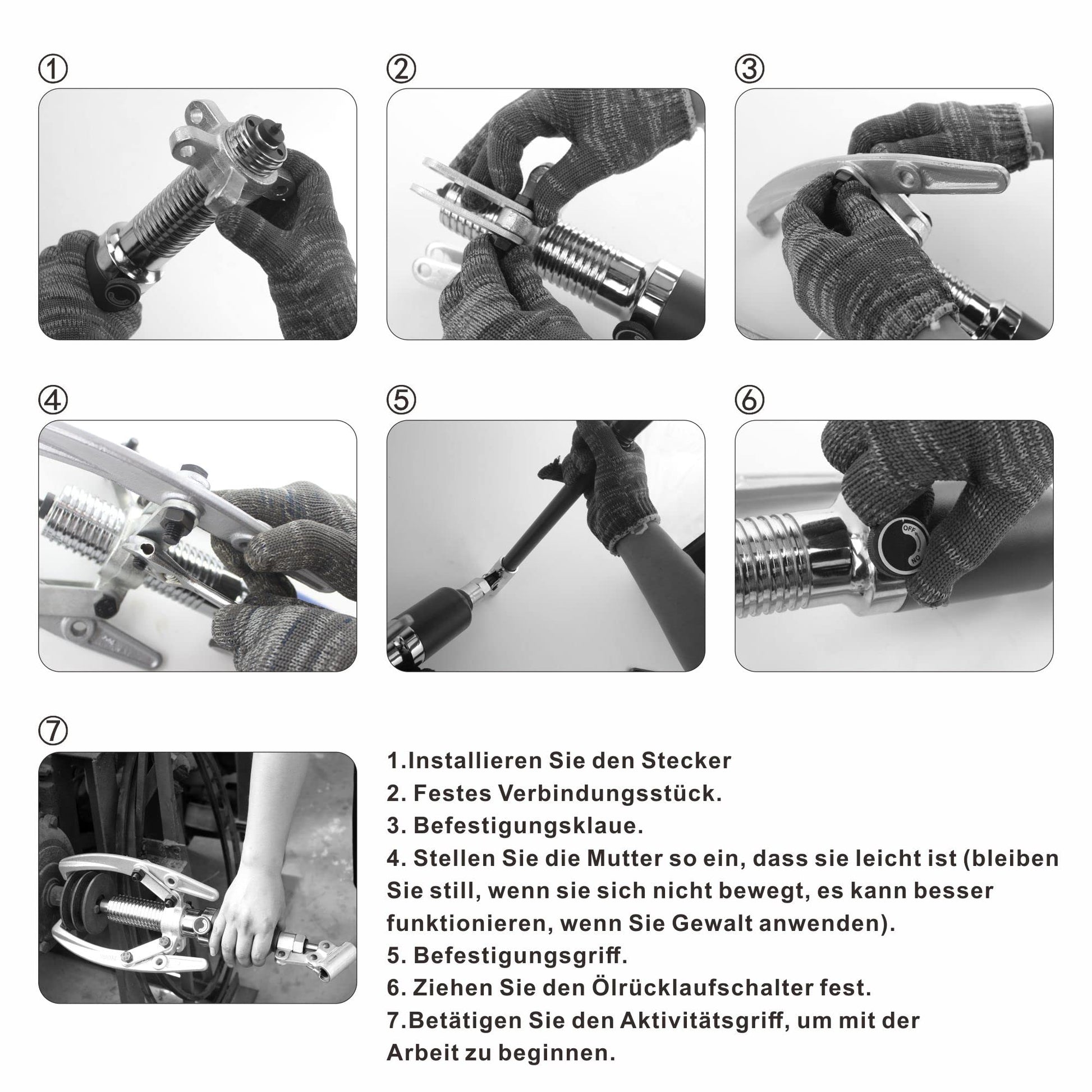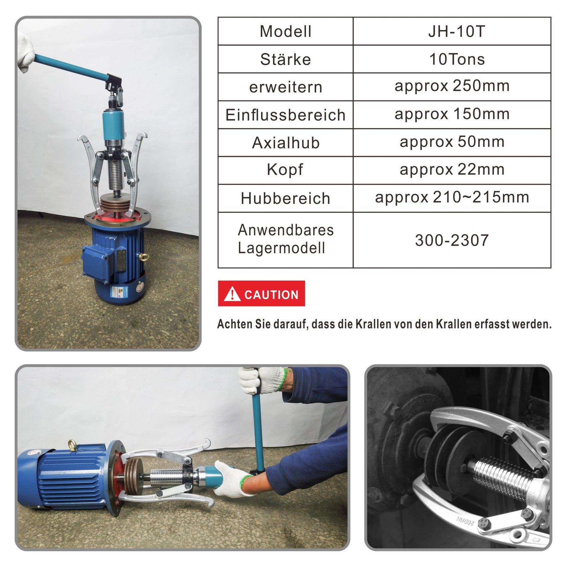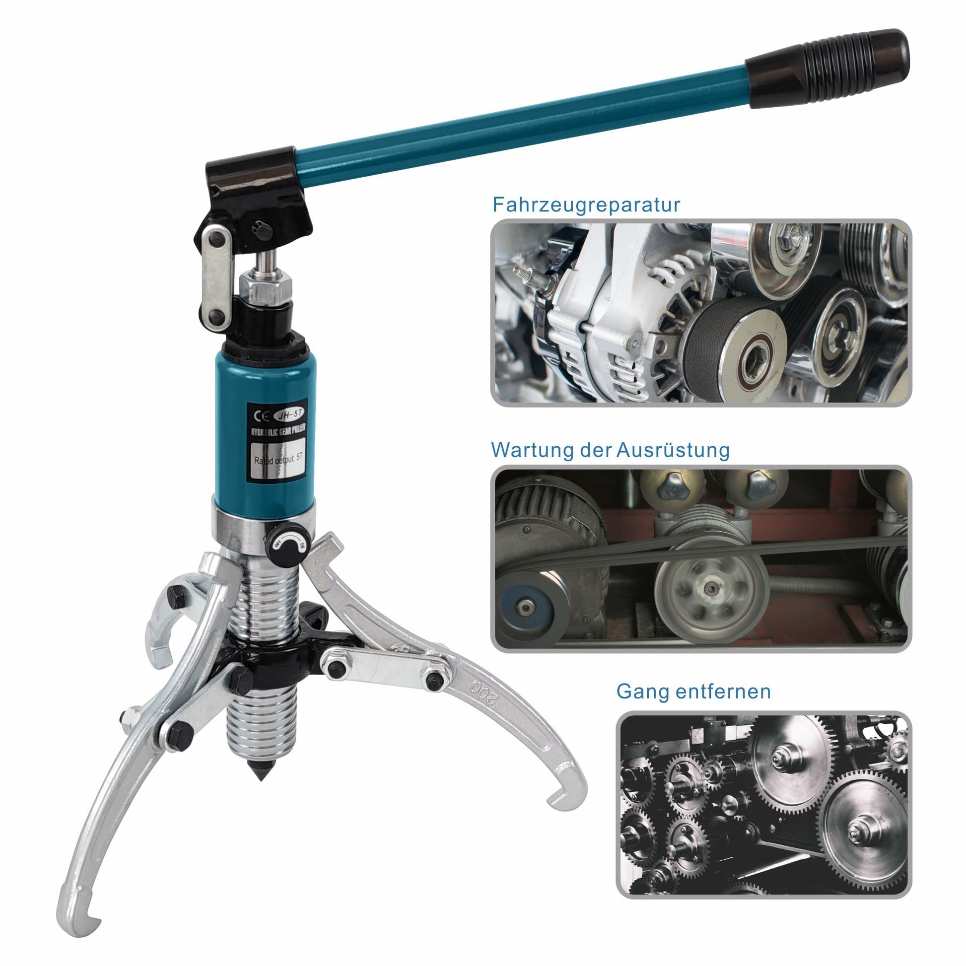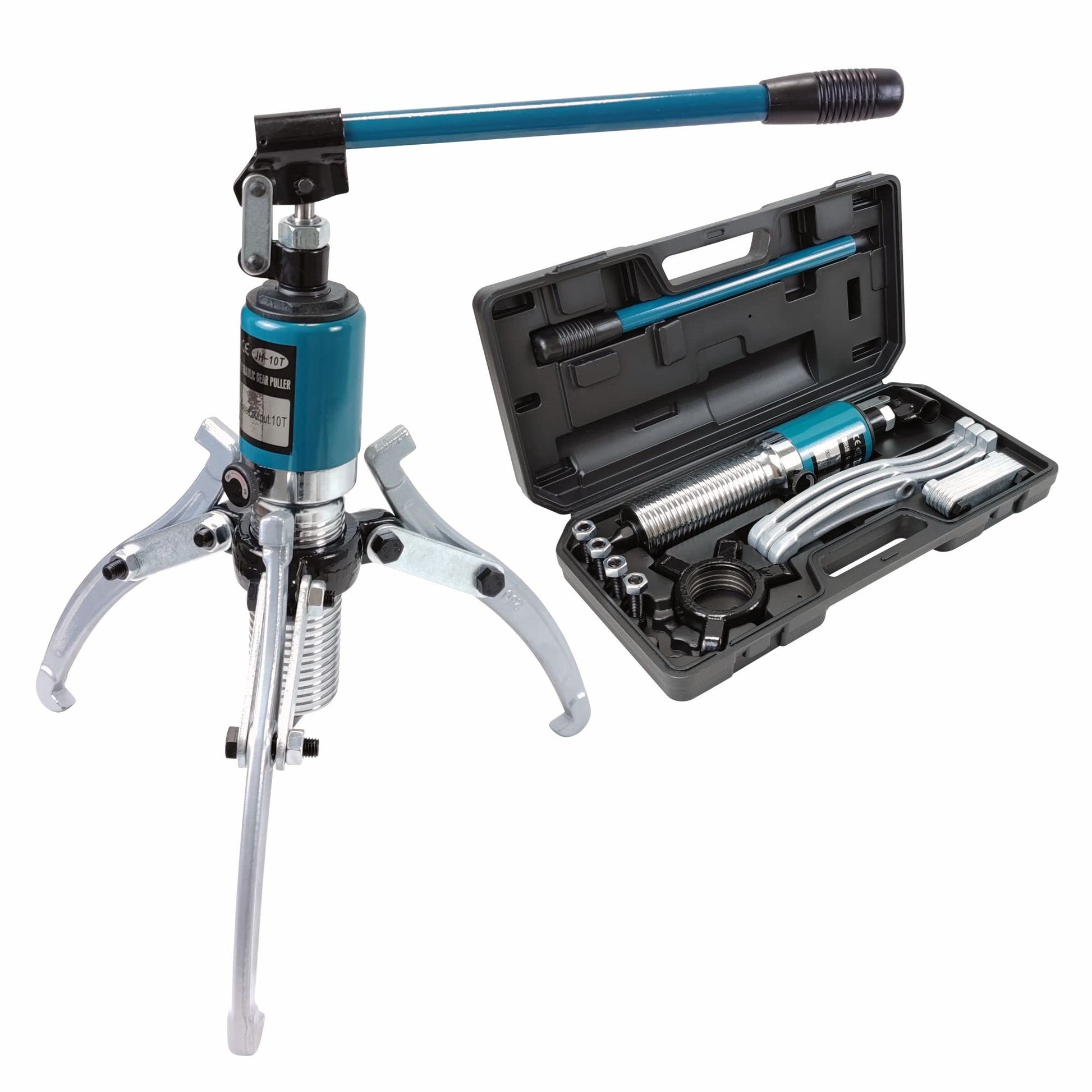 ["High Compatibility: The 3-Jaw Hydraulic Puller Set provides a maximum capacity of 10 tons, a stroke of 50 mm, a maximum span of 250 mm, and a reach of up to 160 mm, fully meeting your different requirements for removing truck hubs, brake drums, sprockets, rotors, car axles, wheel bearings, shafts, and pulleys.","3-in-1 Design: This puller set combines pump, oil hose, and puller in one device for comprehensive mechanical installation and repair. It can be used horizontally and vertically, suitable for any working environment.","Flexible and Easy Operation: The 3 jaws can be adjusted from top to bottom, and the pump head rotates 360 degrees for maximum flexibility. The 2-way yoke allows for easy switching between 2 and 3-jaw pullers. Turning the oil return switch and lifting the handle allows you to build up or release pressure. A safety relief valve prevents overload.","Sturdy Steel Construction: The hydraulic pump is made of high-strength 45# carbon steel and processed by integrated welding to prevent oil leaks. It provides durability, rust resistance, and corrosion resistance for frequent use. The durable jaws are made of alloy steel to ensure stability.","Portable and Versatile: The pump and all accessories can be securely stored in a molded carrying case, making transportation and storage easier. The puller set is commonly used for maintenance on rail vehicles, in auto repair shops, for mining equipment maintenance, and in repair shops."]
