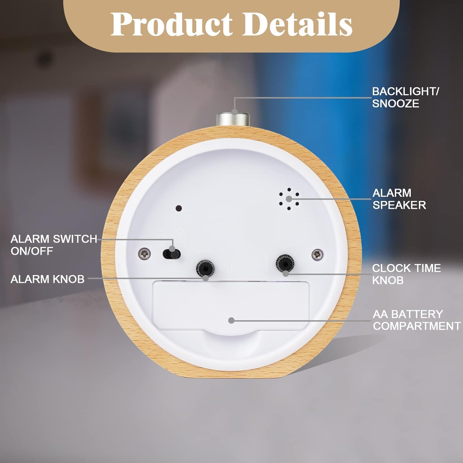 ["⏰【No Ticking】This Analog Clock without Ticking No annoying ticking thanks to the silent sweeping function.","⏰【Retro Design】The clock is intricately carved from a single piece of natural wood. Pure minimalism and harmoniously fits into almost any bedroom.","⏰【Night Light Function】Analog Clock to illuminate in the darkness, press the button on the top of the case to activate the lighting at night, so you can always see what time it is. The light has a warm tone and does not blind at night.","⏰【Alarm with Snooze Function】With this alarm clock with snooze function, you can sleep peacefully and never be late again. When the alarm goes off, simply press the top button to get an additional snooze time of 5 minutes (a total of 9 times). The alarm starts relatively quietly with a beep and then increases in frequency and volume.","⏰【Easy to Use】Battery operated (1*AA battery required - not included) (Do not use high-capacity alkaline batteries to avoid damage to the movement. Carbon battery recommended.), simply set the alarm clock and adjust the second hand using the 3 buttons on the back of the clock without complicated operation. The wooden clock is also suitable as a travel alarm clock due to its compact size."]