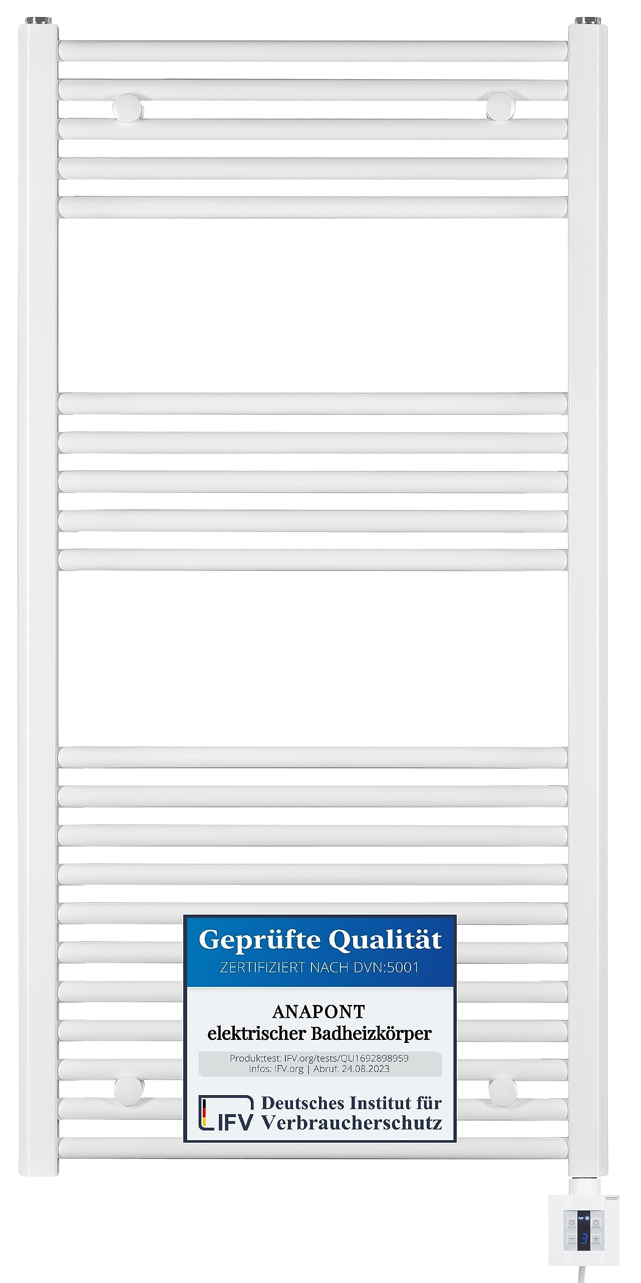 anapont electric bathroom radiator 1175x500 - white straight - timer function - towel radiator - electric bathroom heater - towel heater - Made in Germany