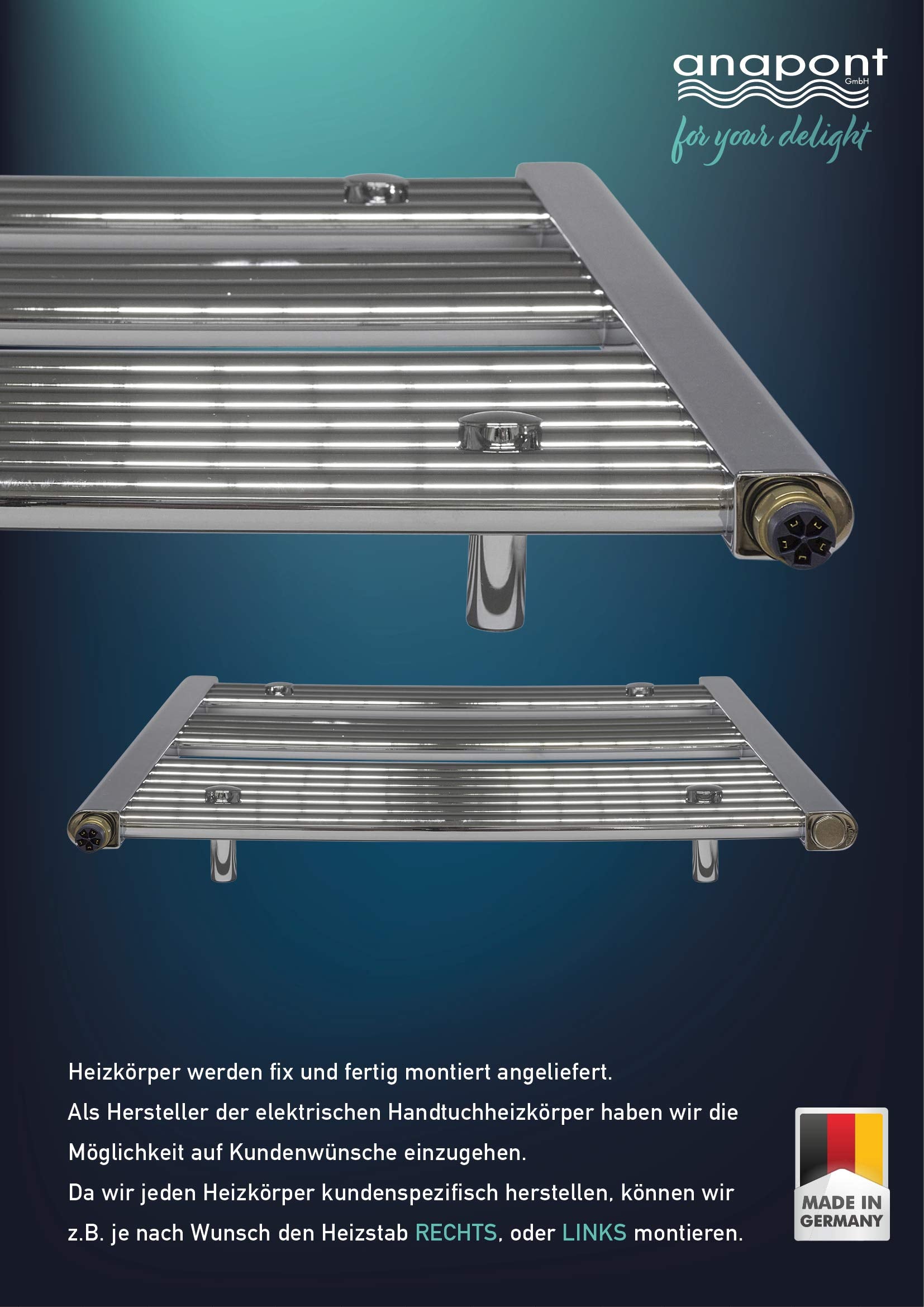 anapont electric towel warmer – chrome curved – with ON/OFF switch – bathroom heater electric – towel radiator – Made in Germany 1175h x 600w