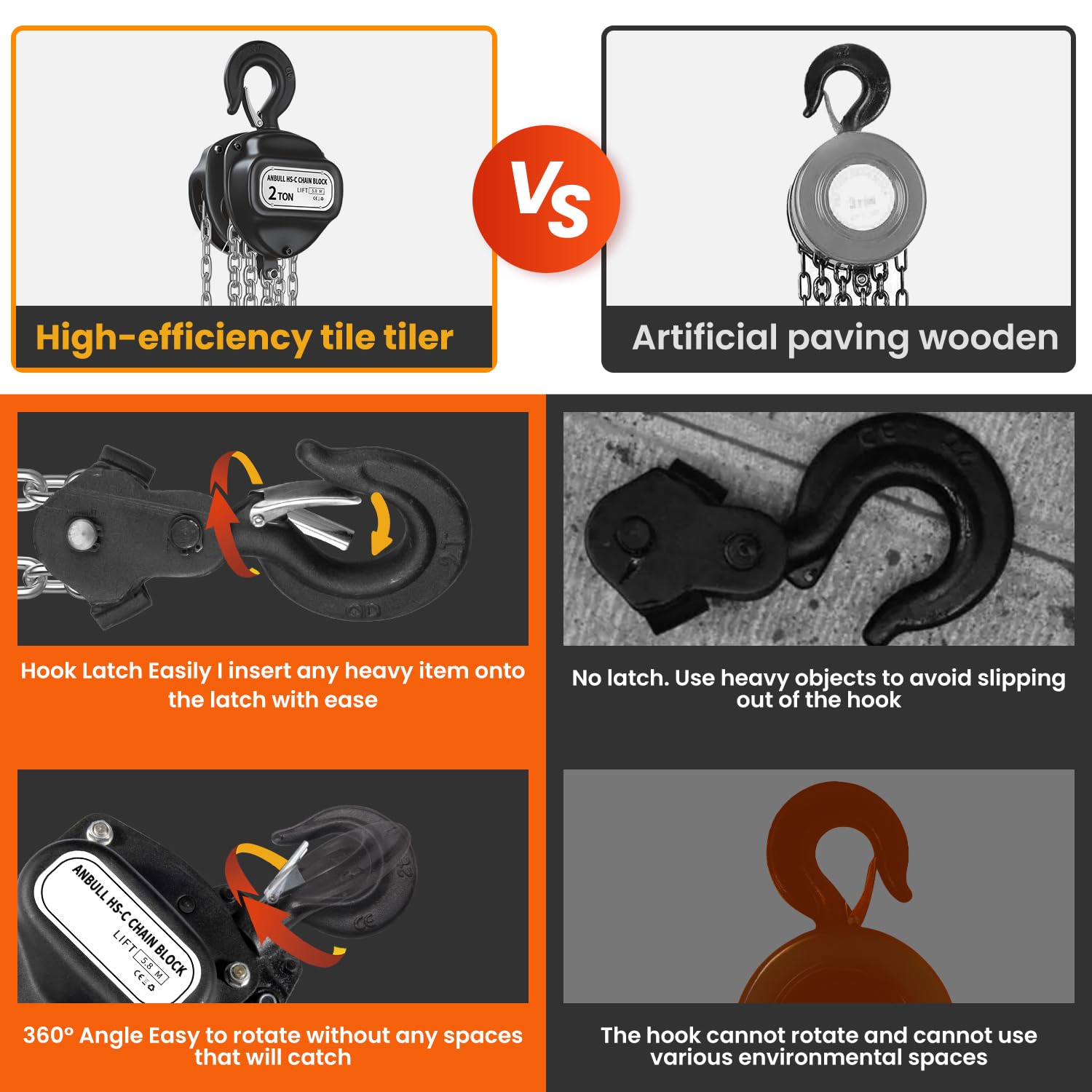 Anbull Chain Hoist, 2000kg load capacity, 5.8m lifting height, fully galvanized chain, no oil stains and rust-proof, product weight 17.5kg.