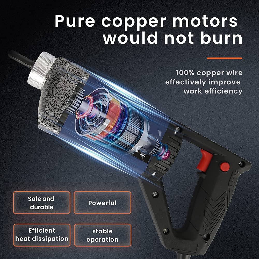 ["【1】Note: After turning on the machine, the imbalance inside the concrete vibrator may spin very quickly without the whole head vibrating noticeably. This phenomenon is completely normal. Please gently strike the metal head of the vibrator sideways on the ground or against the formwork to start vibrating through the impulse.","【2】1300W concrete vibrator, total length of hose and metal rod is 1 meter, bottle vibrator, hose length, agitator speed 4800 rpm, rod head 35 mm, rod core 10 mm. Fixed speed. The product must not be filled with water or oil. Connect the vibration rod and the motor clockwise.","【3】After a work pause, it will spin empty again without vibrating, this phenomenon applies to all vibrators of this type, simply strike the vibrator head against the formwork again to trigger the vibration with a new starting impulse. Concrete vibrating bottles have thick aluminum die-cast housing, special aluminum gears, copper-clad shaft motor, heat dissipation window on both sides, power lock design, comfortable ergonomic handle.","【4】The product can be used in home construction, bridge construction, road construction, foundations, Roman columns, artistic columns, concrete stairs, and all other concrete works where the concrete needs to be compacted.","【5】When assembling, remove (if available) the black plastic transport safety from the motor shaft and insert the hex drive into the socket on the vibrating hose until it stops. Then thread the union nut straight onto the motor's thread until it is tight. Be careful not to cross-thread the nut when attaching it to the motor drive!"]