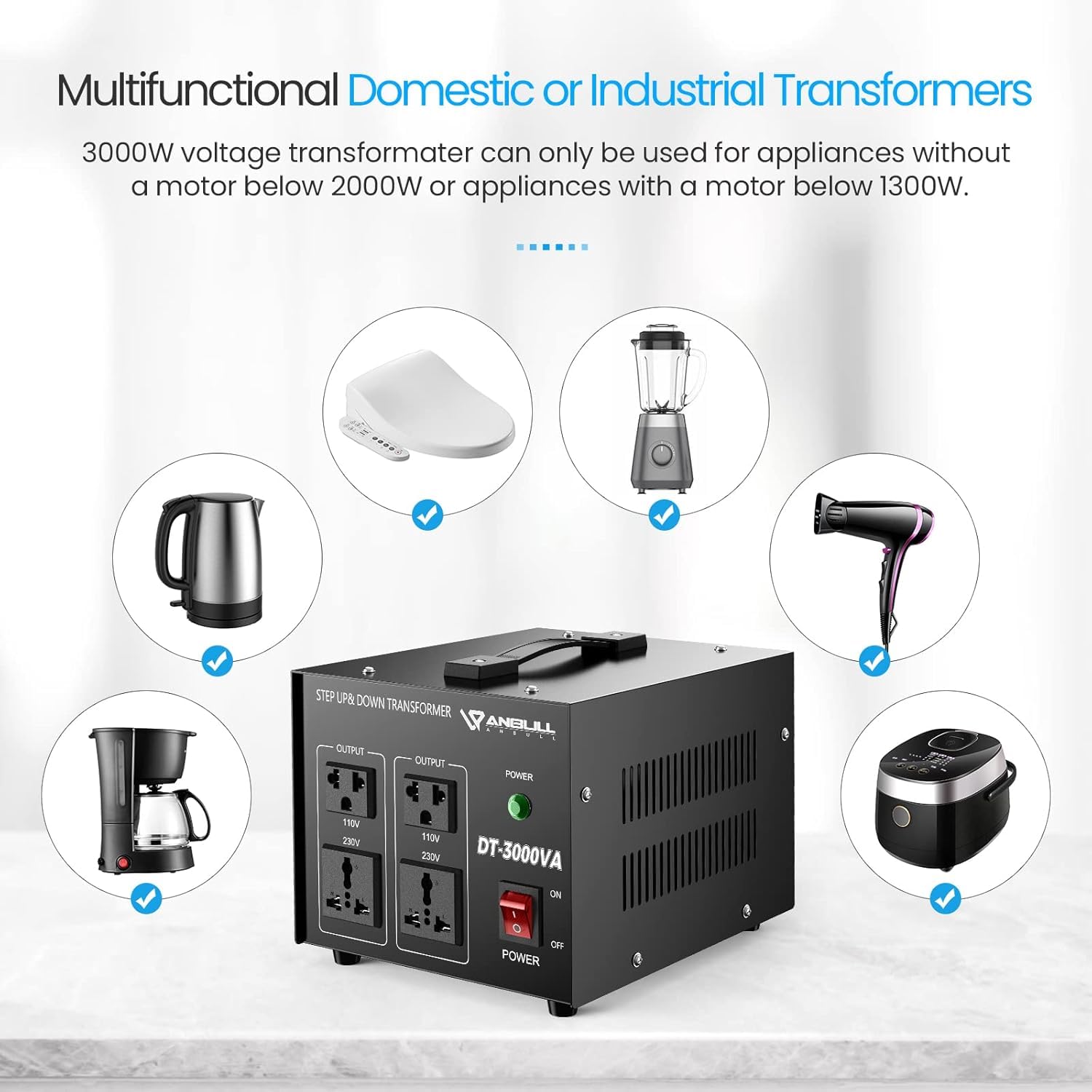 ["1. The 3000W converter is only suitable for electrical devices without motors under 2000W or electrical devices with motors under 1300W. Transformers only convert voltage, not frequency Hertz. If your device is not compatible with 50/60 Hz, the usage effect will be affected.","2. An input miniature circuit breaker (MCB) is installed. When an overcurrent or short circuit occurs, the MCB will trip. Press the reset switch after tripping to continue using. MCBs are much more sensitive to overcurrent than fuses. Unlike a fuse, a blown fuse must be replaced. Therefore, it is safer and easier to use.","3. Some electrical devices, such as heaters, power tools, coffee makers, and laser printers, require 2 to 4 times the startup power. We recommend using a 3 times efficiency factor for high wattage heaters like air conditioners and welding machines.","4. Please check before using if the 110V/230V connector on the back matches the voltage you entered. If it is inconsistent, set it to the correct position.","5. There are four outlets on the front of the device, including two 230-volt outlets and two 110-volt outlets."]