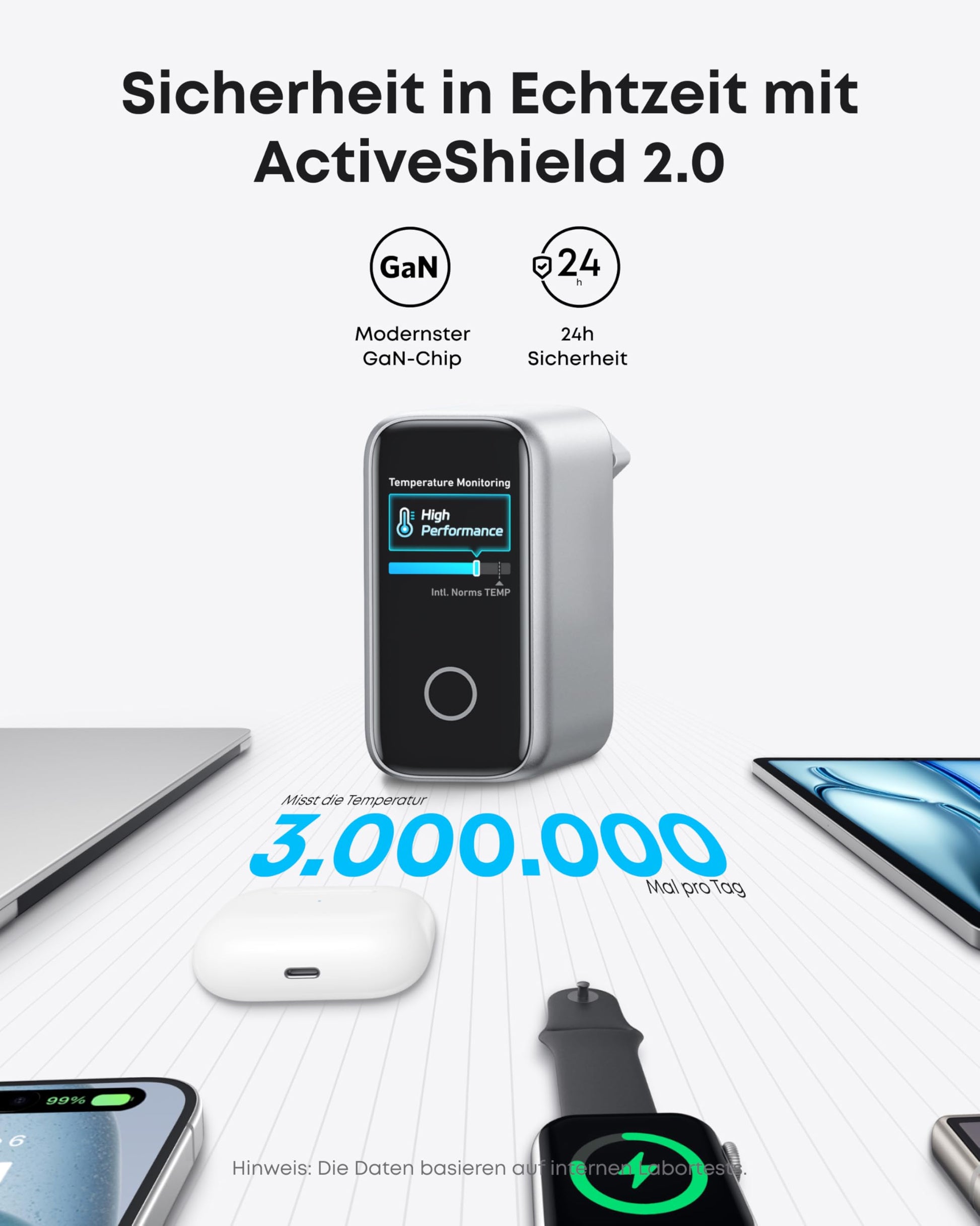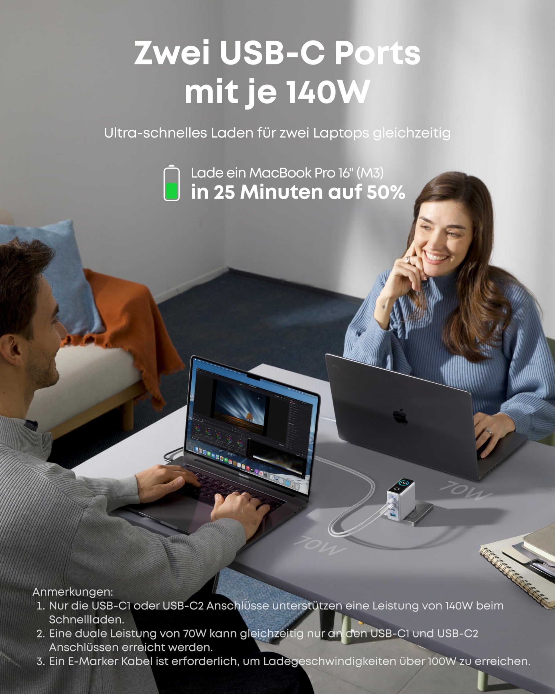 "140W charger for four devices: Charge up to four devices simultaneously with powerful 140W power thanks to state-of-the-art GaN technology. Two high-speed USB-C ports: Charge your MacBook Air 15" in just 30 minutes to 50% with one of the two powerful 140W USB-C ports. More security: The innovative ActiveShield 3.0 system monitors device temperatures over 6 million times a day for added safety. Effortless and transparent insight: The high-resolution color display provides a detailed overview of the charging status, temperature, and connection details so you always have everything in sight. Included: Anker charger (140W, 4 ports, PD 3.1), 1.5m 240W USB-C to USB-C cable, quick start guide, 18-month warranty, and our friendly customer service."