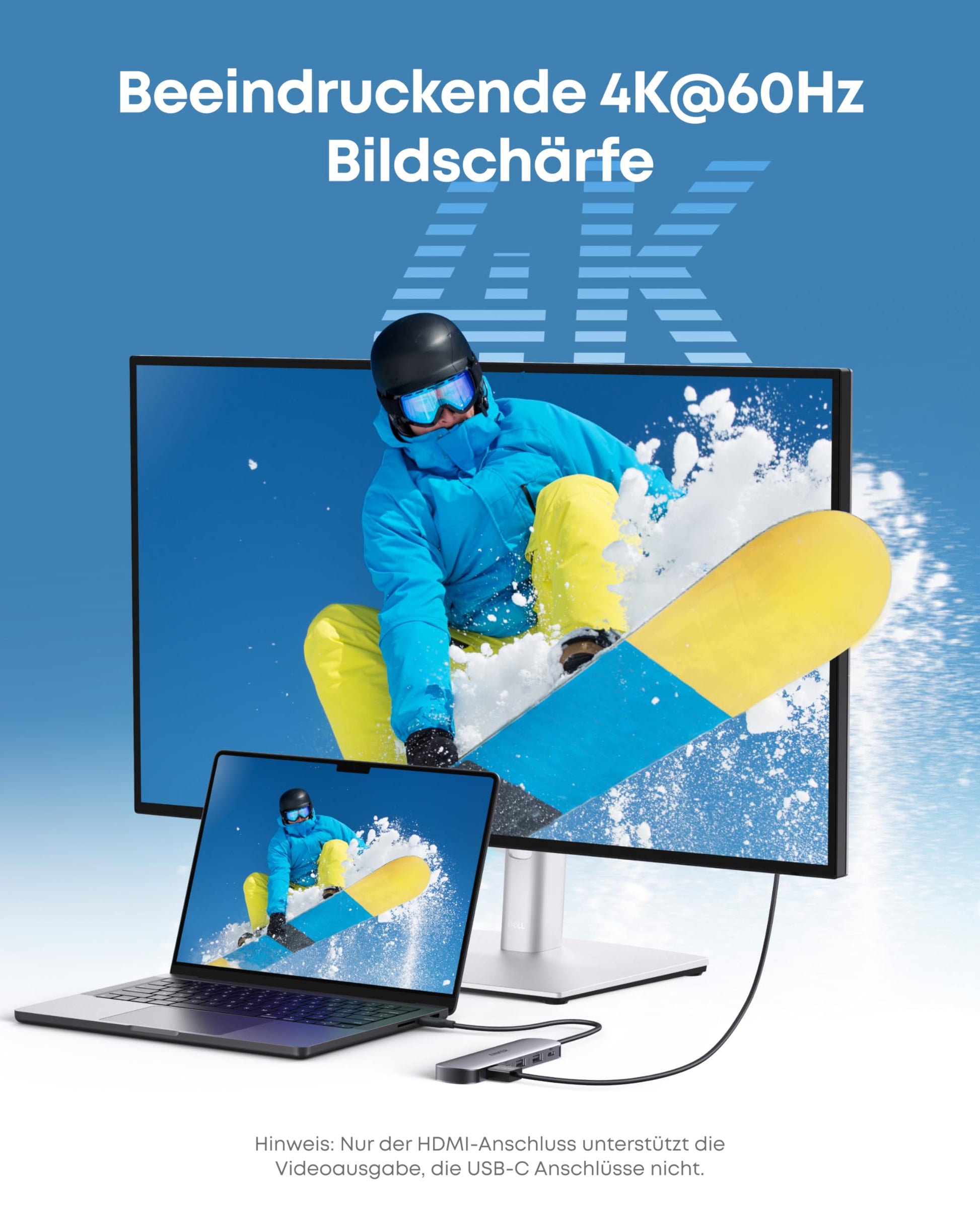 ["Elegant 7-in-1 USB-C Hub: Equipped with an HDMI port, two USB-A 3.0 ports, and a USB-C data port – all with fast 5 Gbps transfer speeds. Additionally, the hub offers a USB-C PD input for charging up to 100W and dual slots for SD and microSD cards – all packed in a compact design.", "Crystal clear 4K@60Hz HDMI: Enjoy crisp image quality and smooth playback – ideal for high-resolution presentations or entertainment. (Note: Only the HDMI port supports video output; the USB-C port is for data transfer only.)", "Double efficiency: The two USB-A 3.0 ports and the USB-C data port allow for 5Gbps transfers – for significantly faster file transfers and increased productivity.", "Reliable fast charging with 85W: Charge your laptop up to 85W – fast, efficient, and perfect for the mobile workday.", "Package includes: Anker USB-C Hub (7-in-1), user manual, 18-month warranty, and our friendly customer service"]