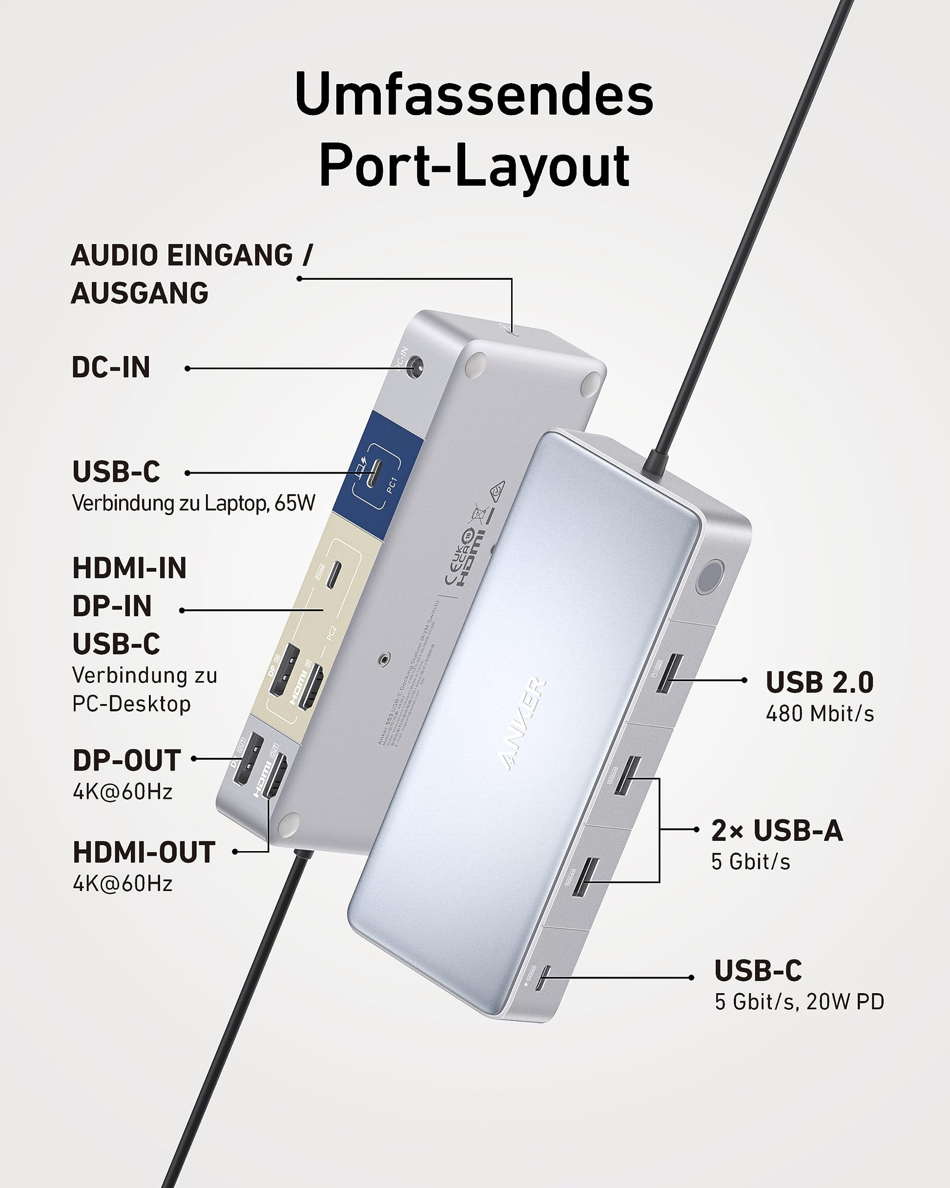 Anchor Docking Station, KVM switch for desktop PC and laptop, dual 4K monitor 553 USB-C docking station with HDMI and DisplayPort, USB 3.0 ports for HP laptop, MacBook, iPad, Steam Deck, and more.