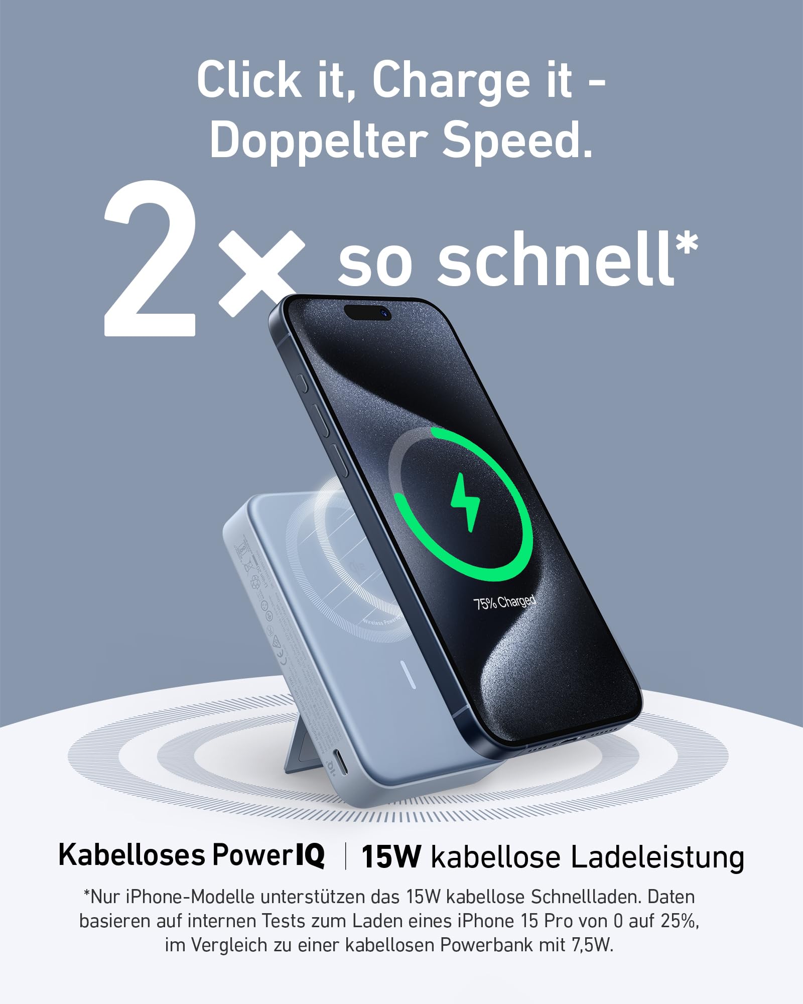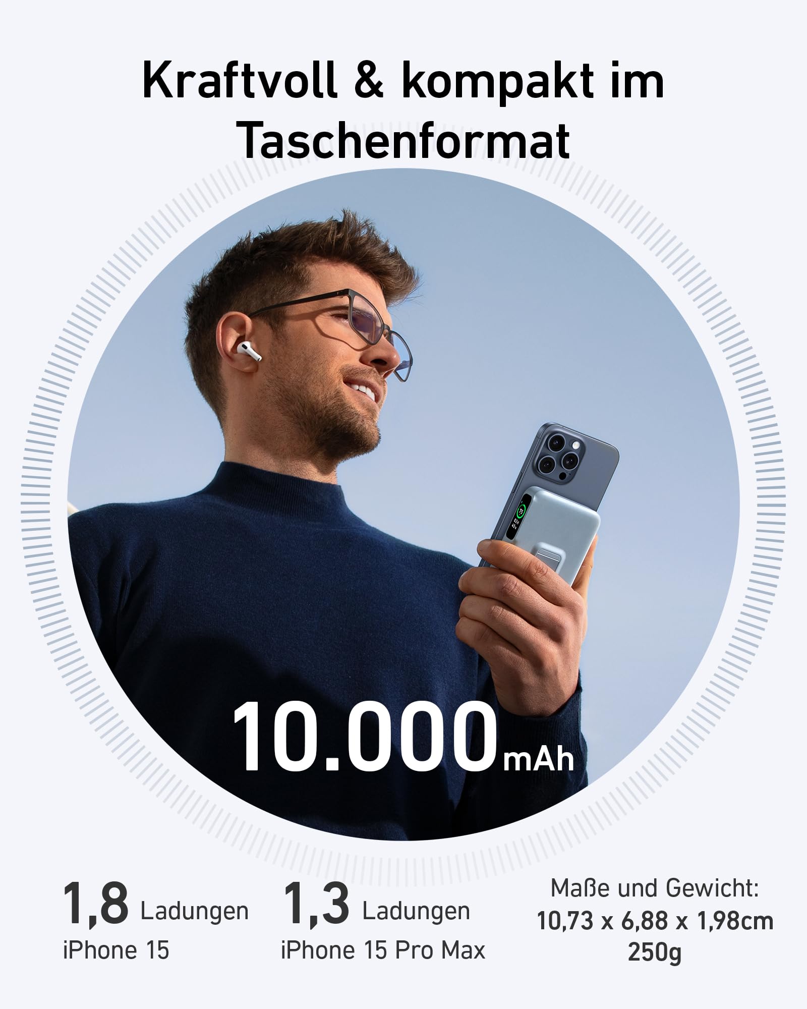 ["QI2 CERTIFIED CHARGING: Enjoy 15W wireless charging, backed by Qi2 certification for fast, reliable, and efficient charging.","DOUBLE CHARGING SPEED: Experience 15W fast wireless charging and charge your devices twice as fast*. Your iPhone 15 Pro reaches 50% battery in just 44 minutes.","INFORMATIVE SMART DISPLAY: Keep an eye on your device's charging progress. From battery level to remaining charging time - the clear display keeps you informed.","POWERFUL WITH STAND FUNCTION: The powerful 10,000mAh power bank charges your iPhone 15 Pro up to 1.8 times. With the built-in stand, you can comfortably stream videos and always enjoy optimal viewing.","WHAT YOU GET: Anker MagGo Powerbank (10K), USB-C to USB-C cable (0.6m), user manual, 24-month warranty, and our friendly customer service."]