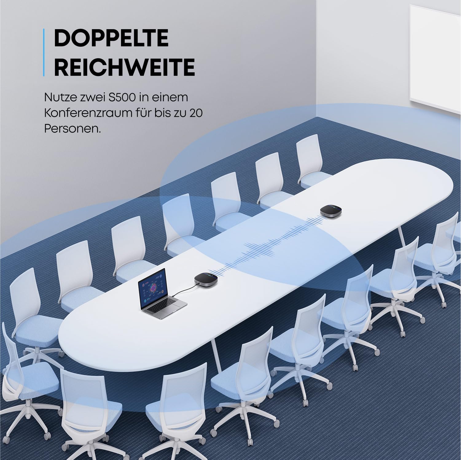 ["VoiceRadar TECHNOLOGY: PowerConf S500 automatically focuses on voices and conversations in the room and selectively suppresses distracting noise sources. Additionally, echo and distortions in a busy conference room are effectively reduced.","PRECISE AUDIO RECORDING: 4 integrated microphones with a 32KHz rate are positioned at a smart 360° angle, capturing your voice accurately and reproducing the dialogue sharply with dual audio function, even when both persons are speaking simultaneously.","OFFICIALLY CERTIFIED BY ZOOM: Tested and awarded according to the latest professional Zoom standard in image quality, color, and clarity to ensure first-class sound quality in conference rooms with up to 12 people.","HI-FI SOUND PROFILE: The 1.75-inch speaker delivers stunning audio quality - whether professionally in conferences or for your personal home office playlist to relax.","DOUBLE POWER: From now on, you can even wirelessly connect two PowerConf S500 conference speakers to cover large office spaces with up to 20 people."]