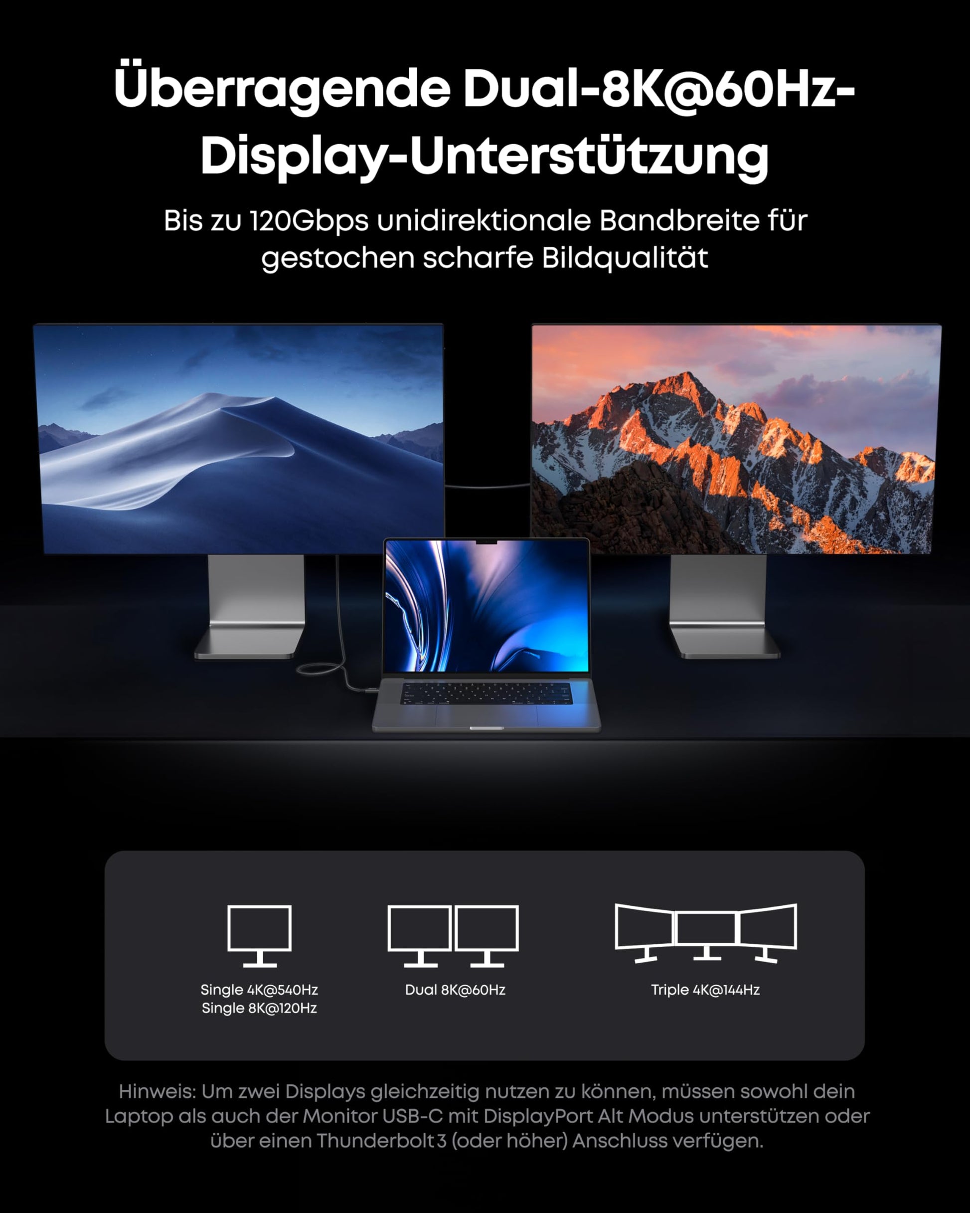 8K Display Support: Enjoy stunning clarity with two 8K displays at 60Hz and up to 120Gbps bandwidth.