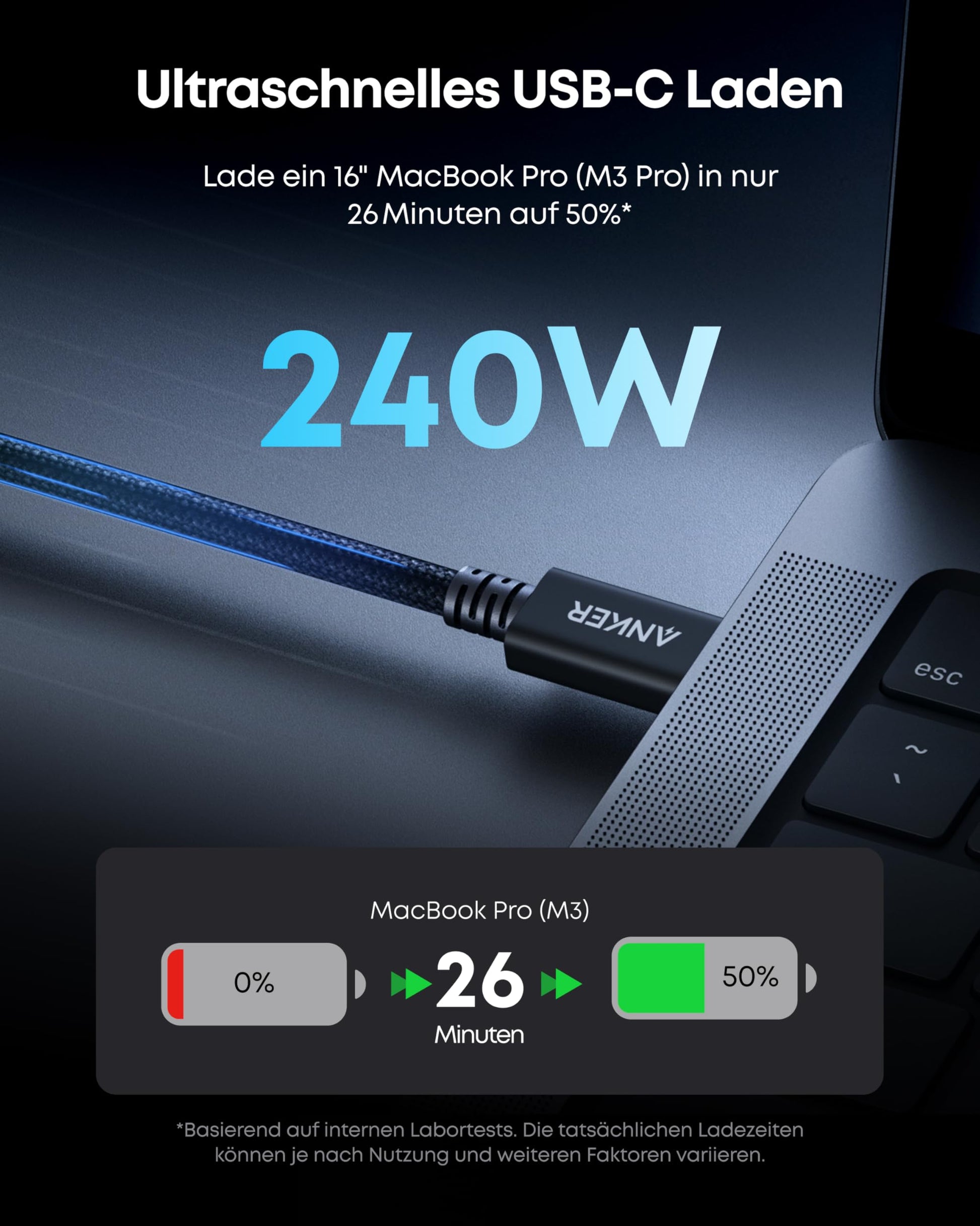 240W USB-C Charging: Charge a 16\" MacBook Pro (M3 Pro) to 50% in just 26 minutes – with ultra-fast 240W USB-C Charging.