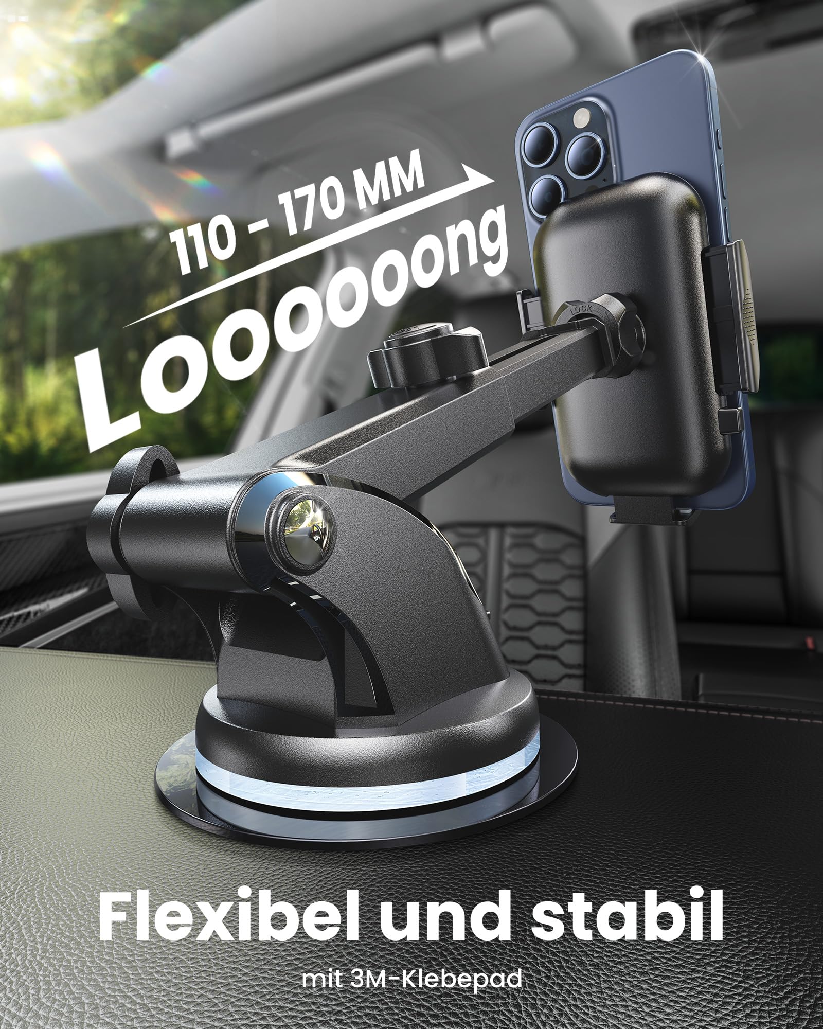 360° VERSTELLBARER BLICKWINKEL: andobil Handyhalterung Auto iPhone 16 ist eine kompakte und ideale Halterung. Der Kugelkopf ist um 360 Grad frei drehbar, die Navigation kann horizontal und vertikal verwendet werden. Die Länge der Halterung Auto kann von 5,1 bis 7,3 Zoll und von 270 Grad auf verschiedene Höhen eingestellt werden. Der Kugelkopf und Knob sind aus rutschfestem Material, Bequemer zu bedienen. können Sie den besten Blickwinkel einstellen und sich mehr auf sicheres Fahren konzentrieren