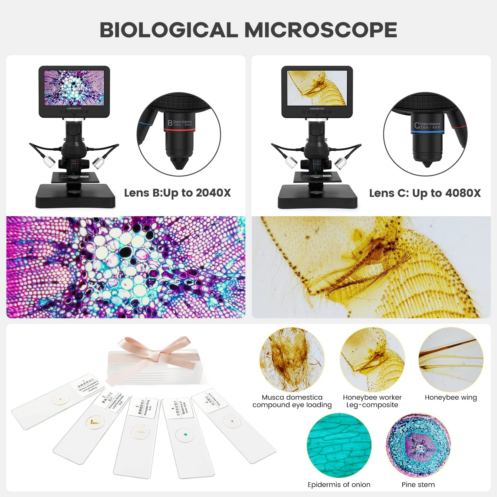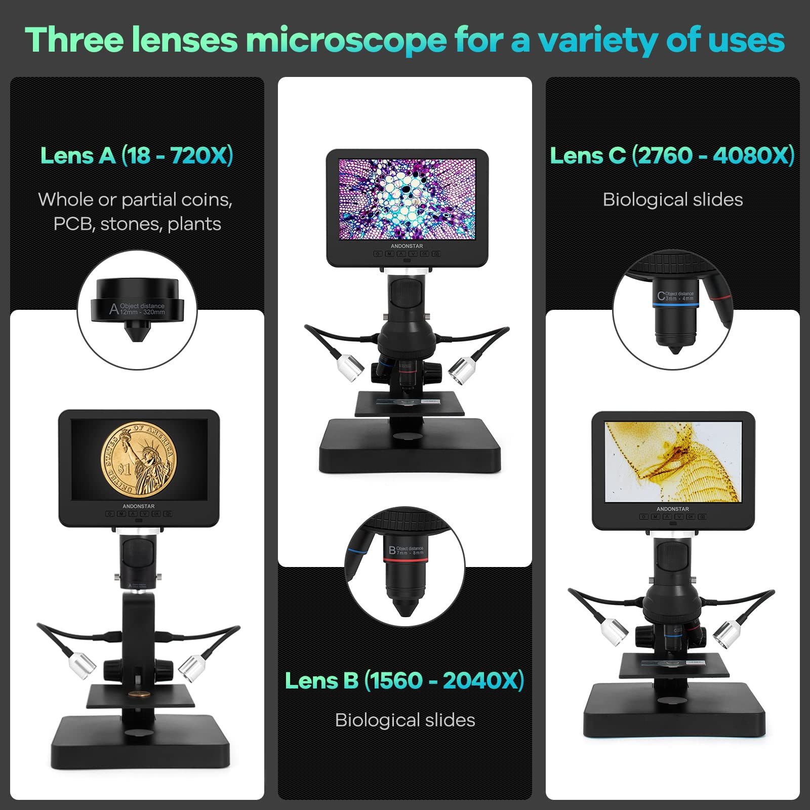 ["Digital multi-lens microscope for adults: Lens A (18-720x) is suitable for viewing whole coins or parts of them, circuit boards, plants, stones, etc. Lens B (1560-2040x) and Lens C (2760-4080x) are ideal for viewing biological slides.","UHD 2160P HDMI digital microscope: Ultra-high-resolution video recording with HDMI output support on a larger screen allows for a more detailed view of the microscopic world, ensuring free eyes.","Great microscope set for adults: The multi-lens microscope is suitable for different requirements. It can be used as a coin microscope or biological microscope and comes with extensive accessories such as biological slides.","Easy to use: Various lenses can be easily exchanged by removing and attaching the screws. Turn the focus wheel to focus and the holder button to adjust the object distance.","Professional measurement software: Simply download our professional measurement software and easily connect the microscope to your Windows PC to measure object lengths, calculate areas, and capture photos and videos.","Adjustable USB LED lights: Eight intensity levels of LED lights meet your different requirements for image brightness.","Wireless remote control: Convenient operation from a distance and supports functions such as image coloration and digital zoom. Especially suitable for teaching purposes and other scenes.","Capture photos and videos: More than just a microscope. With the included microSD card, you can easily capture and save images or videos of the observed micro world.","Package includes: 1x microscope stand, 1x plastic tripod, 1x Lens A, 1x Lens B, 1x Lens C, 2x USB lights, 1x 32GB microSD card, 1x USB cable, 1x switching cable, 1x HDMI cable, 1x remote control, 5x prepared slides, 1x observation box, 1x tweezer, 3x background plate, 1x screwdriver, 1x manual, 24-hour customer service." ]