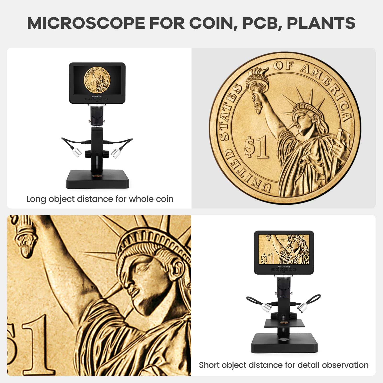 Andonstar AD246S-P HDMI digital microscope with 7-inch screen, 4000 x 2160P UHD video recording, 3 lens for coin errors, biological microscope kit for adults.