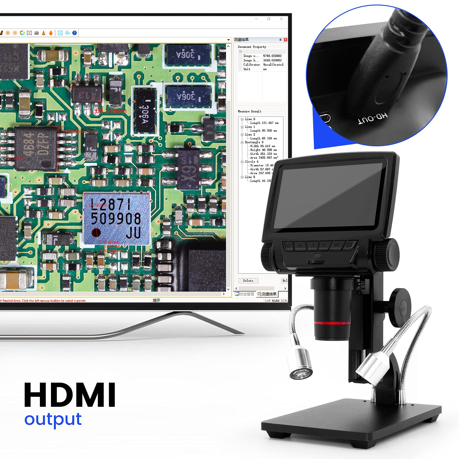 "There are 4 ways to output: 1, through microscope's own monitor, 2, through HDMI monitor, 3, Micro-SD card, 4, PC connection via Andonstar software."]