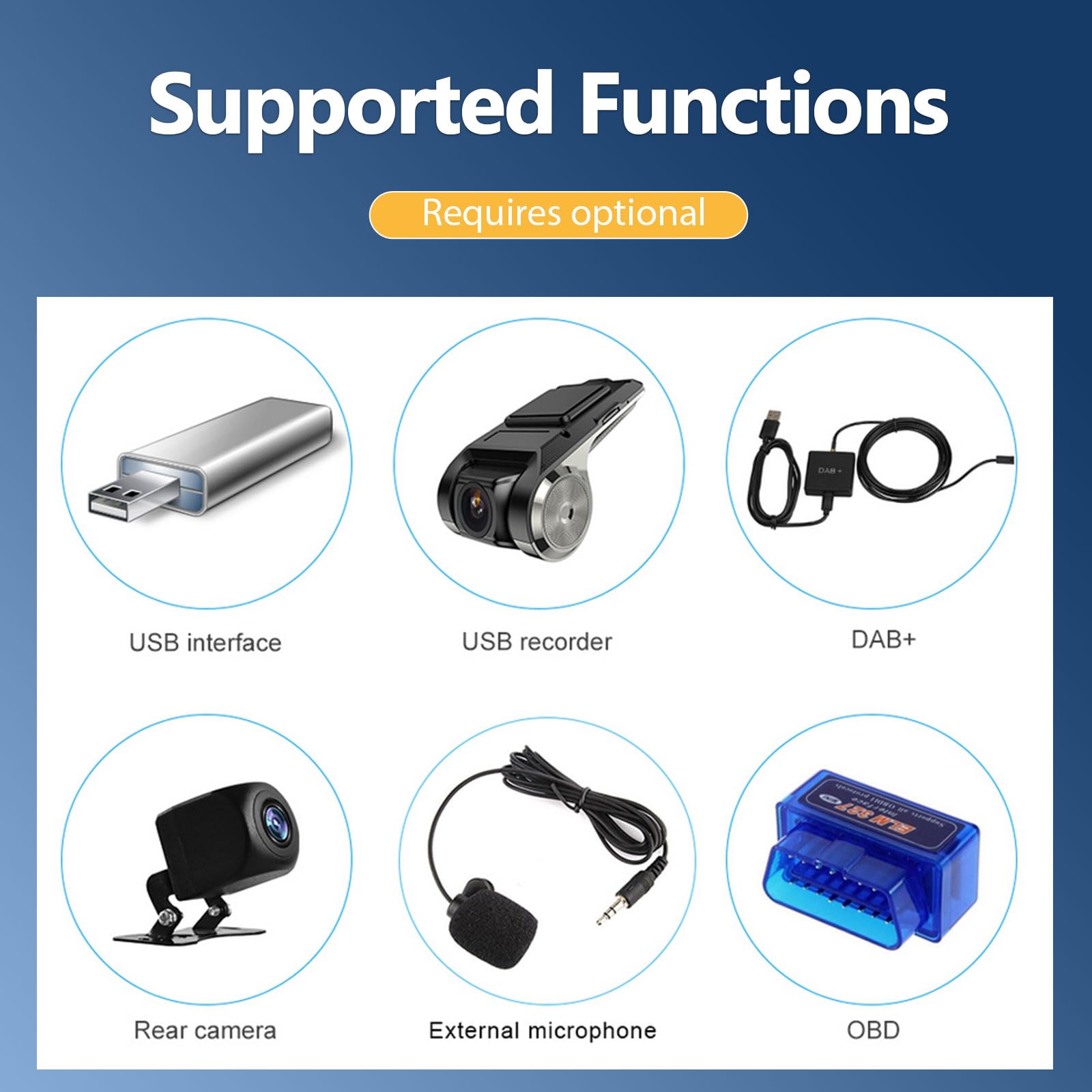 "【Reverse Camera, CANBUS, SWC】The 2-DIN car radio allows access to the reversing camera and automatically triggers the reverse gear. Supports setting a reverse line to make reversing safer. CANBUS allows real-time information synchronization, making vehicle control smarter and more accurate. By learning direction control, you can manage some functions more easily."]