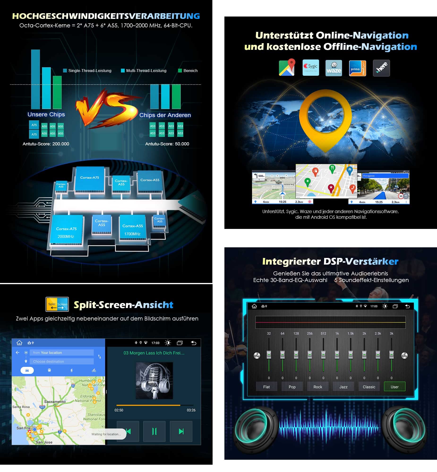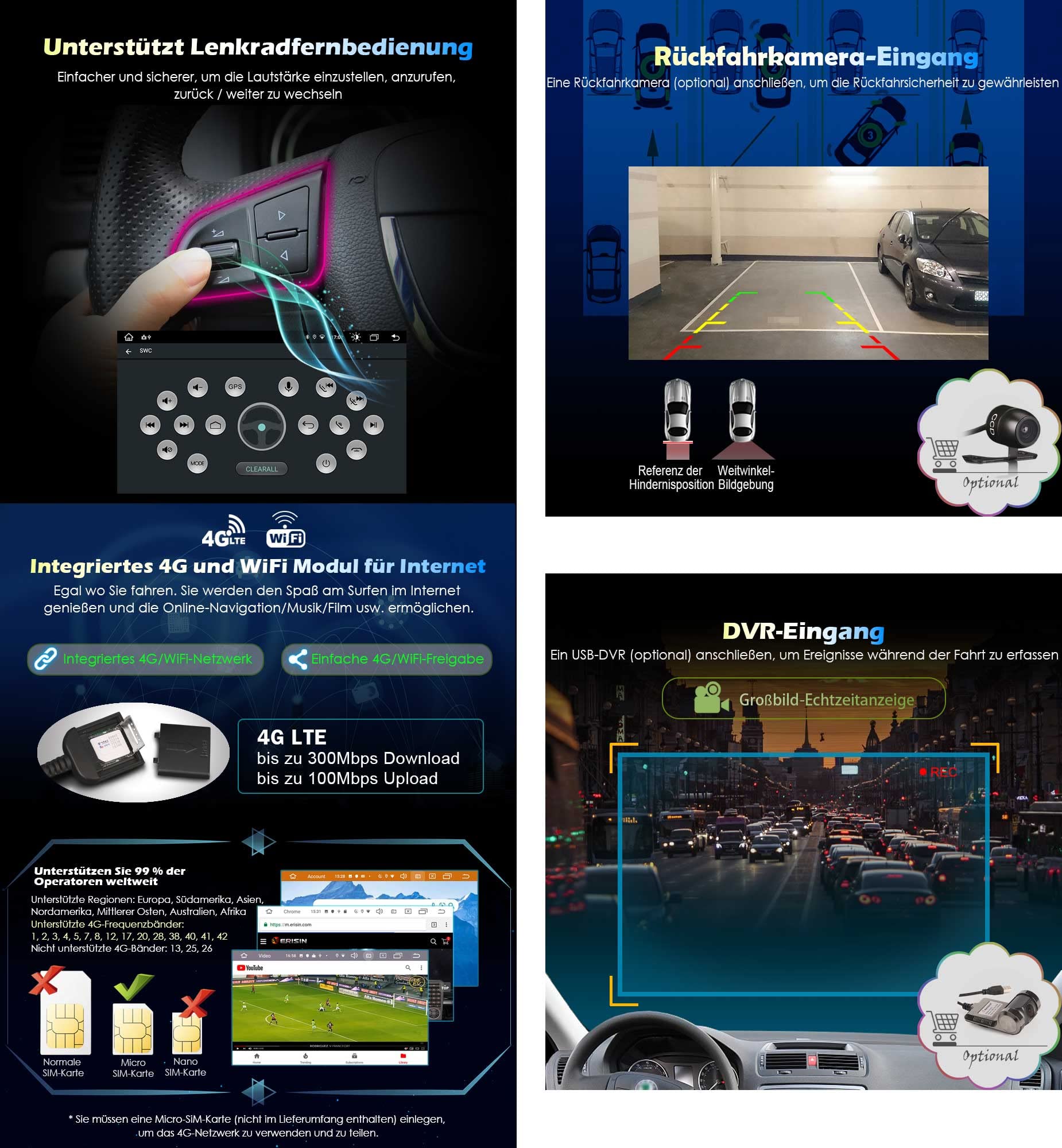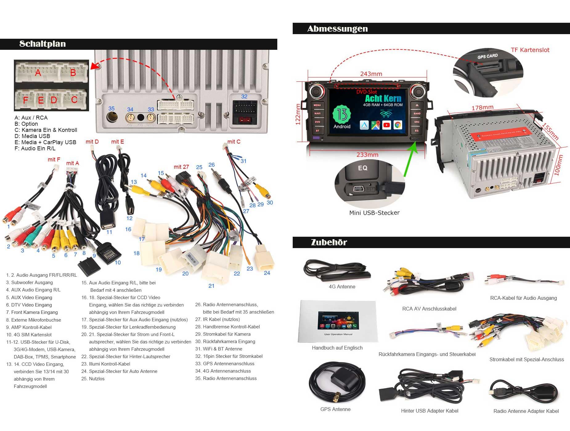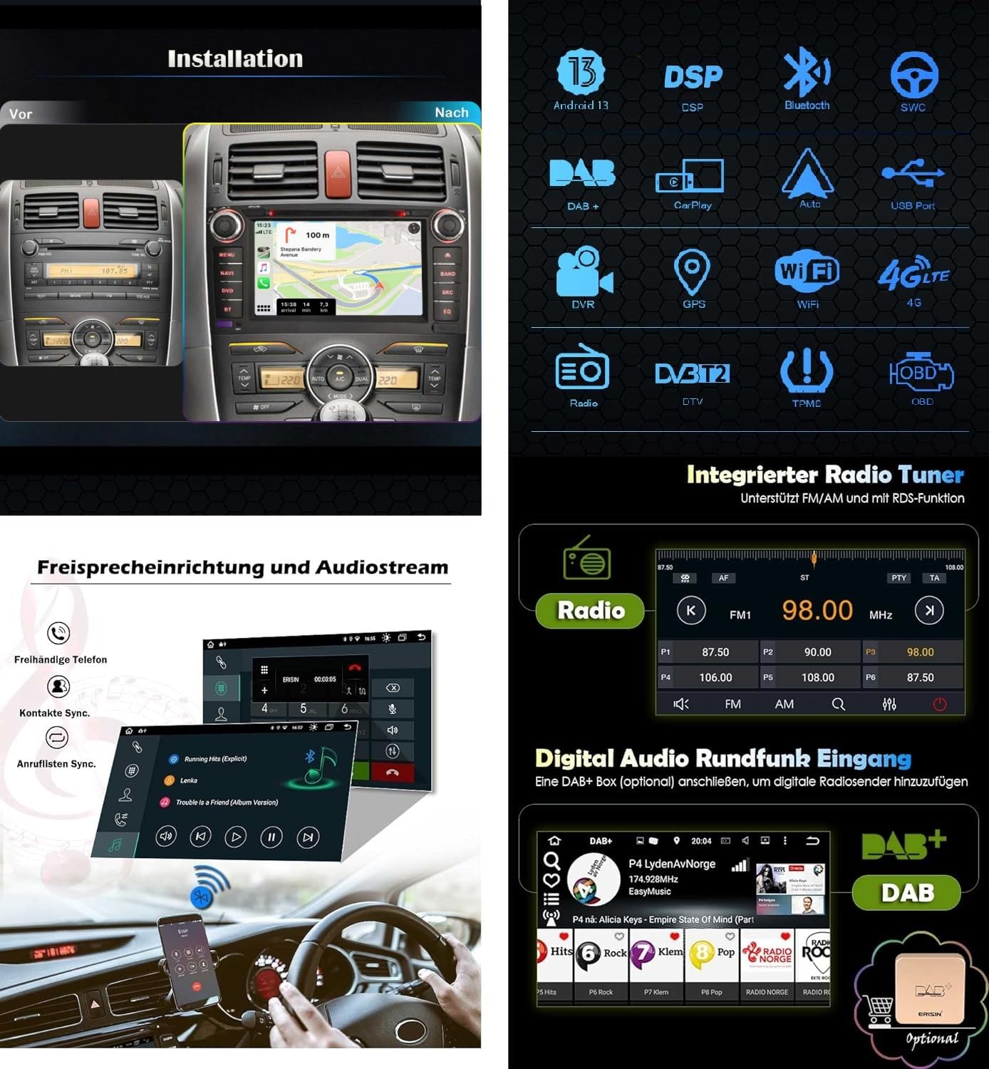 ["【Android 14, 8 Core, 4GB RAM+64GB ROM】7 inch car radio with navigation for Toyota AURIS 2007-2012. CPU: Octa Core, 2*A75+6*A55 64-bit 2000MHz CPU Architecture, Benchmark Scores over 200000, 4GB RAM & 64GB ROM, canbus decoder included. Supports 1 TF card/2 USB up to 3*128GB extended storage. 7-inch HD touchscreen (1024*600), ultra-clear Full HD display. Swift and responsive, like your latest smartphone. Audio output power: 4*48W.","【Wireless Carplay & Android Auto & DSP Amplifier】✔ Connect your iPhone via Bluetooth/your Android phone via USB/Bluetooth to this car radio for on-the-go access to GPS, calls, and music from mobile phones. Seamlessly integrate your phone for outdoor screen use, making your driving easier and safer. ✔ Built-in digital sound processor, 30-band real EQ selection, 5 sound effect adjustments, enjoy the ultimate audio experience.","【GPS Navigation & 4G & Dualband WiFi】✔ Sat Nav/GPS navigation pre-installed local offline maps. Online maps are also supported after an internet connection. You can install map/navigation apps (iGO, Waze, Sygic, HereWeGo) according to daily use. ✔ Integrated dual-band WiFi module and 4G module, access the internet via hotspot or micro SIM card, easier and faster for online navigation, music, movies, etc. More choices while driving.","【Steering Wheel Control + Bluetooth 5.0】✔ Supports steering wheel control to easily answer calls, change music, adjust volume, and other car functions while driving, allowing you to focus on the road. ✔ Built-in Bluetooth 5.0, supports hands-free calls, reading and browsing the phonebook, playing music while driving, allowing you to focus on the road.","【Multiple Functions】✔ Built-in CD/DVD player ✔ Radio tuner (FM/AM) with RDS. ✔ Android multimedia player, can play music/video/photo from USB/SD/CD/DVD player, supports 1080P videos. ✔ Panel light colors/wallpaper/boot logo/language adjustable. ✔ Supports DAB+, DVB-T/T2, TPMS, OBD2, DVR, rearview camera, AVIN, etc., requires optional devices."]