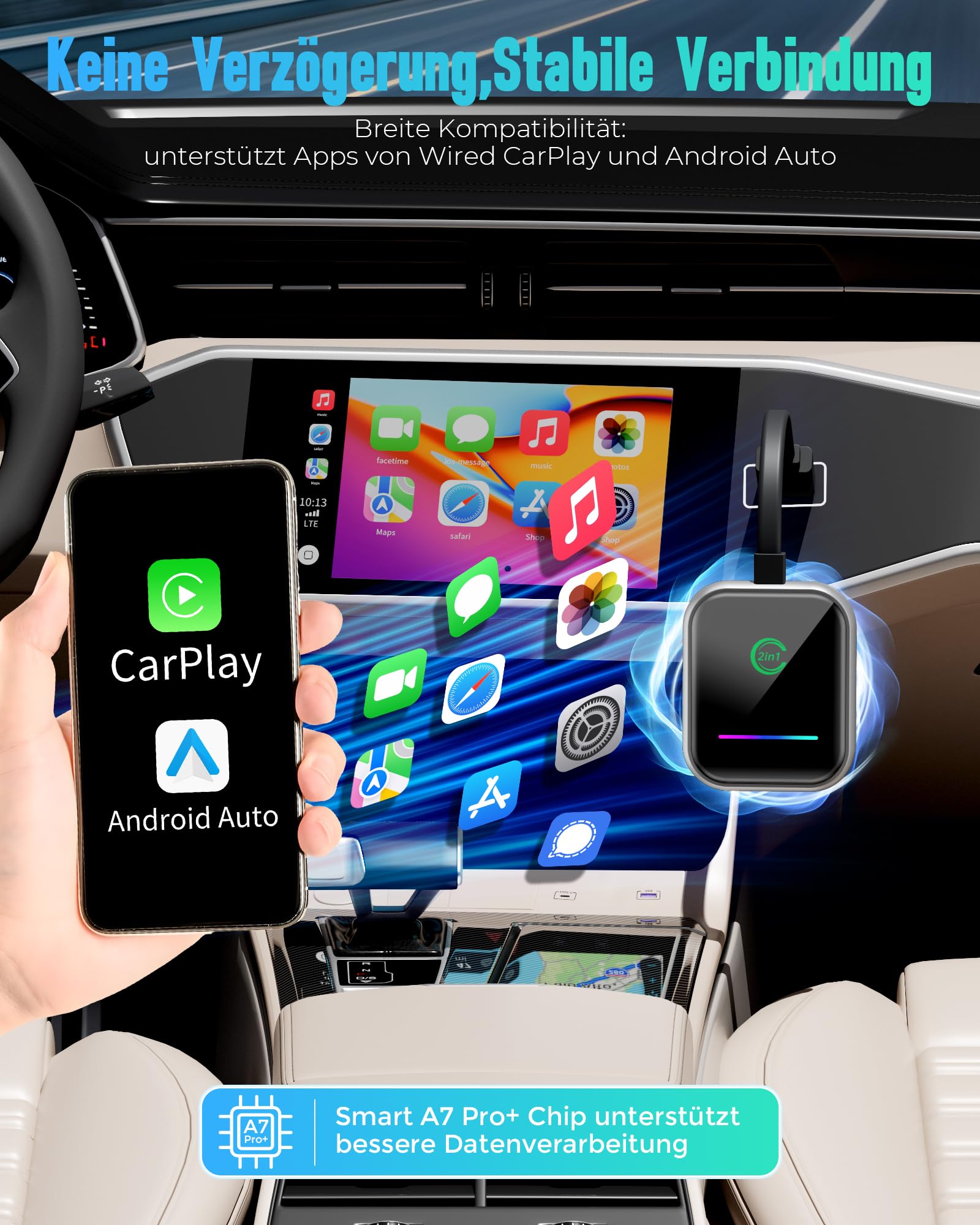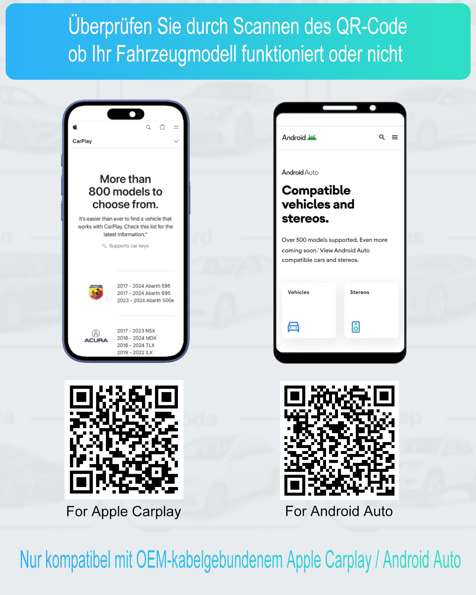 ["2-in-1 Android Auto & Carplay Wireless Adapter: Turn your wired Android Auto/Carplay into a wireless device easily and make your driving experience more convenient and magical. No drivers or apps required. Simply connect to your phone's Bluetooth and Wi-Fi, and Android Auto/Carplay is ready to go. The wireless Carplay and Android Auto adapter automatically connects to your phone when you start the car, even if your phone is in your pocket or you're on a call.","Fast 5.8GHz WLAN Transmission: With advanced 5.8GHz WLAN connection technology, the transmission of the wireless adapter is more stable and faster, providing a stable and uninterrupted connection at all times. Easy setup, with wireless connection established in just 3 steps: 1. Plug the wireless dongle into your car's USB port. 2. Set up Bluetooth and Wi-Fi connectivity properly. 3. After successful pairing, wireless CarPlay/Android Auto is ready.","Wide Compatibility: The wireless adapter is compatible with 98% of cars on the market that support wired Carplay and Android Auto. Allows you to access core functions like GPS navigation, music, phone calls, messages, and Siri through the steering wheel and integrated controls. Please ensure your phone also supports Carplay/Android Auto. For optimal performance, we recommend using iOS 10 and higher or Android 11 and higher.","Plug-and-Play, Automatic Connection: The wireless Carplay and Android Auto adapter is a great accessory to enhance your driving experience. Plug & Play, a convenient and effortless solution for connecting your iOS or Android phones to your wired Carplay or Android Auto vehicles (model year: 2017 to 2024). The simple plug-and-play setup ensures a seamless connection between your car and your smartphone. Includes a 2-in-1 USB and Type-C adapter, supporting both USB and Type-C carport access.","Online Upgrade and Professional Customer Service: Our Carplay Wireless Adapter supports online upgrades to address some issues. High-end quality at a reasonable price - save money without compromising on performance! 24-hour email response customer service for troubleshooting. We have manufactured under strict quality standards to ensure our customers receive the best quality experience.","⚠️Not supported: currently BMW/Tesla/Jeep Compass/Honda Civic/Toyota Corolla. (No factory-wired Carplay/Android Auto cars) Please scan the QR code to check if your car model works or not."]