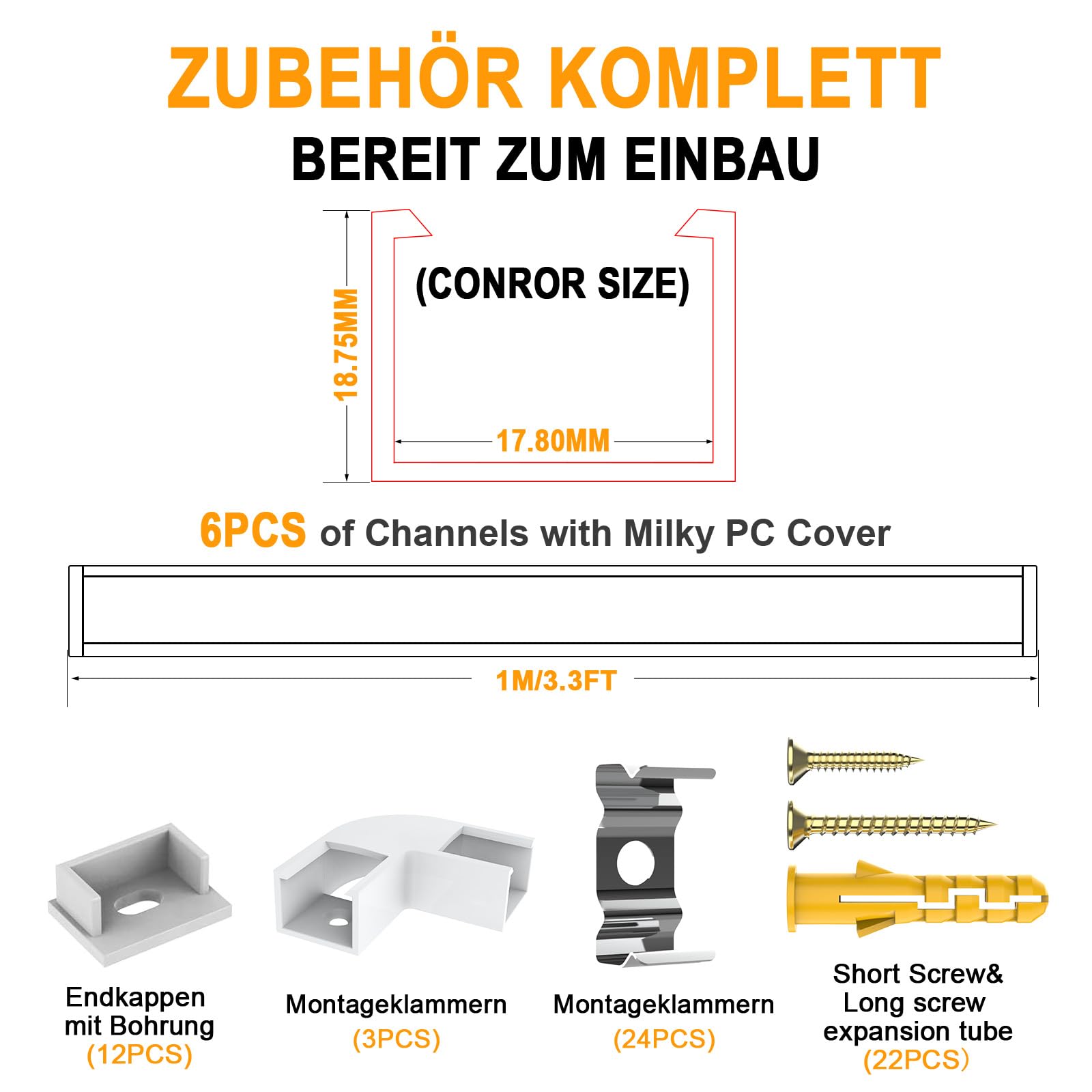 ["Fits Most Popular LED Strip Types】16mm inner width for you to install any LED strips. Fits most popular LED strip types (Philips Hue LightStrip, SMD2835, 3528, 5050 & 5630 LED strips). It can be cut and customized to fit any lighting project.","【Black U-shaped LED Channel with Milky White Cover】: Aircraft-grade aluminum, better heat dissipation, provides great protection for delicate LED light strips. Not only do the aluminum LED profiles dissipate the heat generated by the LEDs, but the end caps and cover protect the rail from dust, hair, and physical elements.","【LED Strip Diffuser Cover】Black channel with milky white cover provides a beautiful diffuse light, comparable to the neon effect, perfect for decoration and accent lighting, suitable for balconies, living rooms, bedrooms, closets, kitchens, and any other occasion you desire.","【Easy to Install】Simply insert the adhesive back of the LED light strip into the channel, snap on the diffuser cover, and mount the channel whenever you like.","【Package Include】6 x 3.3FT/1M aluminum channels with covers (x6), end caps (x12), and mounting clips (x24). 22x long screw, 22x short screw, 3x 90-degree corner connector. If you have any questions about this item, please contact us via Amazon message."]