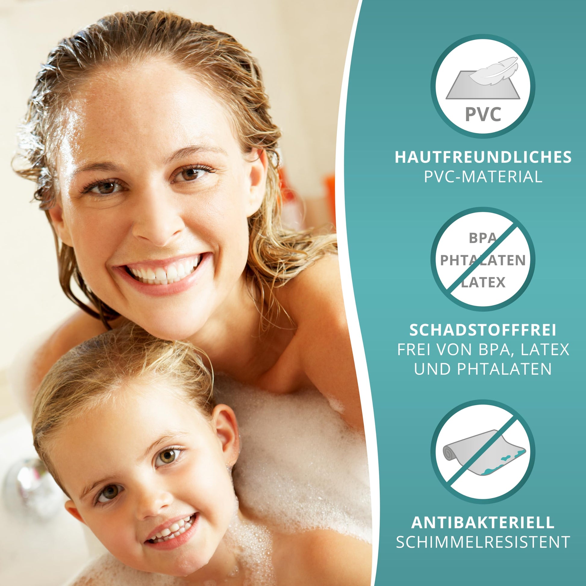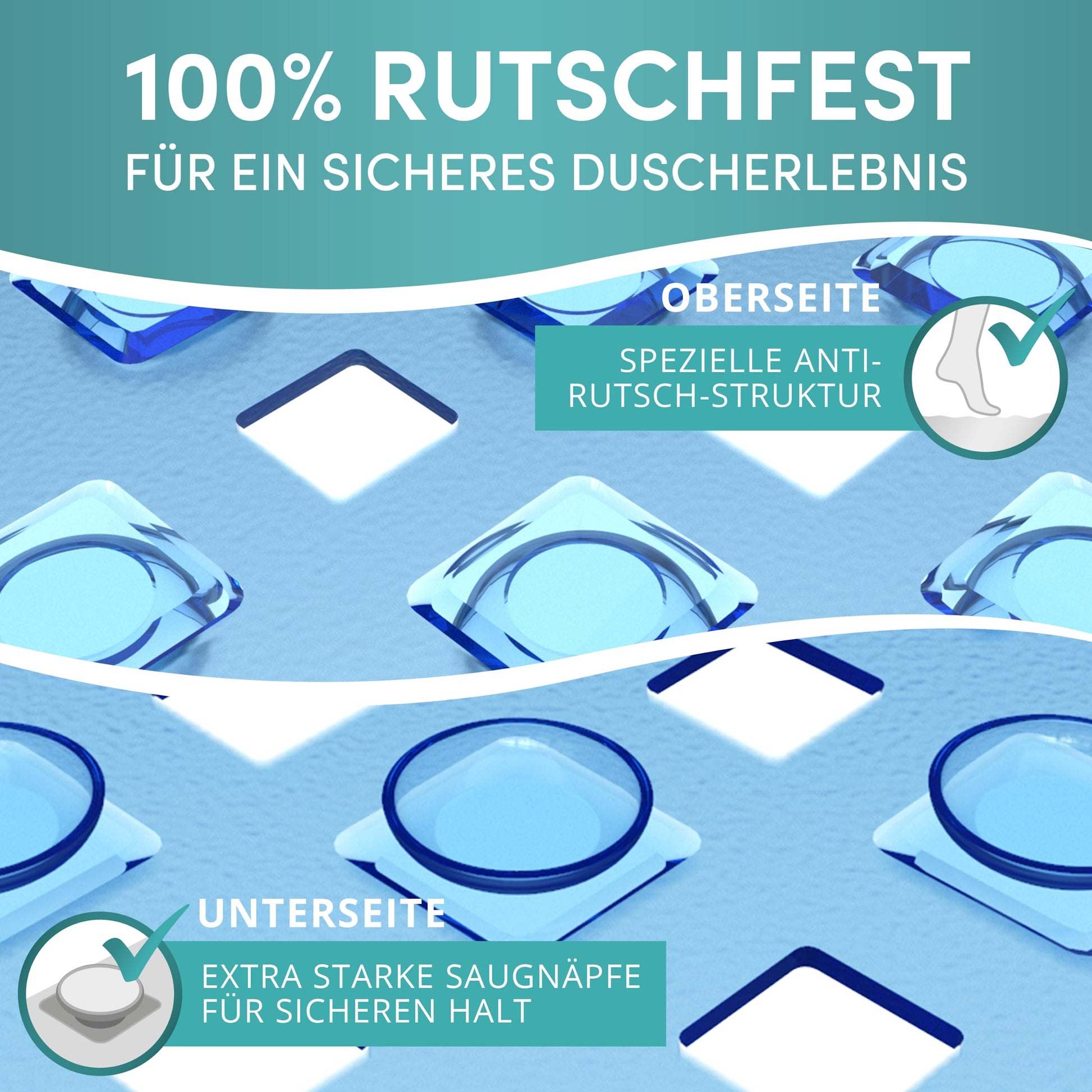 ["NON-SLIP & UNIVERSAL - Our non-slip shower mat provides stable grip on smooth surfaces and fits in any shower.", "INCLUDES HOOKS FOR DRYING - Two self-adhesive hooks allow for easy hanging and can be removed without residue.", "MACHINE WASHABLE - The anti-slip mat can be hygienically cleaned at 30° and remains permanently antibacterial.", "ODOR & MOLD RESISTANT - Special material structure drains water, prevents mold formation, and keeps the shower mat hygienically dry.", "SKIN-FRIENDLY & ODOR-FREE - Free of latex, BPA, and toxins - ideal for babies, children, seniors, and pets."]
