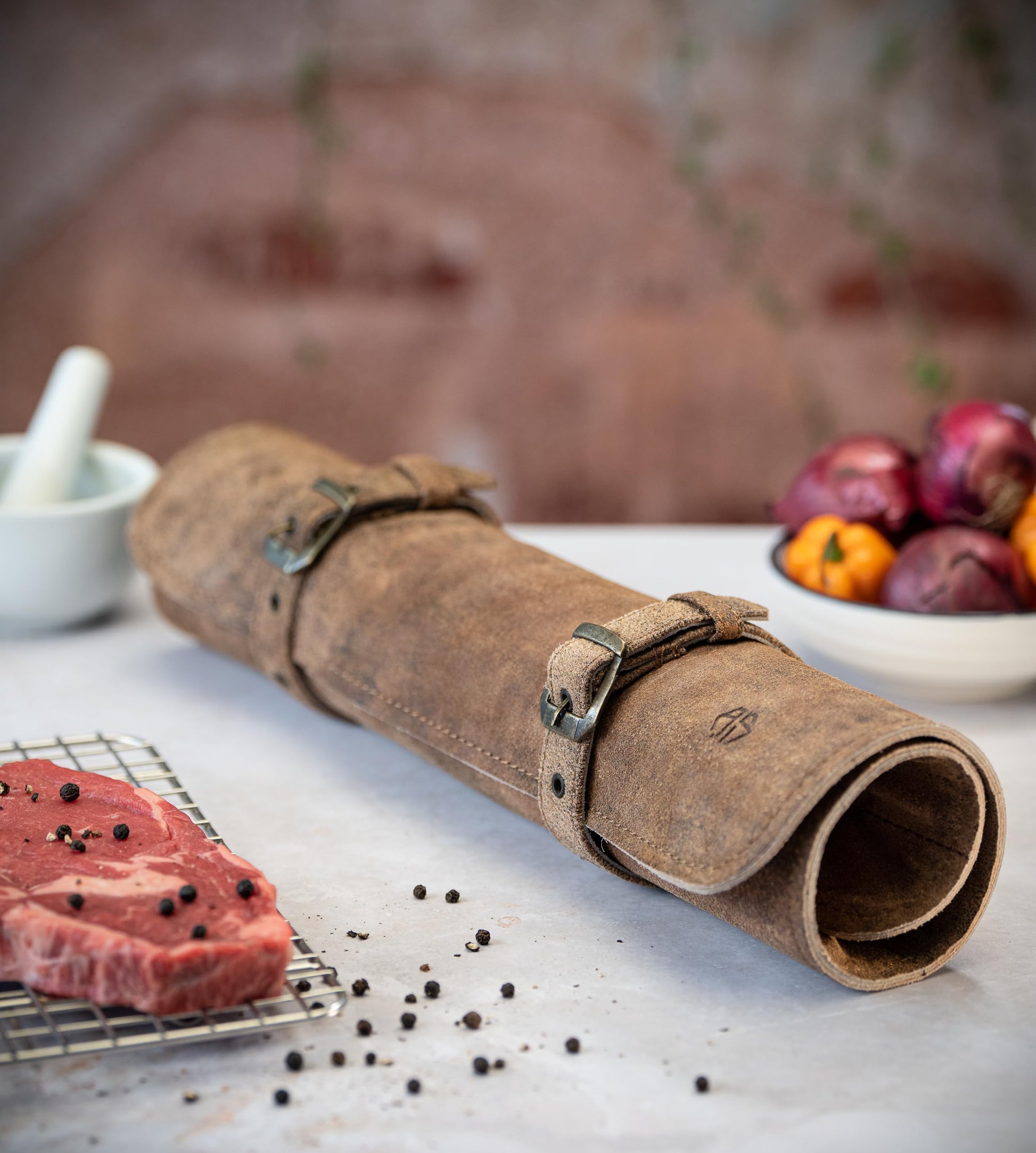 LEATHER KNIFE CASE: The roll bag is made of high-quality buffalo leather. This makes the knife bag extremely durable, easy to roll, comfortable to hold, and looks great.