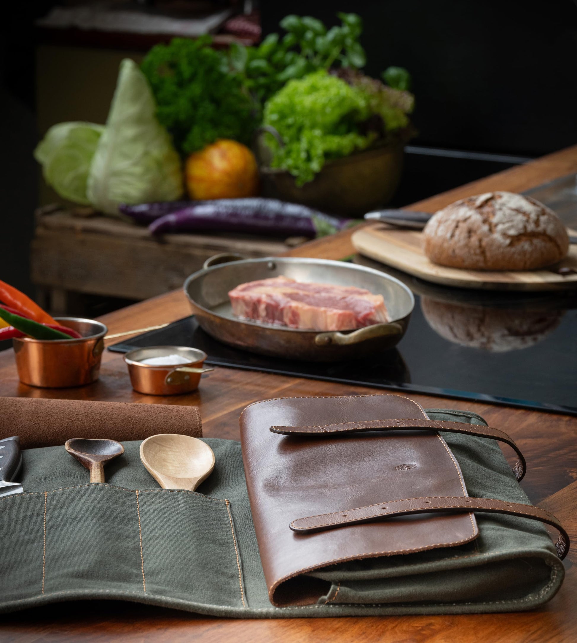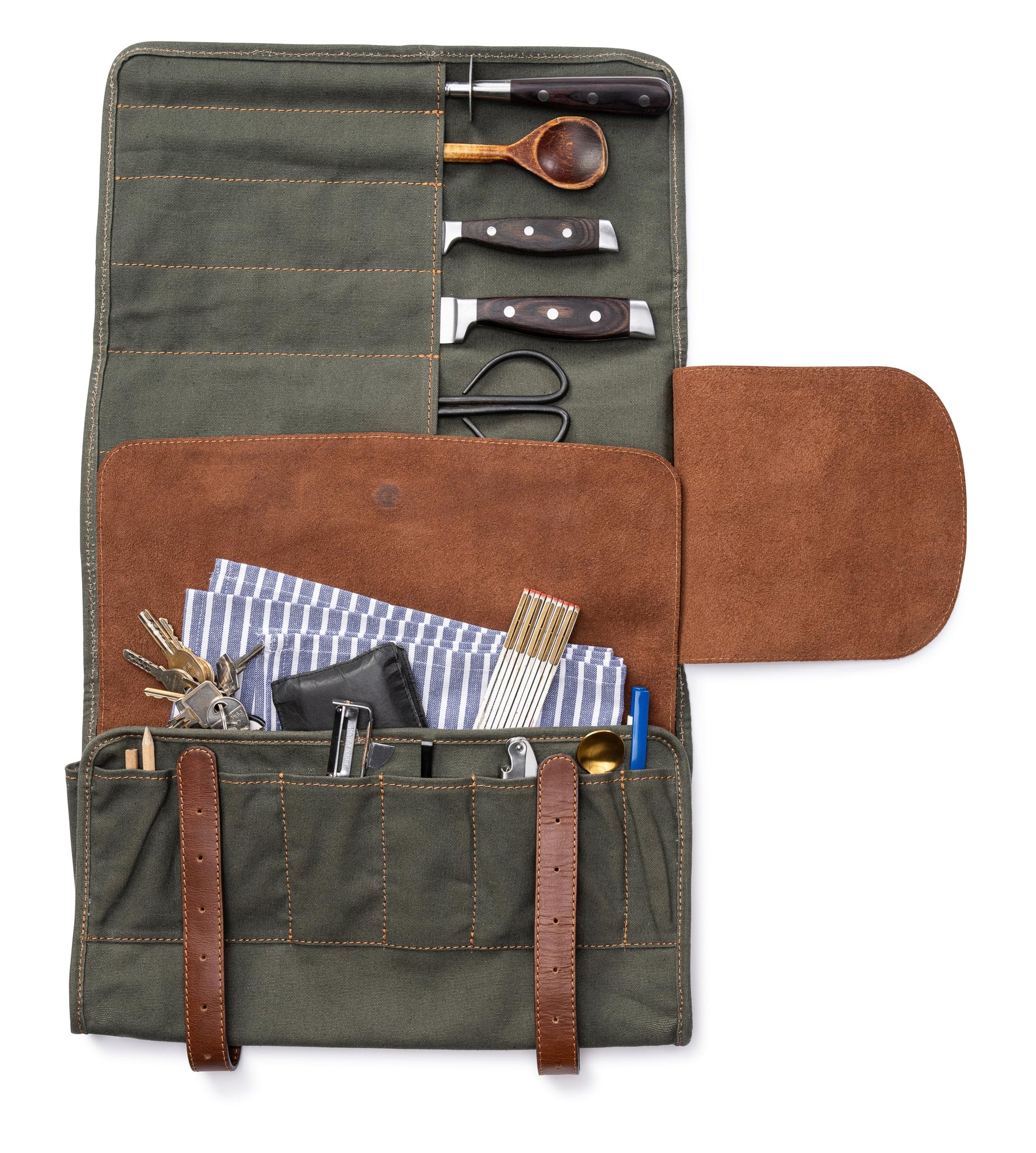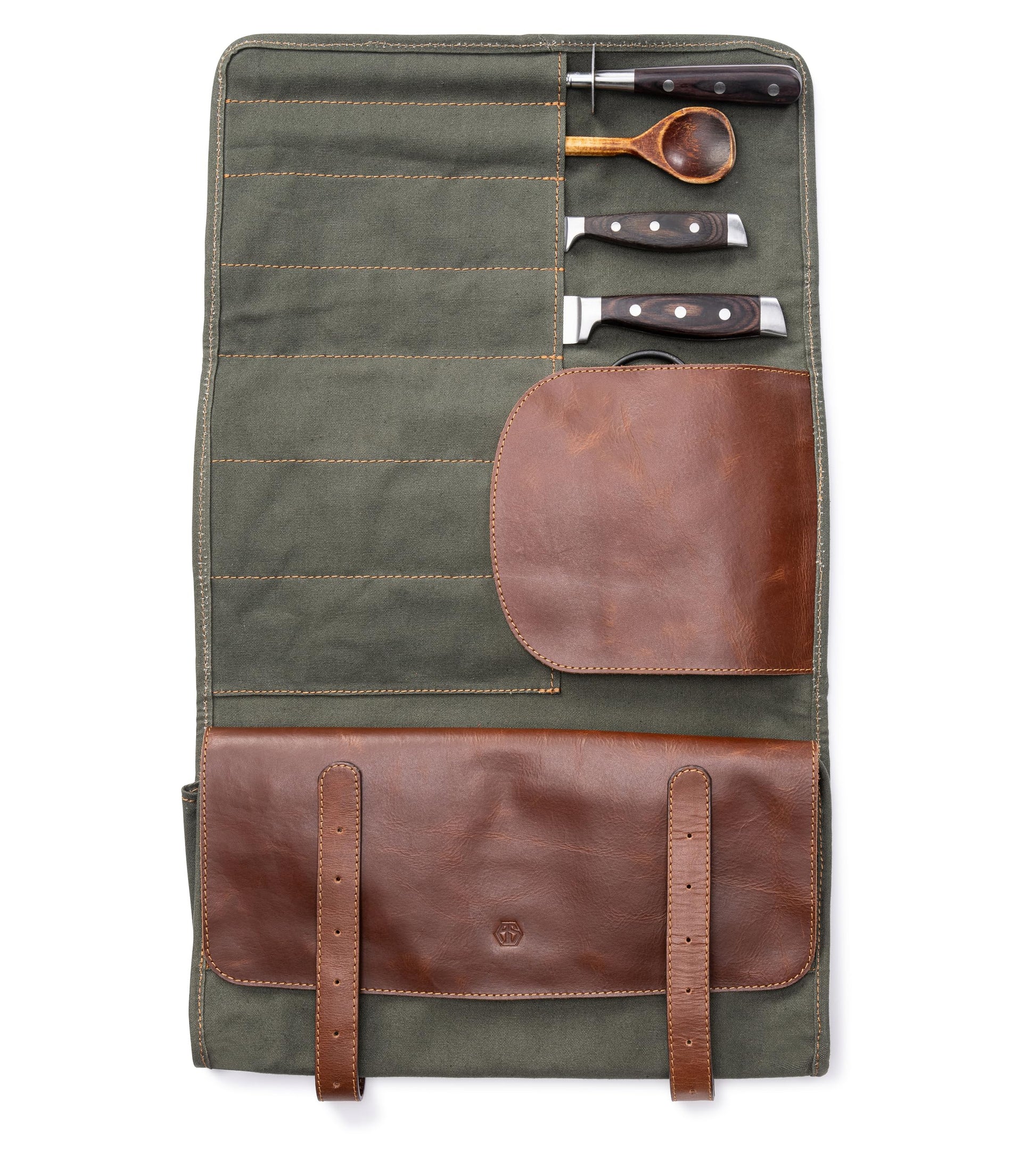 ["XXL KNIFE BAG & MULTIFUNCTIONAL BAG: The large and sturdy cooking knife bag Marc is made of high-quality canvas and buffalo leather, which is particularly durable and pleasantly soft. The bag has 14 knife/tool compartments ranging from 1.18 to 2.56 inches wide and two large slip-in compartments. The slip-in compartments can be securely closed with either a zipper or a leather strap.","HANDCRAFTED KNIFE ROLL BAG: The multitool bag Marc is handcrafted from high-quality canvas and leather, ensuring long-lasting durability. Dimensions when opened flat: 24.6 x 14.8 inches / closed: 8.9 x 14.8 inches / compartment widths: 1.18 inches to 2.56 inches","PRACTICAL & WITH MANY EXTRAS: The knife bag Marc is securely closed with two sturdy leather straps, so no knives can fall out during transport or storage. Practical for all professional and hobby chefs to transport their high-quality knives and tools","DESIGN & QUALITY & HANDMADE: Perfectly crafted with functional details in a classic, simple design, the knife bag Marc is an absolute classic for all chefs and craftsmen.","GOOD PRICE & BEST PERFORMANCE: At Angus Stoke, we make knife bags that are high quality and unique in design. Quality is not just a slogan for us! If, despite all our efforts, you are ever unsatisfied with one of our products, do not hesitate to contact us. We will find a solution. Our customers are important to us even after the purchase."]