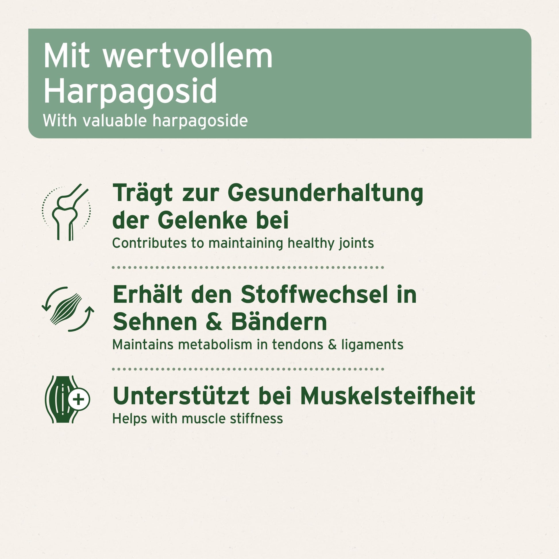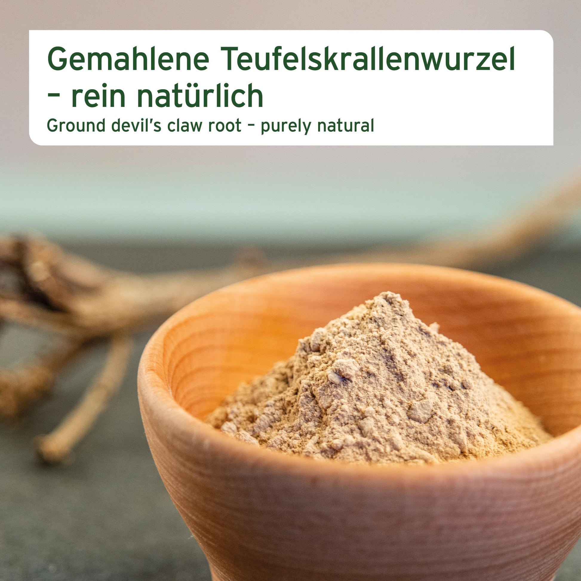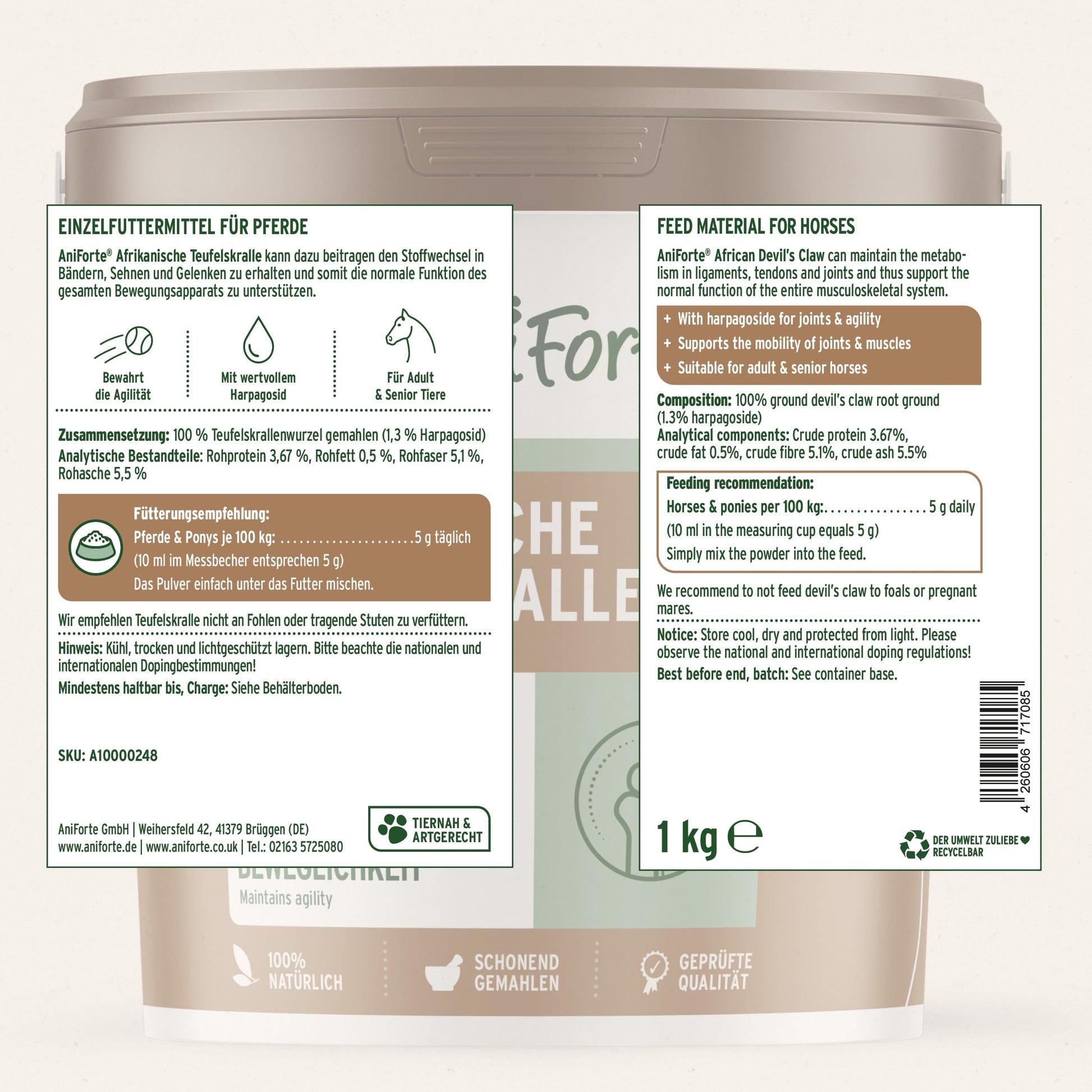 ["NATURAL PRODUCT: To support joint function & mobility of joints & muscles. Devil's claw supports metabolism in ligaments, tendons & joints - for more joy of movement","FOR JOINTS: The purely natural devil's claw powder has a positive effect on the health of the joints & the entire musculoskeletal system - for new agility during rides","NEW QUALITY OF LIFE: Ground devil's claw root as a natural support for muscle stiffness. Many users report a supportive effect on degenerative diseases","EASY FEEDING: The sensible feed supplement is highly accepted by horses & ponies - simply mix the specified amount with normal feed - simple & effective","NATURALLY WITH LOVE: To provide the best possible support for your animal's health, we always incorporate a lot of expertise from animal naturopaths & veterinarians - even when choosing the right devil's claw powder"]