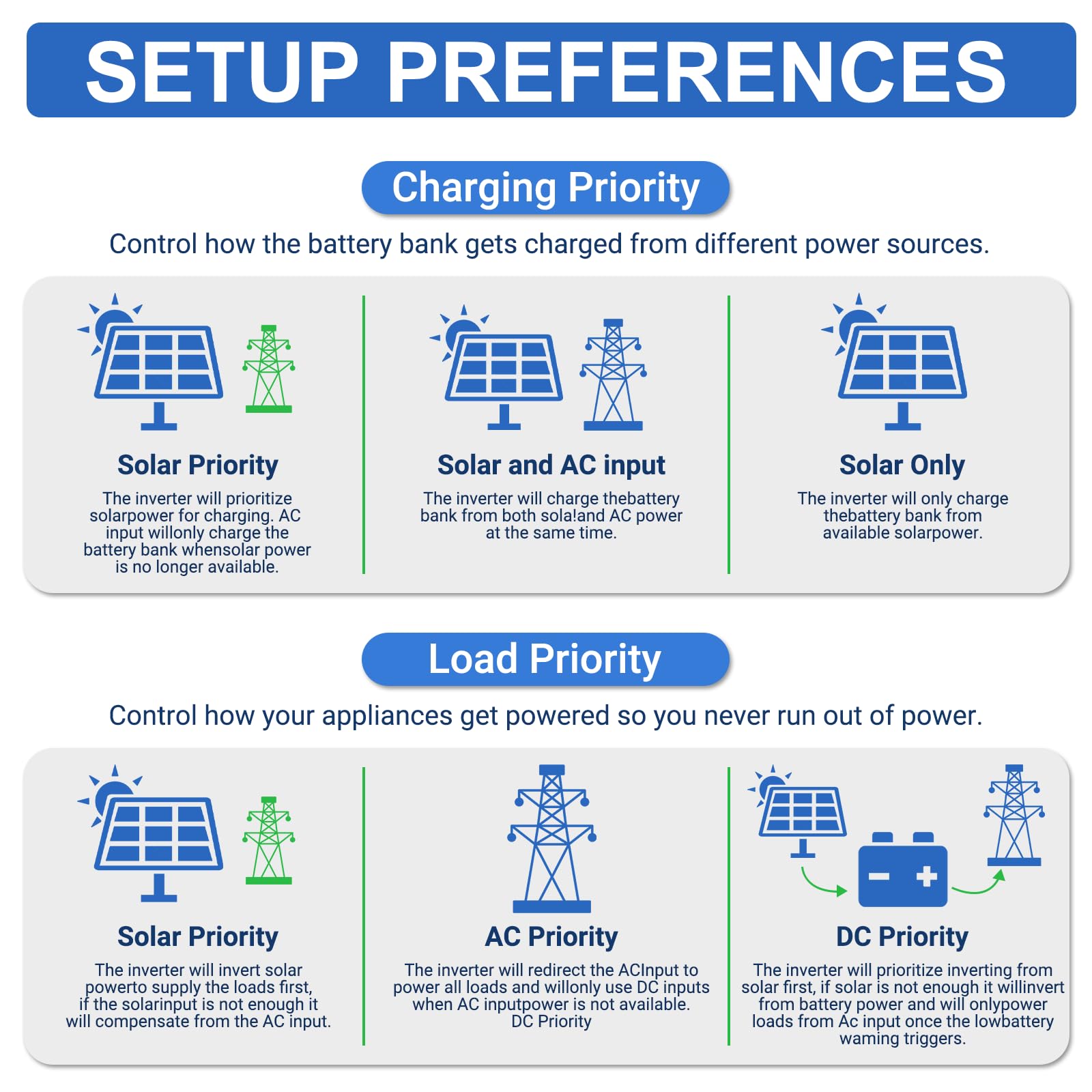 ["Off-Grid Inverter Specification: This off-grid inverter supports parallel function and can operate up to 12 inverters in parallel, meaning it can handle a maximum of 6200W*12 solar power and 6200W*12 AC output power system. 6.2KW Solar Hybrid Inverter Output Voltage Regulation: 230Vac±5%, PV Rated Power: 6200W; Max PV Array Open Circuit Voltage: 500VDC, PV Array MPPT Voltage Range: 60VDC~500VDC, Max. Charge Current 120A, Max. Solar Input Current 27A.", "Battery with and without Battery: The Aninerel Series Hybrid Inverter 48v features a conventional operation mode with batteries, but also has the option to operate without batteries. The inverter can supply loads from the PV array/AC grid without a battery connected. Add a BMS (Battery Management System) to monitor battery status and prevent overcharge and deep discharge to extend battery life.", "More Load and Availability: The 6200W Off-Grid Hybrid Inverter 48V has 4 optional charging modes: Solar Priority/Utility Priority/Solar and Utility/Nominal Solar. 3 output modes: Solar Priority (SUB), Utility Priority (USB) and SBU mode, which can meet your different application requirements. The solar inverter delivers stable and purer sine waves. It is the best choice for home and outdoor emergency power supply. Compatible with 48V lead-acid and lithium batteries.", "LCD Display: Solar inverters with LCD display can show system data and operation status in real-time. Users can configure the system according to their own energy needs. With error display and warning. Protects the safety of the system. Inverter supports WIFI remote monitoring (Equipped with WIFI module, no need to buy separately).", "Security: This pure sine wave hybrid inverter has overload, over-temperature, short circuit, overcurrent, and overvoltage protection, automatic restart function when power is restored, as well as a cold start function that can protect your devices well. Inductive loads require higher starting power, so choose an inverter with 3-5 times the rated power. A 48V battery must be connected for starting.", "Brief Overview: 6200W Hybrid Solar Inverter 48V can power household appliances and office equipment such as fans, lights, air conditioners, refrigerators, computers, and other household appliances, also suitable for RVs, camping boats, and so on."]