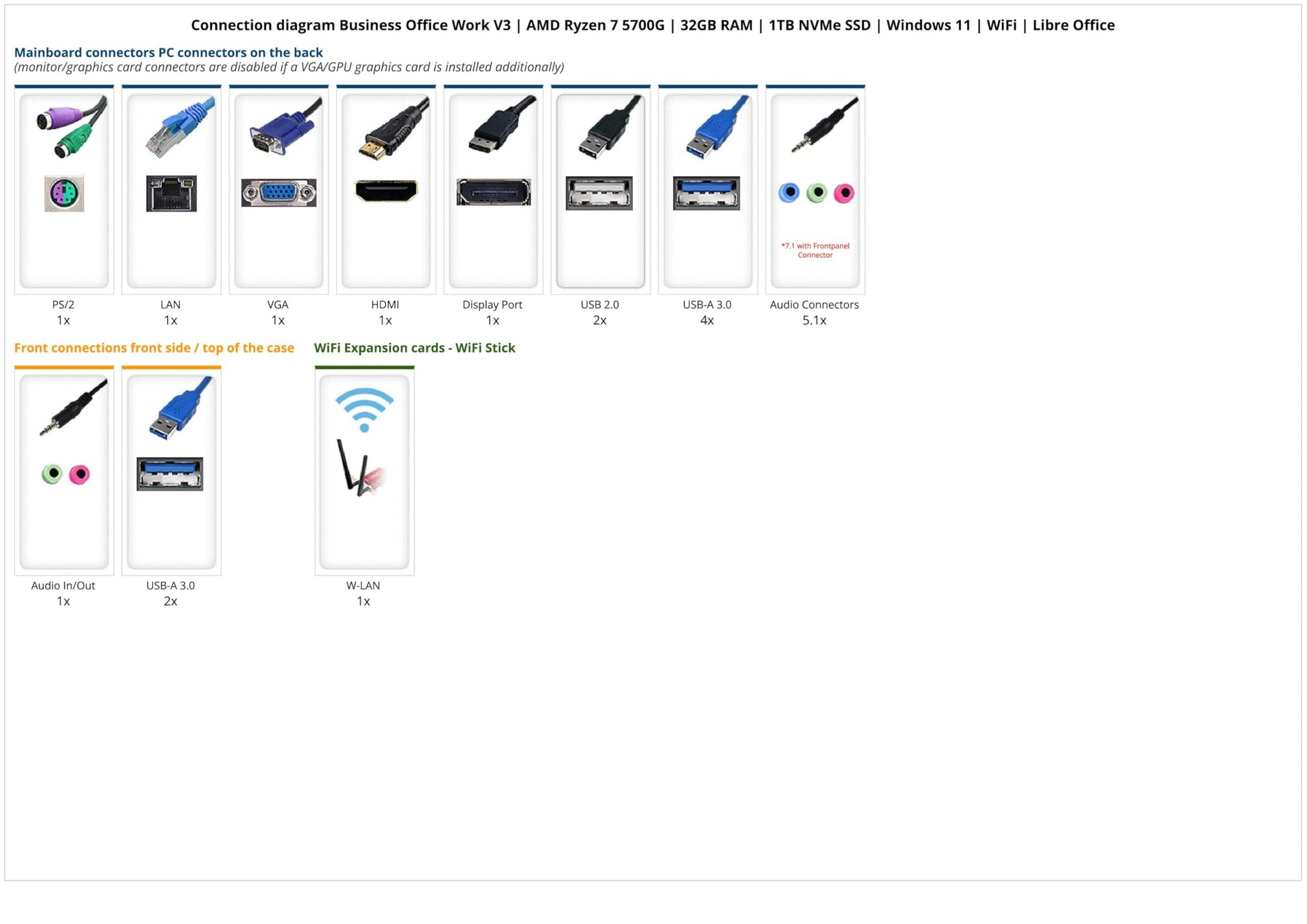 The PC is equipped with a 1000GB M.2 NVMe SSD. Expansion is easily possible through 4 S-ATA ports. Our Business Office Work V3 PC features an AMD Radeon Graphics. The PC offers the following connections: Audio In/Out(1x), USB-A 3.0(6x), W-LAN(1x), Audio Connectors(5.1x), HDMI(1x), USB 2.0(2x), PS/2(1x), Display Port(1x), VGA(1x), LAN(1x).