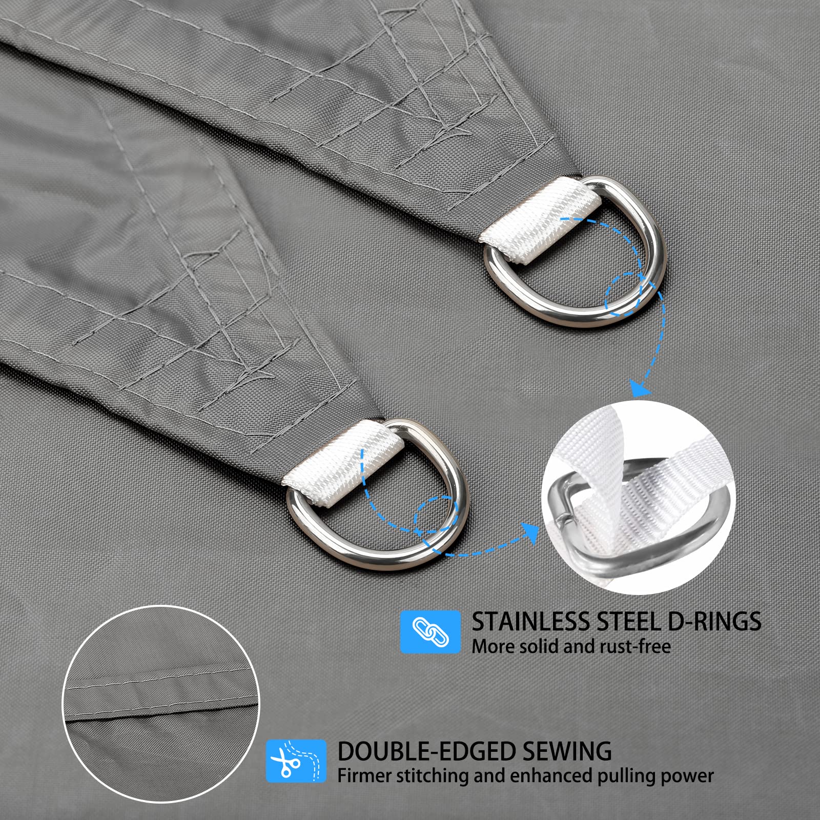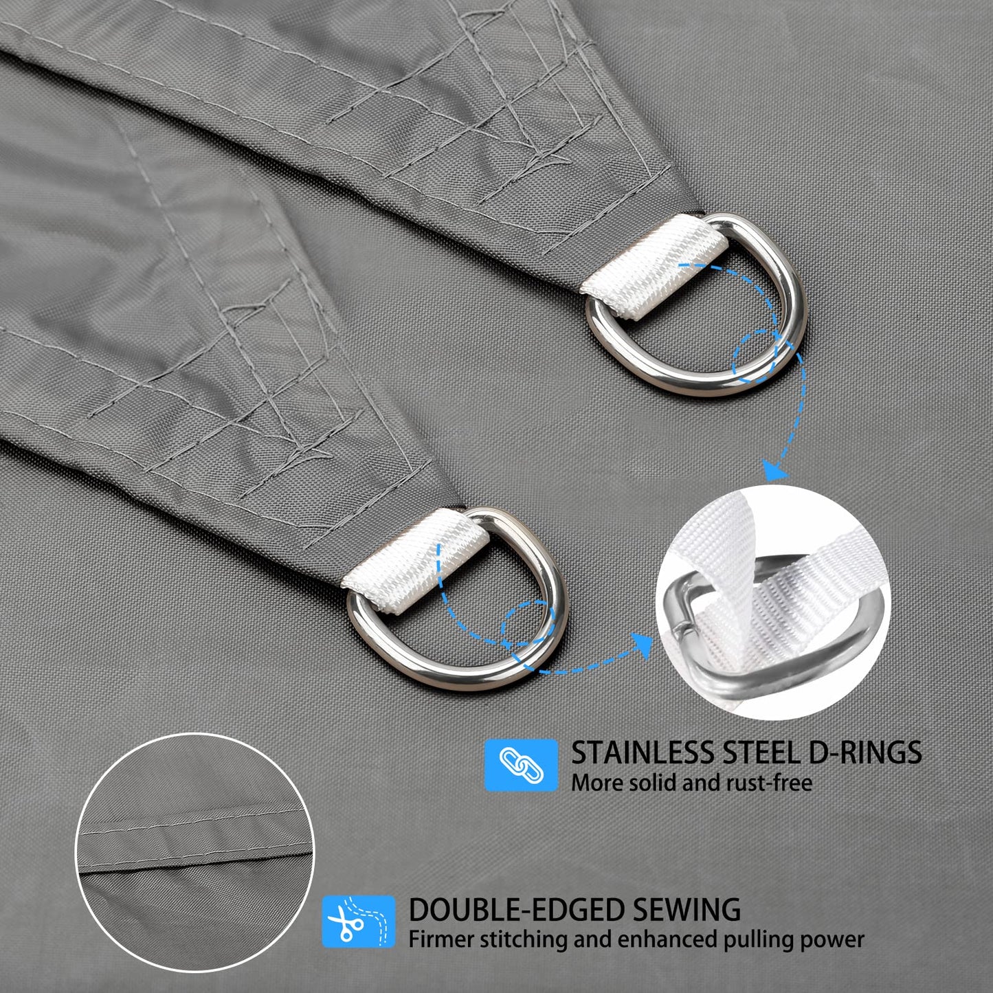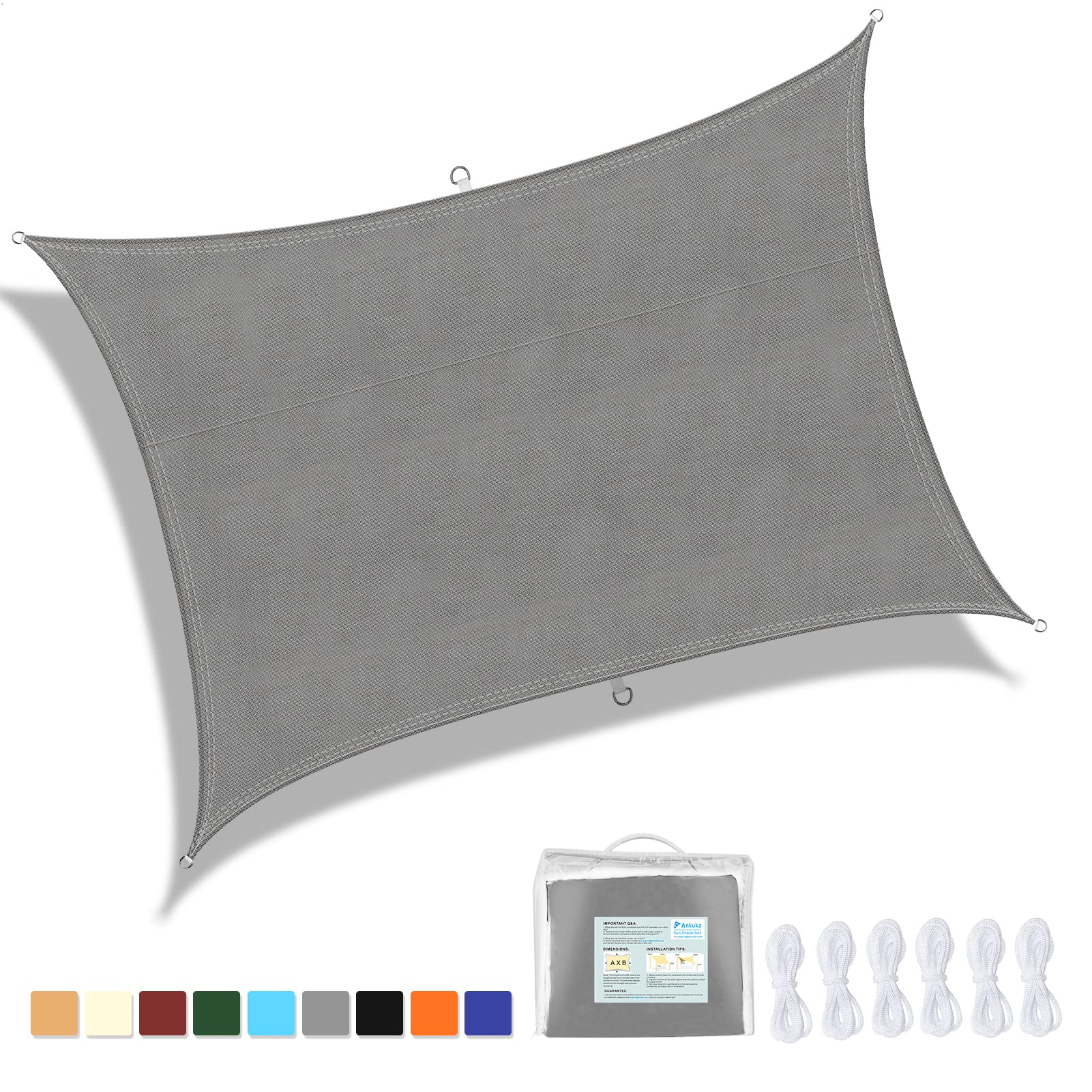 ["Environmentally friendly materials - Mainly made of high-density polyethylene composite fiber (220 g/m²), the product is easy to clean, corrosion-resistant, colorfast, and mold-resistant, cost-effective maintenance, no harmful gases even after long-term exposure to sunlight.", "Insulating and breathable - The high-density fabric can effectively block 98 UV rays and ventilate the space underneath. The waterproof product protects a certain amount of rain for a certain time.", "Stable construction: The curved edge provides stability to better withstand strong winds and external forces. Durable and strong stainless steel D-rings are securely attached on each side. Unique triple-layer twill tape reinforcement, the four corners are not easily torn.", "Easy installation: Easy and secure installation with rope or fixing kit. The recommended installation angle is 20 to 40 degrees for maximum tension and rainwater drainage, compatible with trees, fences, pillars, and walls, decorating yard, patio, pool, playground, barbecue, camping, etc. and allowing you to enjoy a beautiful time with friends and family.", "Scope of delivery: 1 x sun sail (waterproof, rectangular), 1 x bag, 4 x ropes."]
