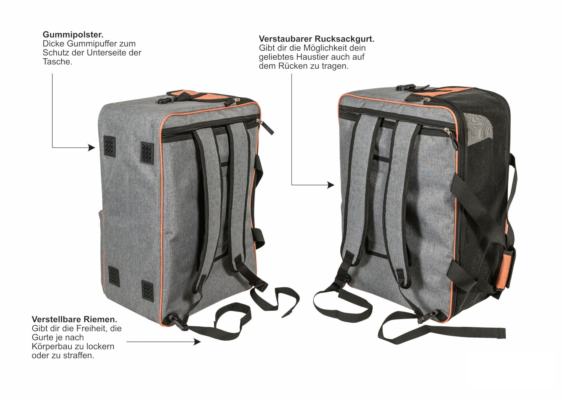 "Perfect size for air travel: This dog flight bag measuring 22x16x9 inches is ideal for most airlines and can accommodate small to medium-sized pets up to 26 lbs. Waterproof: Made of durable, water-resistant materials for a long lifespan. Comfort and ventilation: Soft, padded bottom and side mesh panels provide optimal airflow and maximum comfort for your pet. Versatile carrying options: With handles and can be used as a backpack, in addition to trolley attachment for easy mobility. Practical features: Large outer pocket for essentials, a small zipper for easy interaction with your pet."
