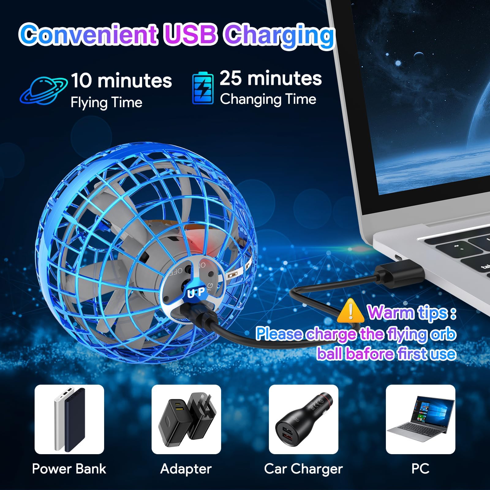 USB rechargeable and easy to carry: The flying ball has a diameter of only 8.6 cm and weighs just 30 grams, making it easy to carry around. The toy comes with a built-in battery and a USB charging cable. It charges quickly in 25 minutes and provides a flight time of about 10 minutes. The flying ball supports multiple charging modes, including a portable battery adapter, so you don't have to worry about battery life.