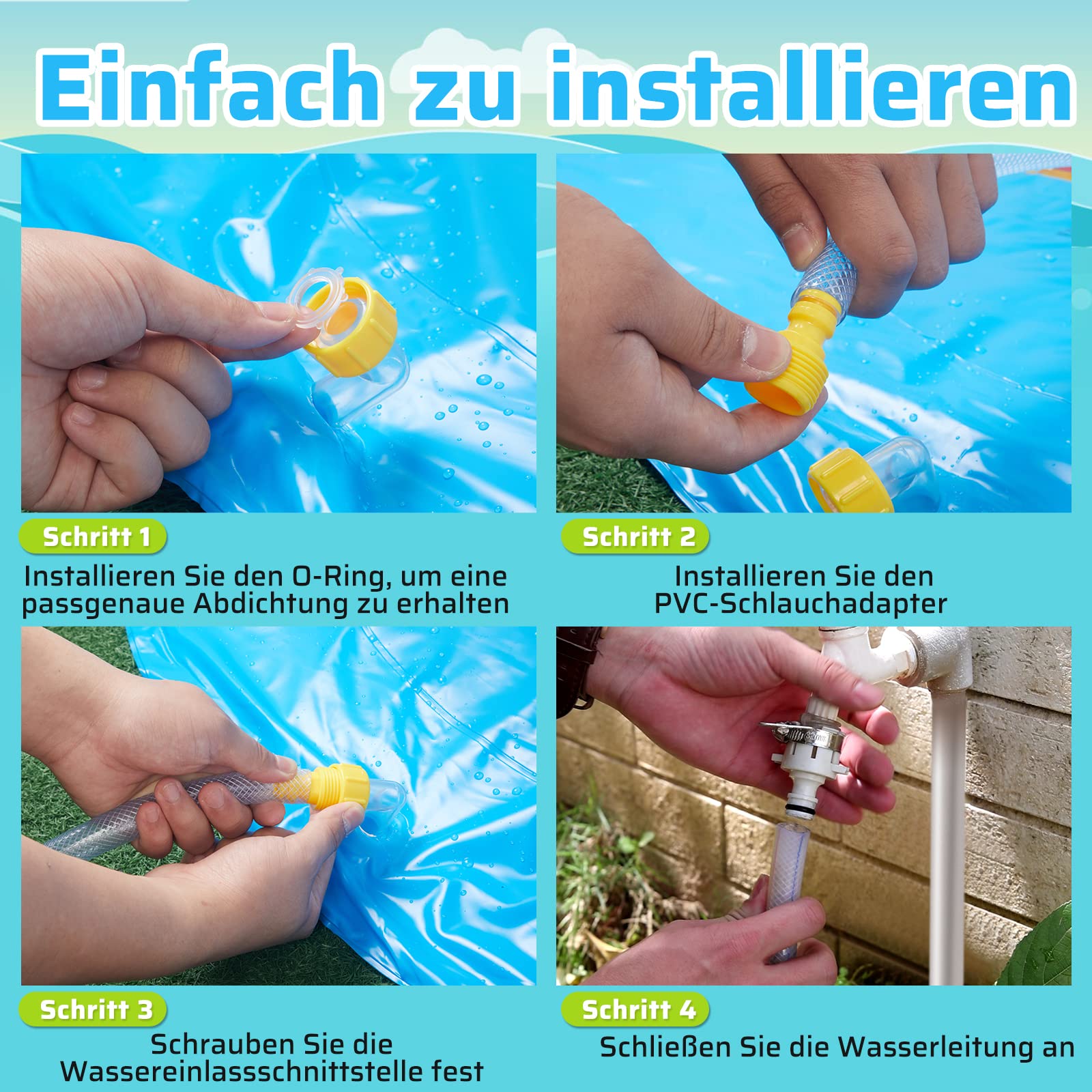"Material: Made of durable, soft and 0.22 mm thick PVC, not harmful to children's health, environmentally friendly and non-toxic. Original Technology: The original water filling technology provides a non-slip effect, allowing children to play more safely. Easy Handling: Simply connect the hose to adjust the height. Note: The height of the water jet, determined by water pressure, must not exceed 1.5m. Water jet mat with a diameter of 170cm, a hit for your summer joy. Fun: A great summer event that delights family and friends. Ideal for lounging, parties, pool or beach parties."