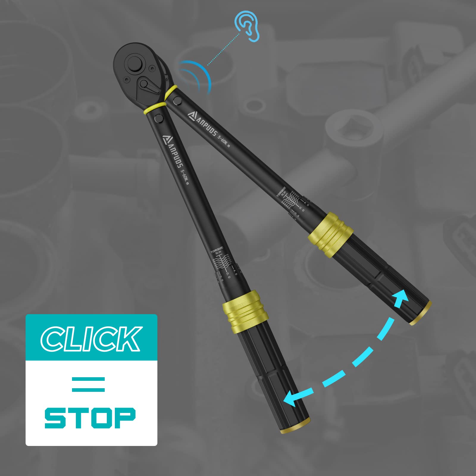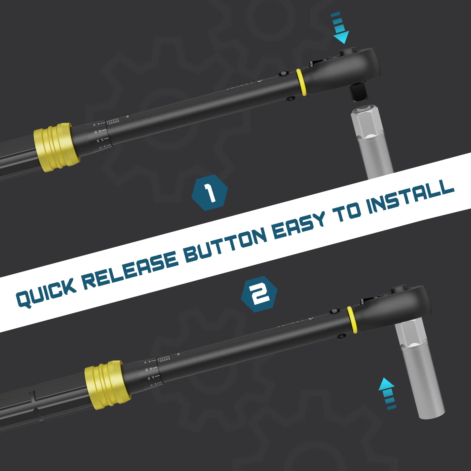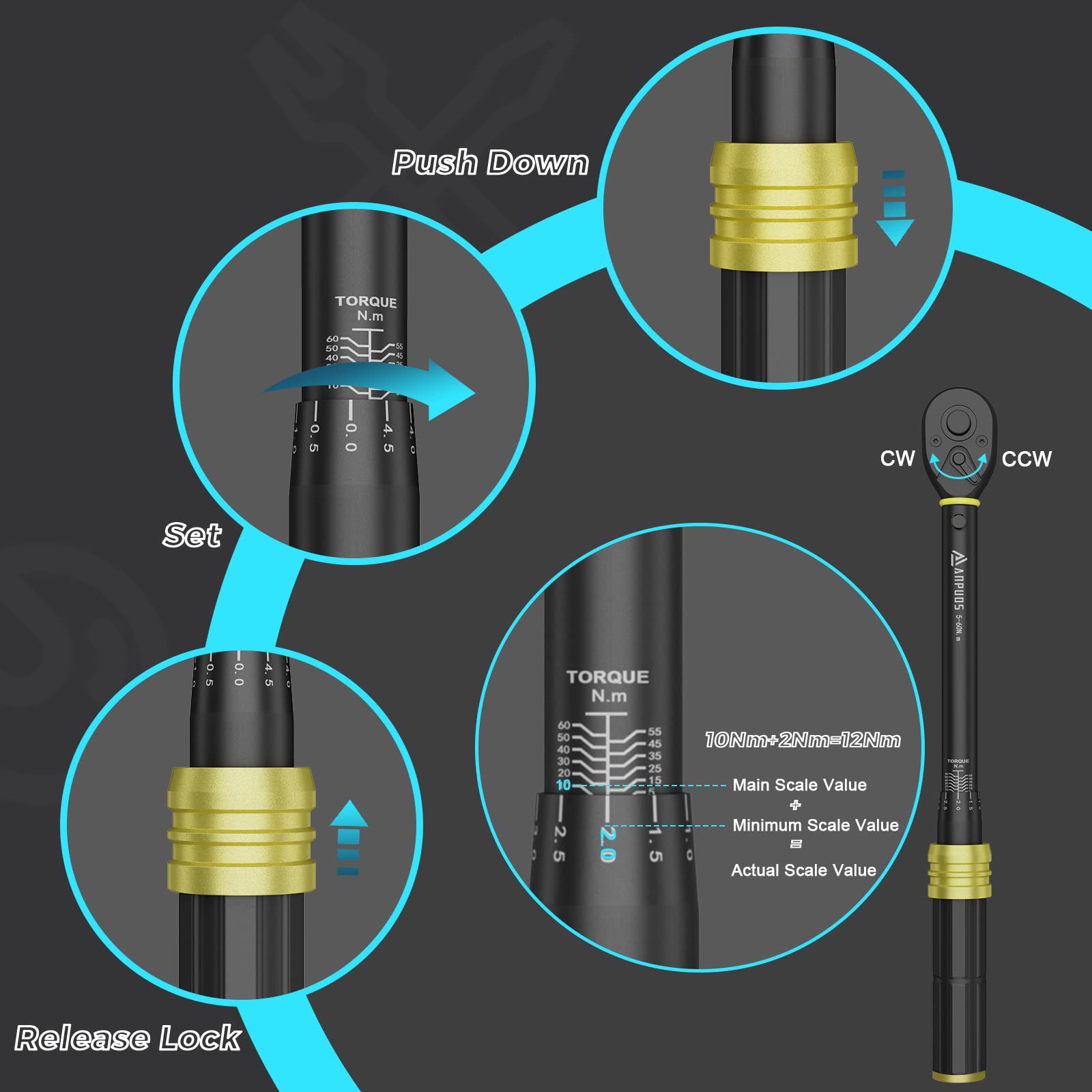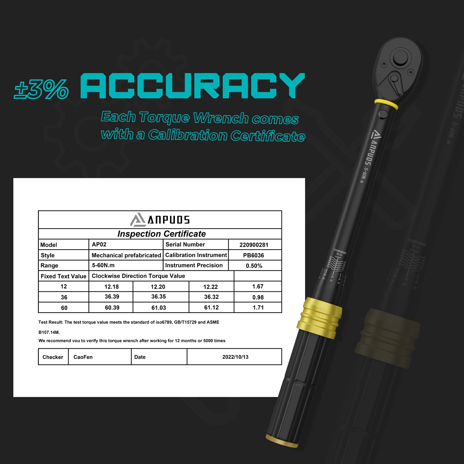 ["【±3% Accuracy】Each torque wrench is fully calibrated according to the requirements of ISO 6789-1:2017, DIN EN 6789-1:2017-07, and ASME B107.14M, with calibration error of ±3%. Individual calibration certificate included in each set. This 5-60Nm torque wrench is suitable for daily maintenance of bicycles, motorcycles, and cars.","【Secure Click Device】When the required preset torque value is reached, the torque wrench for bicycles emits a clear and audible \"click\" sound, accompanied by a distinct hand vibration reminder to stop applying force. The exquisite and beautiful handle effectively prevents slipping, saving time and effort, and improving work efficiency.","【Quick Release Button】The torque wrench for motorcycles is equipped with a quick release button, allowing sockets to be quickly mounted and exchanged with a click, securely holding the plug in place to prevent it from falling off. With the high-quality 72-tooth ratchet head, the direction of use can be set by the toggle lever for clockwise and counterclockwise operation.","【High Quality】This product includes a 3/8\" torque wrench and a storage box. This torque wrench features a high-quality aluminum tube body. A single torque wrench is as light as 390g and has high hardness. The key head is made of hardened chromoly steel, which is stronger than chromium vanadium steel. 3/8\" spark plugs, bits, and other accessories can be fitted to the ratchet head.","【Easy Setup】When using, first pull down the locking ring to unlock and hold it down. Then, start setting the desired torque value. Release the locking ring to complete the setting. This torque wrench for cars uses laser scale values that are clear, accurate, and easy to read. Set the wrench to the minimum torque value when not in use."]