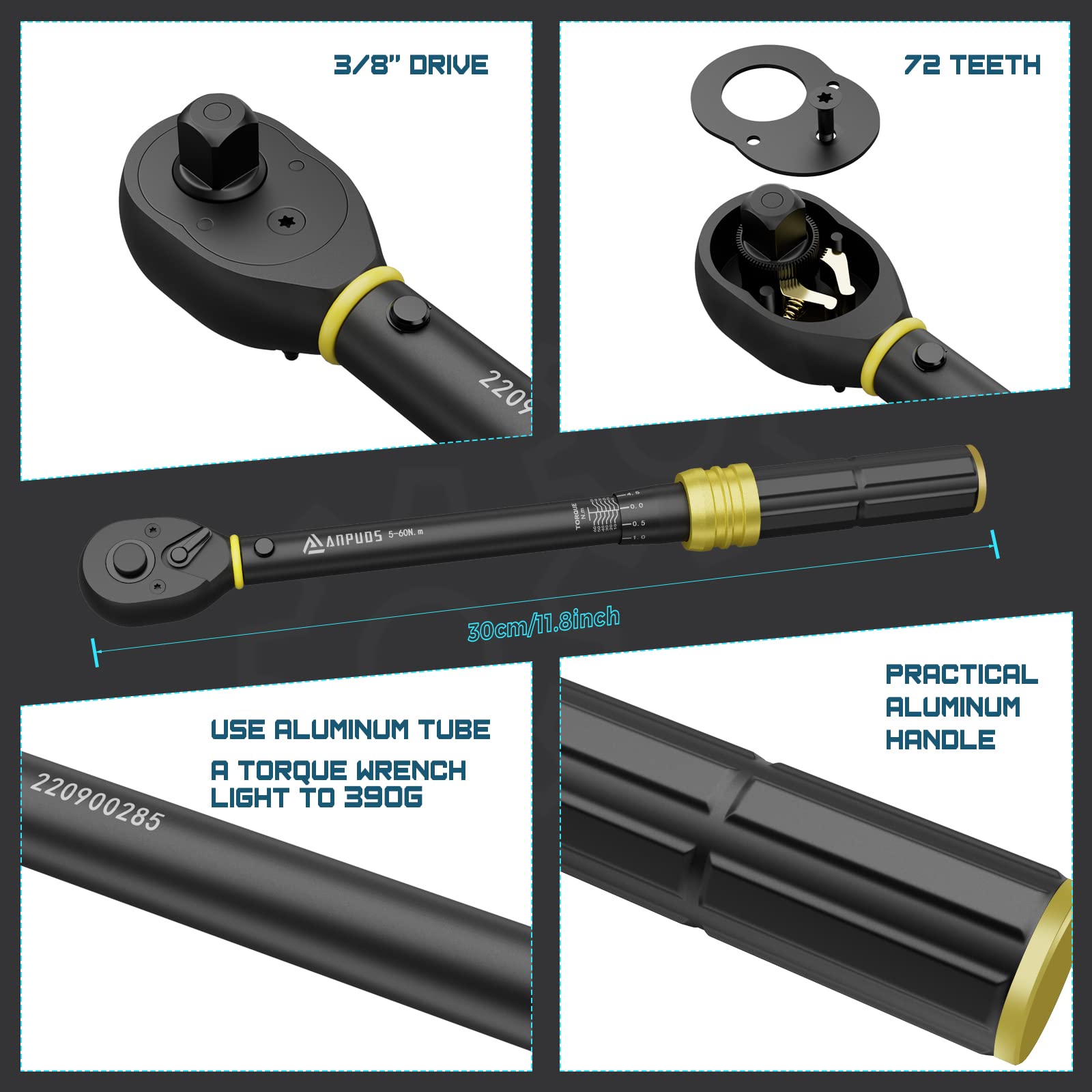 ANPUDS 3/8 Inch 5-60Nm Torque Wrench, ±3% Accuracy with 72 Teeth Reversible Ratchet Head Portable Storage Box for bike, Motorcycle, and Car Spark plug Replacement