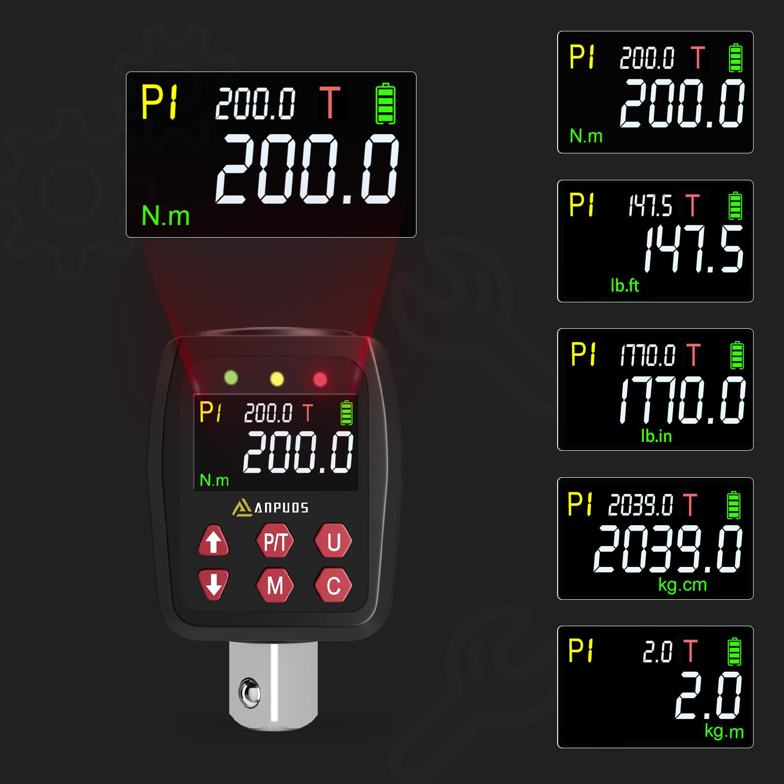 ["【±1% Accuracy】The Digital Torque Adapter with 1/2-inch drive is in the torque range of 10-200 Nm. It can be measured in both directions, clockwise and counterclockwise, with an accuracy of ±1% each. It meets industrial requirements and exceeds the accuracy of most digital torque adapters on the market.","【Pre-set Value and Data Storage】The Digital Torque Adapter has a pre-set mode and 500 sets of data storage functions. You can pre-set and save torque values in 10 groups from P0 to P9. Pre-set values and data storage allow you to quickly access frequently repeated applications.","【Four Measurement and Peak/Track Modes】This Digital Torque Adapter features a large, advanced LCD screen that provides four measurement modes in ft-lb, Nm, in-lb, and kg-cm. It can easily switch between Peak mode and Track mode. The PEAK mode can record the maximum torque value. The TRACK mode can display the torque value in real-time.","【Audible and LED Flash Notification Alarm】When approaching the target torque with the Digital Torque Adapter, the buzzer emits a regular beep and the LED indicator light changes from a flashing green light to a solid red light to remind you to stop applying force. Warm Tips: If the buzzer does not sound, simultaneously press the P/T and M buttons in the off state to re-enable it.","【Multifunctional Conversion】This Digital Torque Adapter can convert any ratchet wrench into a precise digital torque wrench. It weighs only 200g and is 7.5 x 4.5 cm in size. Lightweight and palm-sized, easy to operate, store, and transport. Easy to use, more accurate and convenient than a mechanical wrench.","【Flexible Audible Tone On/Off】When simultaneously pressing the P/T and M buttons in the off state and hearing a sound, the buzzer is opened. If you hear two beeps, the buzzer is closed. You can turn the buzzer on or off as needed."]