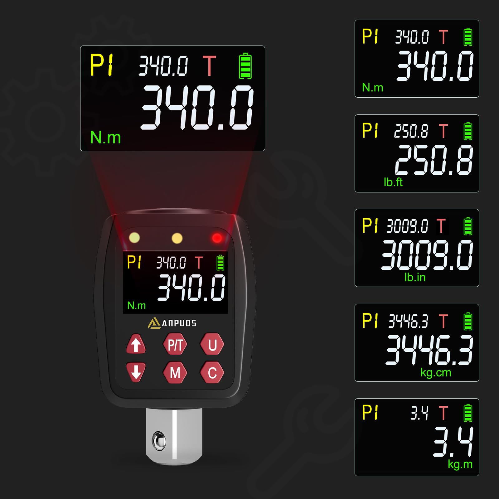 ["【±1% Accuracy】 The Digital Torque Adapter with 1/2-Inch Drive operates in the torque range of 17–340 Nm. It can measure in both directions, clockwise and counterclockwise, with an accuracy of ±1% each. It meets industrial requirements and exceeds the accuracy of most Digital Torque Adapters on the market.","【Pre-set Value and Data Storage】 The Digital Torque Adapter features a pre-set mode and 500 sets of data storage functions. You can pre-set and save torque values in 10 groups from P0 to P9. Pre-set values and data storage allow you to quickly access frequently repeated applications.","【Four Measurement and Tracking/Peak Modes】 This Digital Torque Adapter has a large, advanced LCD screen that offers four measurement modes in ft-lb, Nm, in-lb, and kg-cm. It can easily switch between Peak mode and Track mode. The PEAK mode can record the maximum torque value. The TRACK mode can display the torque value in real-time.","【Audible and LED Flash Notification Alarm】 As you approach the target torque with the electronic torque adapter, the audible alarm will emit a regular beep and the LED indicator light will switch from a flashing green light to a solid red light, reminding you to stop applying force. Quick Tip: If the alarm does not sound, simultaneously press the P/T and M buttons while the device is turned off to activate it again.","【Multifunctional Conversion】 This Digital Torque Adapter can convert any ratchet wrench into a precise digital torque wrench. It weighs only 200g and is 7.5 x 4.5 cm in size. Lightweight and palm-sized, easy to use, store, and transport. Simple to use, more accurate, and convenient than a mechanical torque wrench.","【Flexible Audible Alert On/Off】 While the device is turned off, simultaneously press the P/T and M buttons and listen for a tone to open the audible alert. If you hear two tones, the alert is closed. You can turn the alert on or off as needed."]