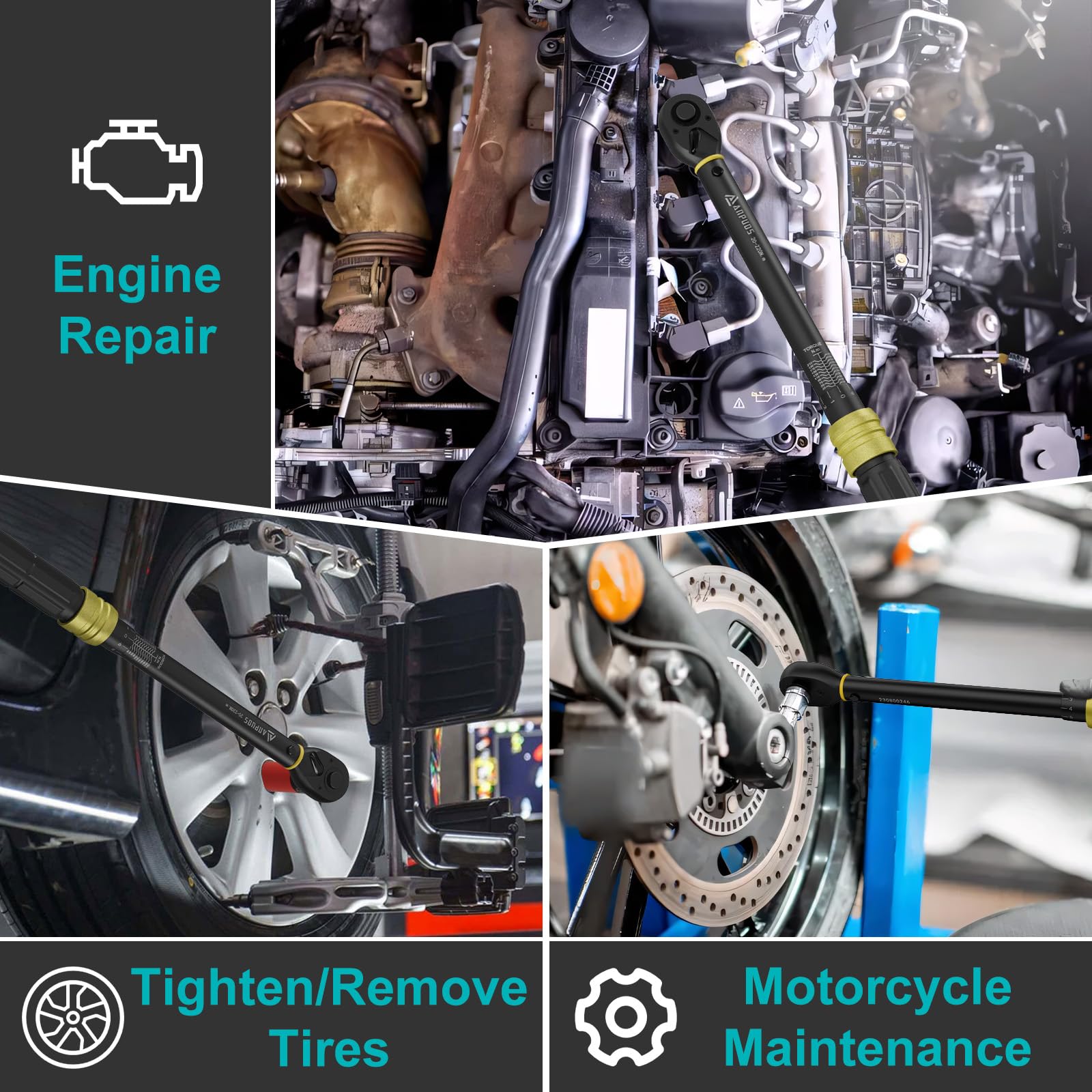 ANPUDS Torque Wrench 1/2", 20-220Nm Automotive & Motorcycle Torque Wrench 6-pc. Set with 125mm Extension Bar, 1/2"-3/8" Adapter, 3 Sockets 17mm 19mm 21mm, for Tire Replacement.