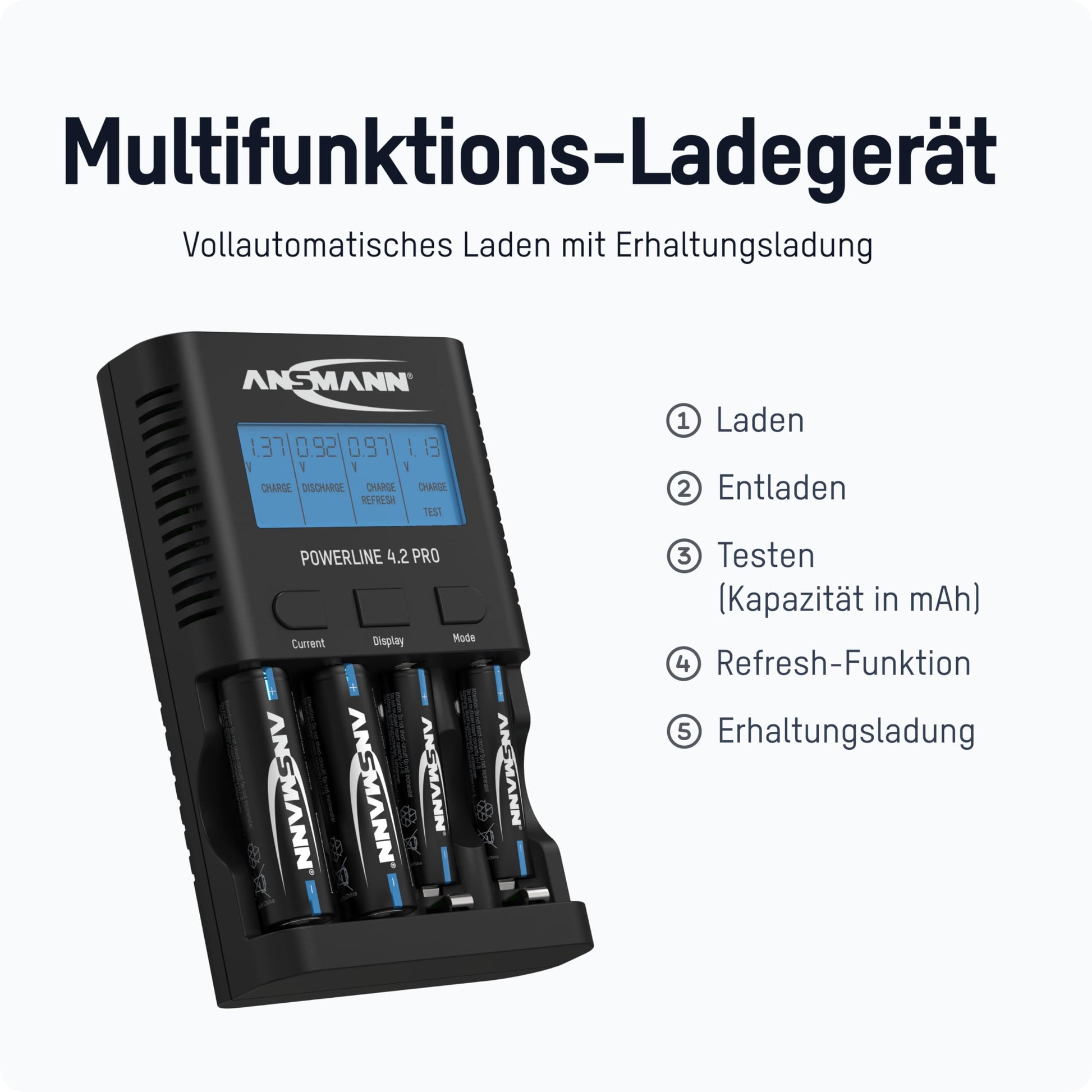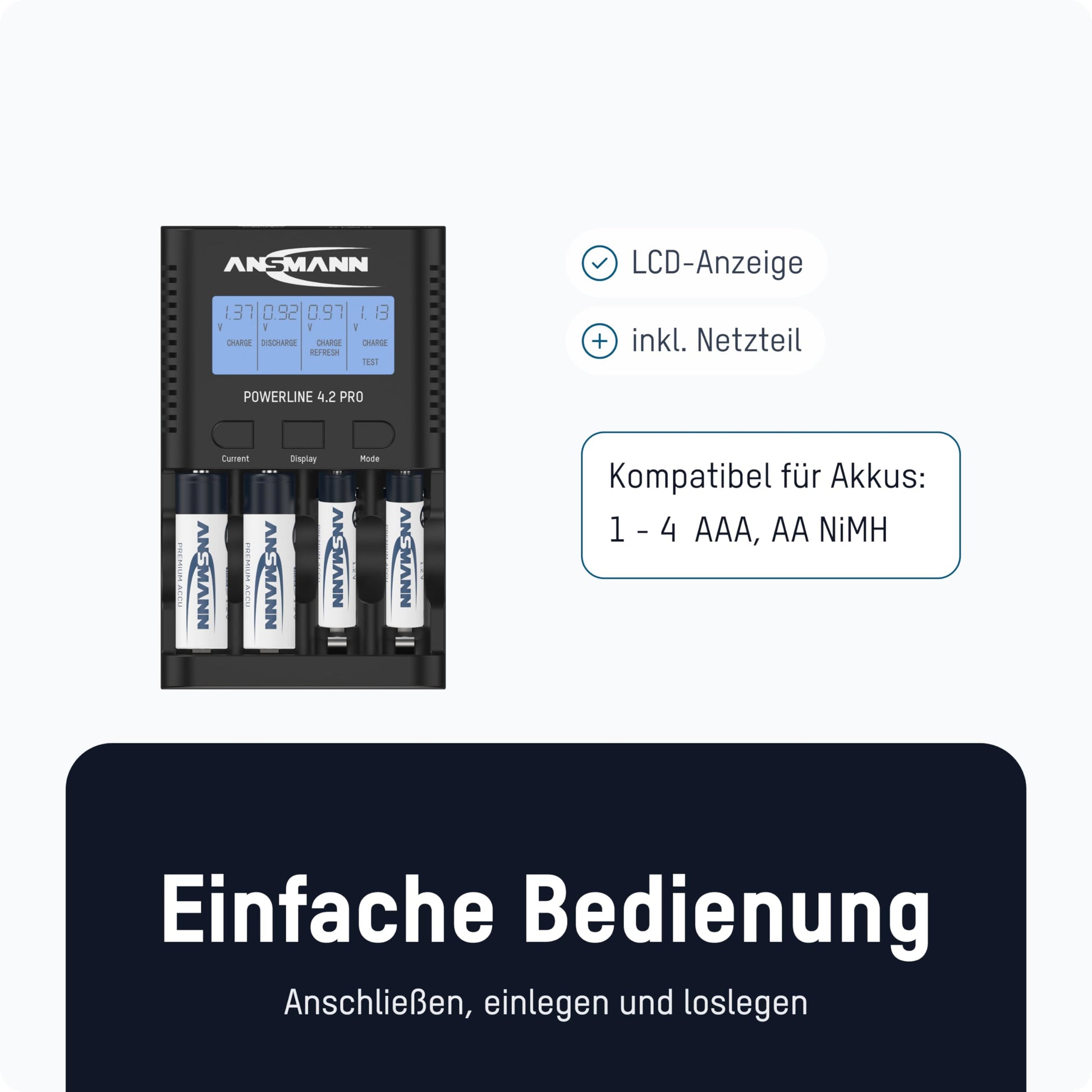 Delivery contents: Includes 1x ANSMANN battery charger Powerline 4.2 Pro, 1x power supply, and a user manual. Perfect for home use or on the go thanks to its compact design."