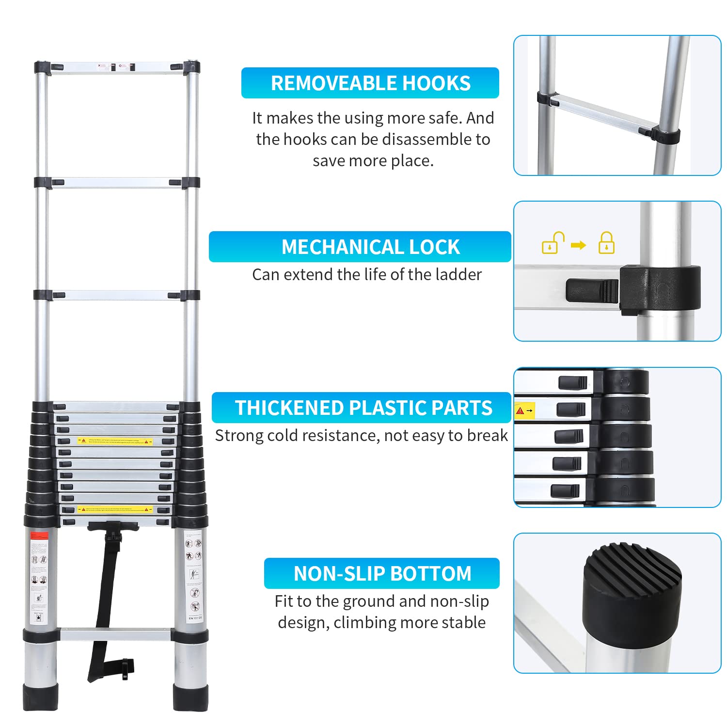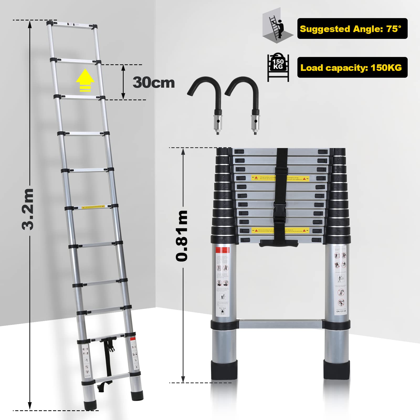 ["Telescopic ladder design, extendable up to 3.2m and retractable to 0.81m for easy transport. Features 11 steps with a maximum load of 150kg.","High safety with non-slip rubber feet, rubber padding between steps, and finger safety settings to prevent accidents. Made of corrosion-resistant aluminum alloy, weighing approximately 8.2kg.","Easy to carry with extendable design, suitable for various tasks indoors and outdoors such as home maintenance, painting, tree trimming, repairs, window cleaning, construction work, and architectural applications."]