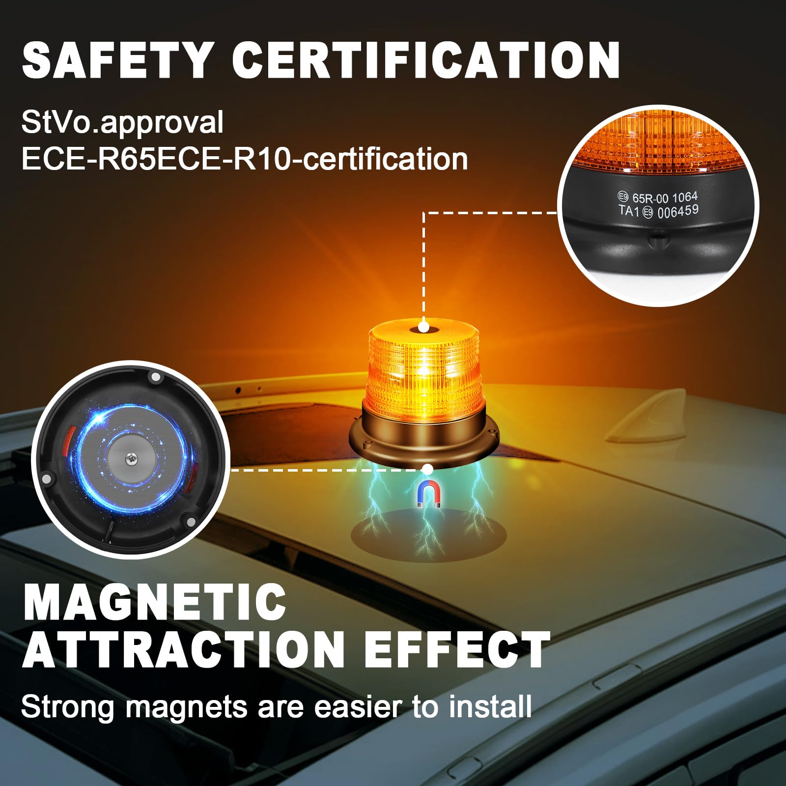 ["60 LED High-Brightness Beacon Light: This beacon light is equipped with 60 high-brightness LED chips and provides an ultra-bright 360-degree coverage. It operates at a voltage of 10-30V and has a lifespan of over 50,000 hours to attract attention with optimal brightness and striking illumination.","Ultra-bright with 10 Different Modes: The 12v LED beacon light includes 10 different flashing and rotating modes, offering a complete 360-degree flashing coverage, as well as a mode that can be used as a steady light. It features a convenient dual-switch design (3 meters cable), with the first switch for turning the light on and off, and the second switch allowing to switch between 9 different flashing warning modes with a memory function for the last mode used.","Superior Quality: The AnTom LED warning light features a durable ABS material base and a high-transparency, scratch-resistant PC lens. It is clearly visible both during the day and at night. With an IP68 waterproof rating, it can withstand snow and other harsh weather conditions. The larger size ensures ample brightness: 5 inches (W) x 4 inches (D) x 3.7 inches (H).","Easy Installation - Two Methods: The base of the LED beacon light is equipped with a powerful round magnet, allowing for easy installation on the metal roof of any vehicle (tested in the lab to withstand speeds of up to 120 mph without falling off), or it can be secured with screws.","Wide Compatibility: The road safety light is suitable for multipurpose vehicles and is ideal for law enforcement, emergency, utility vehicles, forklifts, construction trailers, trailers, postal services, snowplows, rescue vehicles, tractors, garbage trucks, street sweepers, road maintenance/city service vehicles, golf carts, school buses, ATVs, UTV safety vehicles, and more."]