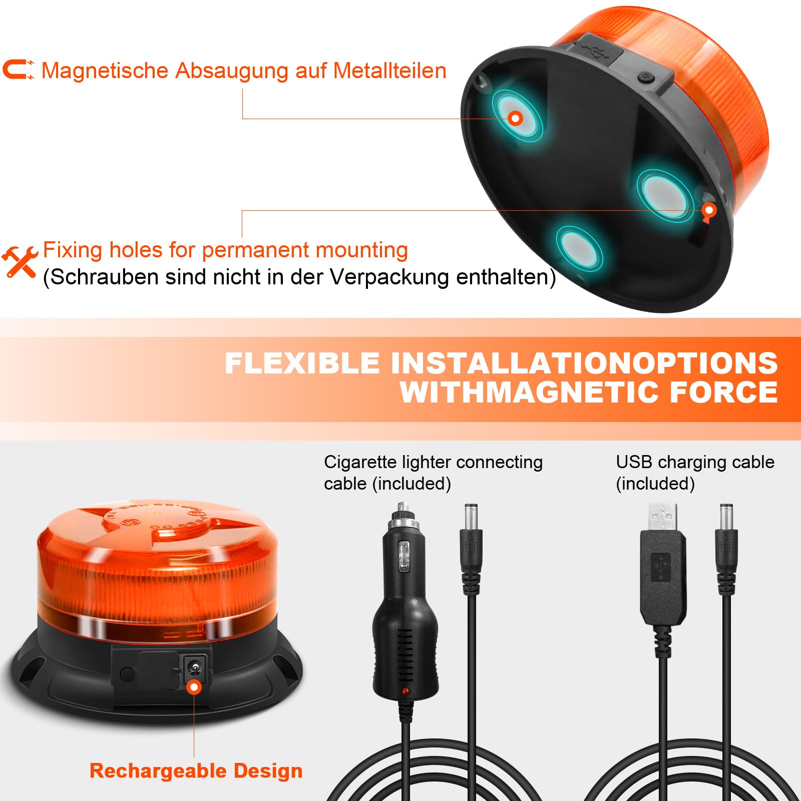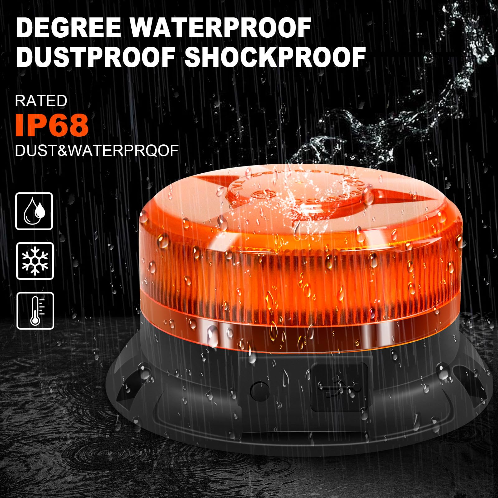["【High Brightness LED Beacon Light】The LED beacon light has 24 High Brightness LED Chips, providing 360-degree super bright coverage and can operate at 10-30V, with a lifespan of over 50,000 hours. Designed to attract attention with optimal brightness and eye-catching illumination.","【Super Bright 9 Different Modes】LED beacon light includes 8 different strobe and rotating modes with full 360-degree flash coverage, as well as a steady mode for use as a light. Convenient dual switch design, first switch turns it on/off, second switch toggles between 9 different flashing warning modes with memory function for last used mode.","【Superior Quality】AnTom LED warning lights are made of durable ABS base and PC scratch-resistant lens with high light transmission. Clearly visible day and night. IP68 waterproof rating to withstand snow and other harsh weather conditions. Improved dimensions for easy storage: 5 inches (L) x 5 inches (W) x 1.8 inches (H).","【Easy to Install - Two Options】With three circular strong magnets on the bottom, this LED beacon light can easily be mounted on the metal roof of any vehicle (tested in lab up to 120 mph without falling off) or screwed in place. The wireless LED beacon light is supplied with both a car charging cable and a USB charging cable.","【Widely Compatible】Road safety markers for multipurpose vehicles - great for law enforcement, first aid situations, emergency vehicles, forklifts, construction trailers, tow trucks, postal services, snow plows, recovery vehicles, tractors, garbage trucks, street sweepers, road maintenance/city service vehicles, golf carts, school buses, ATVs, UTV safety vehicles, and more."]