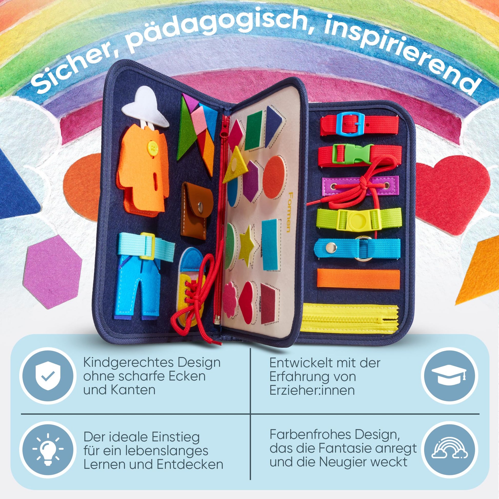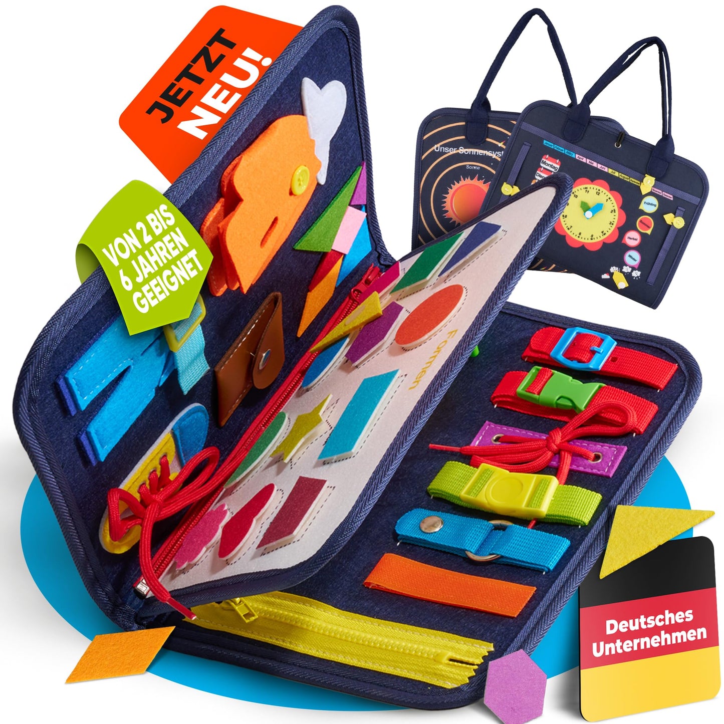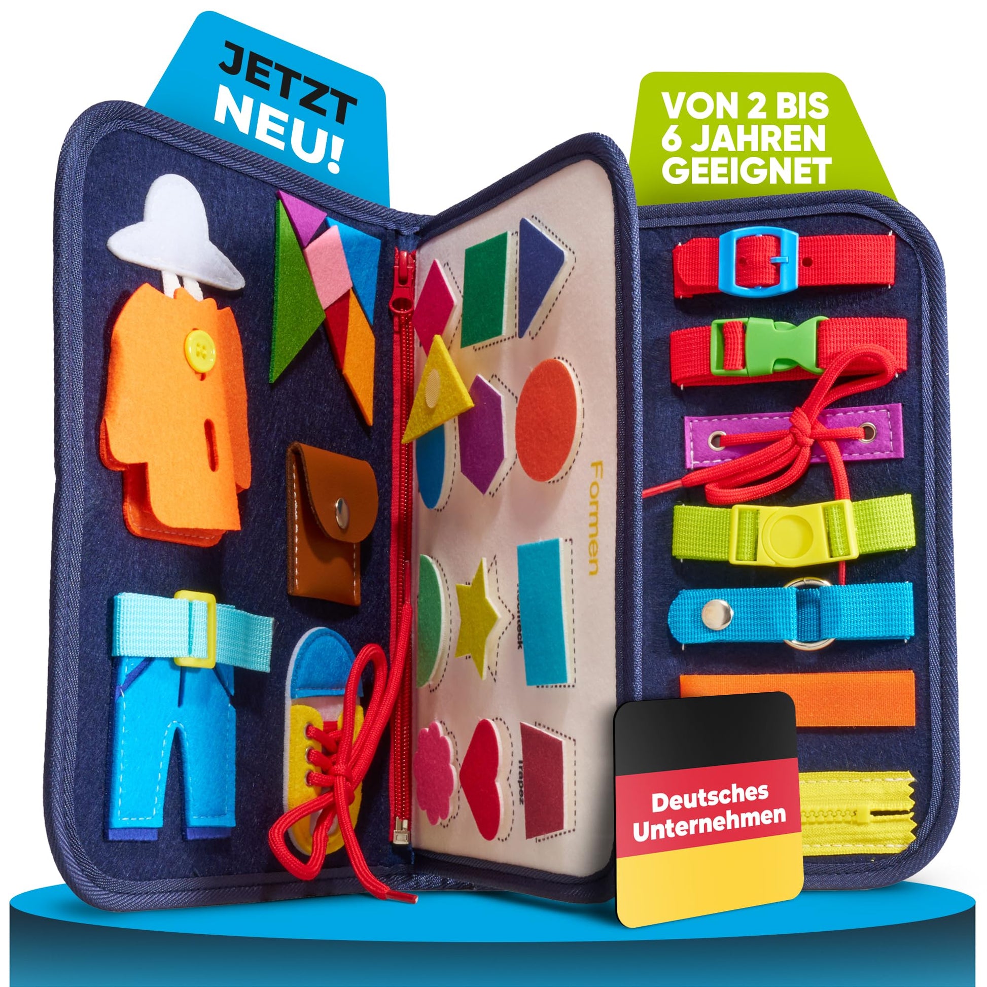 ["🖼️ DEUTSCHSPRACHIGES PRODUKT- Specifically designed for the German-speaking market using German numbers, animals, shapes, weekdays, seasons, and stars to best promote your child.","🧩 SPIELERISCHES LERNEN - Develops your child's fine motor skills and promotes playful learning through moving parts, opening and closing zippers, playing with animals, numbers, shapes, and colors.","🧳 ENTSPANNT REISEN - Versatile for use in the car, train, or outdoors. You also want to finally travel relaxed and with a clear conscience. With our Busy Board, you are guaranteed a long-lasting engaging activity for your child without the hassle of screen time.","🎨 VIBRANT MATCHING DESIGN - We impress with a lively design that magically attracts children, arouses their curiosity, and promotes their perception at the same time.","🧭 ENDLESS FUN FOR BUSY BOARDS - Developed by parents, perfected with the expertise of educators, it grows with your child and offers ever new levels of learning with age-appropriate themes.","🔮 INVEST IN YOUR CHILD'S FUTURE and invest in the future of your child --> Order now!"]