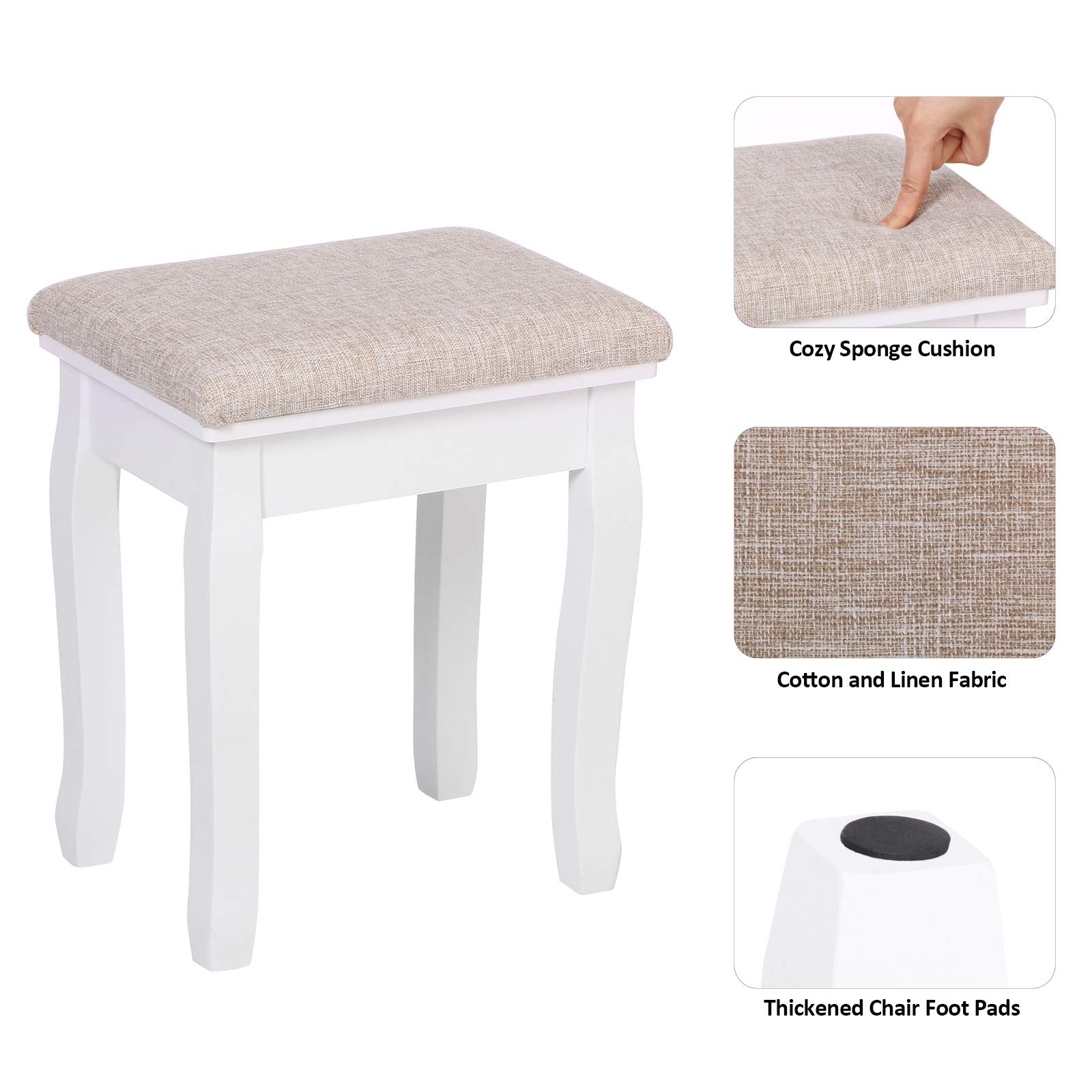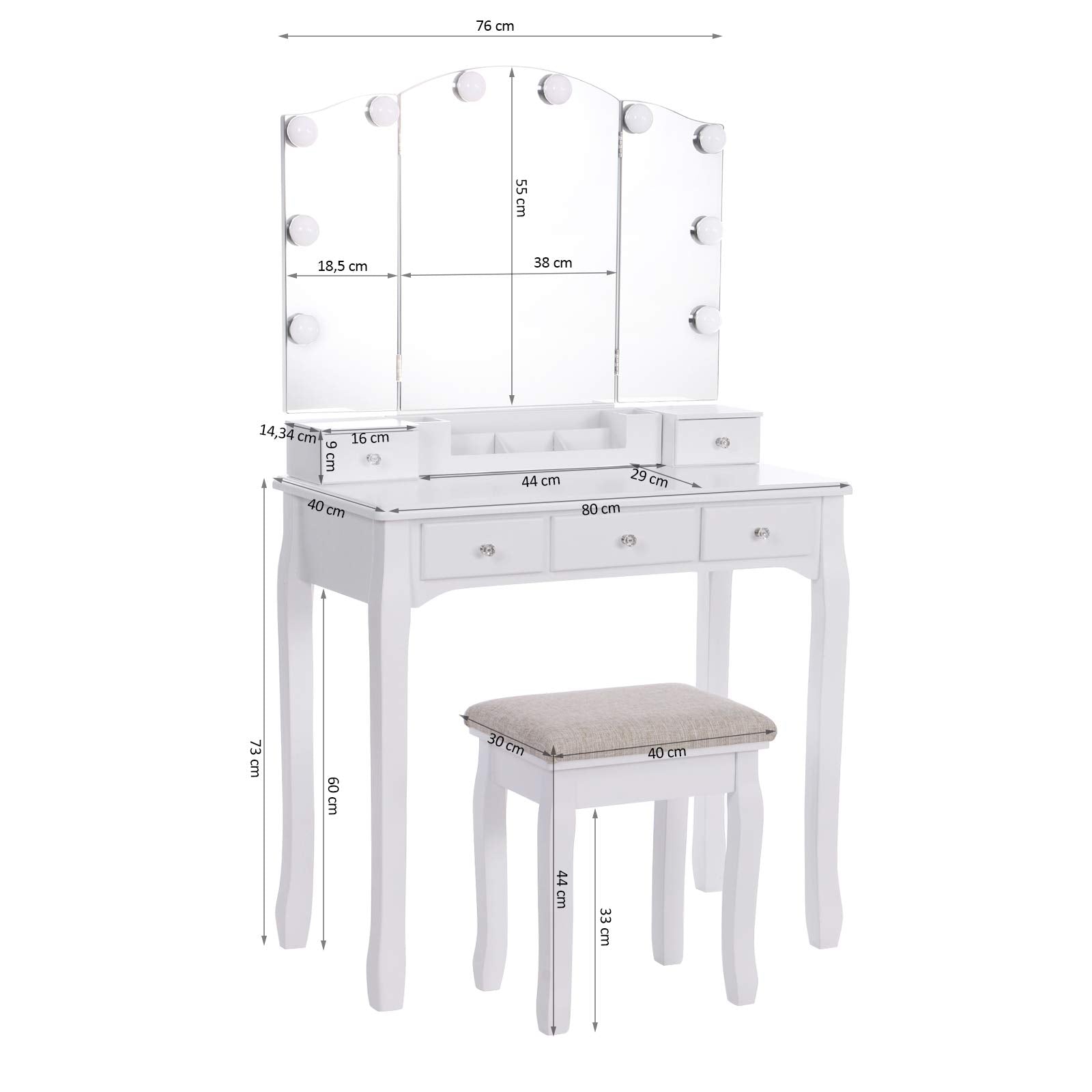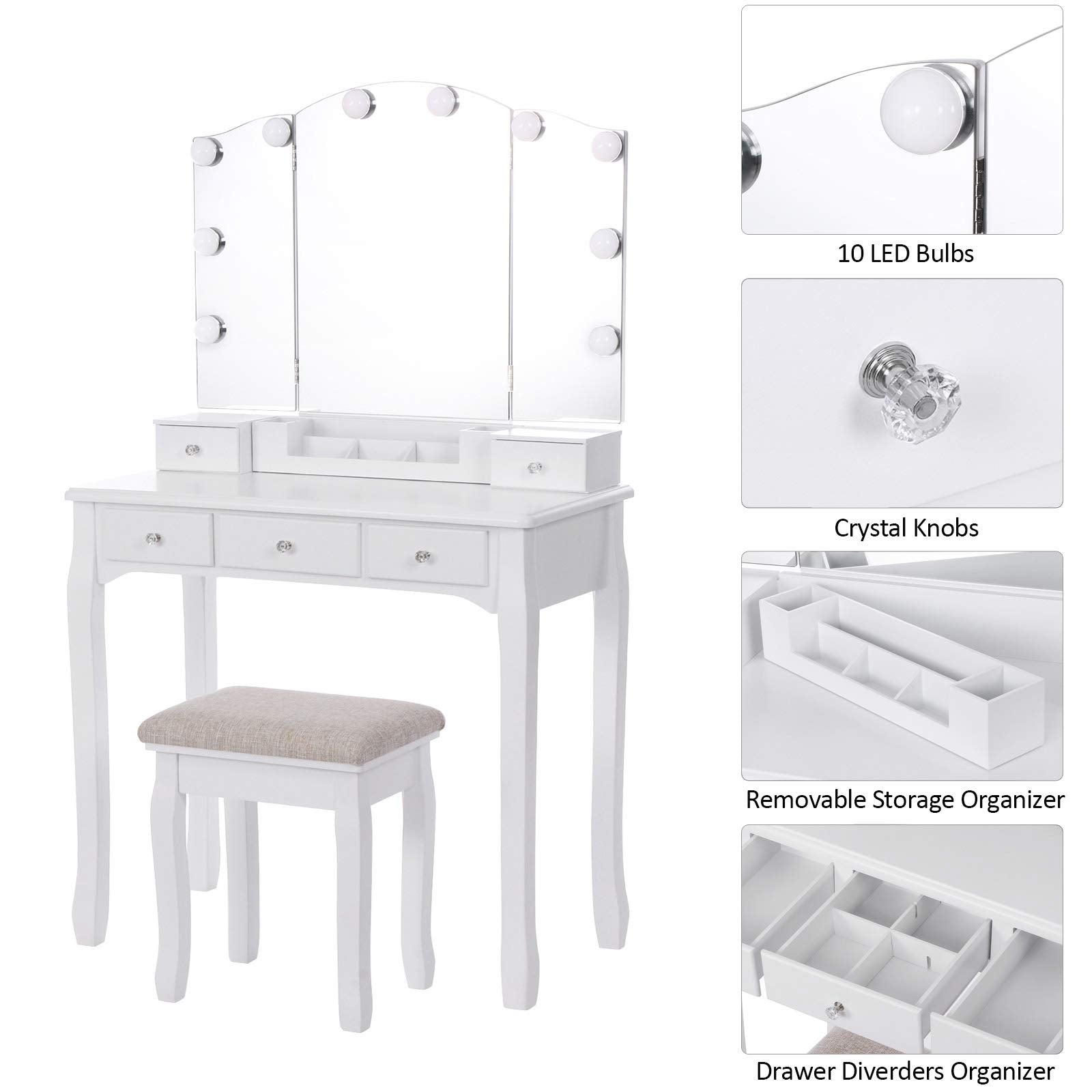 ["【Tri-Fold Mirror with 10 LED Bulbs】This vanity desk features a LED-lit vanity mirror of perfect size, adjustable brightness. 10 LED dimmable bulbs provide sufficient and adjustable brightness for your beauty station, making for easy and flawless makeup application and care. With the tilt functionality, it will help to get a better angle and make self-viewing easy. LED lights also protect your eyes", "【Elegant & Functional Design】Simple and elegant design with Large Tri-Folding Frameless Mirror, crystal knob, and wooden legs, this dressing vanity table and stool set can be a functional and sturdy piece of furniture for your bedroom, bathroom, closet, or hallway. Padded seat provides a comfortable place to do your makeup and hair. This makeup desk set will be an ideal gift option for your girl on Valentine's Day, Mother's Day, or Christmas", "【Ample Storage Space & Removable Top for Desk】5 multiple drawers, large desktop, 2 DIY dividers, and removable organizer provide this vanity set with enough space to store your makeup, daily jewelry, perfume collection, lotions, brushes, hair accessories, and other beauty essentials; with the removal of the mirror top, the vanity table could be used as a desk for a laptop or a work/study desk", "【Top Quality Material】The vanity table is made of sturdy MDF, solid wood table and bench legs, premium shockproof slide, foam with 100% polyester seat cover, EVA anti-slip mats. Overall dimension: 80 x 40 x 140 cm (L x W x H)", "【Easy to Assemble】The main part of the vanity table set is pre-assembled. You just need to do a partial installation. Simple assembly is required by attaching the legs to the stool and table, as well as mounting and securing the mirror. All parts, detailed instructions, and an easy kit are included in this vanity makeup table set"]